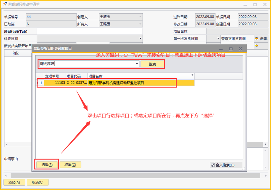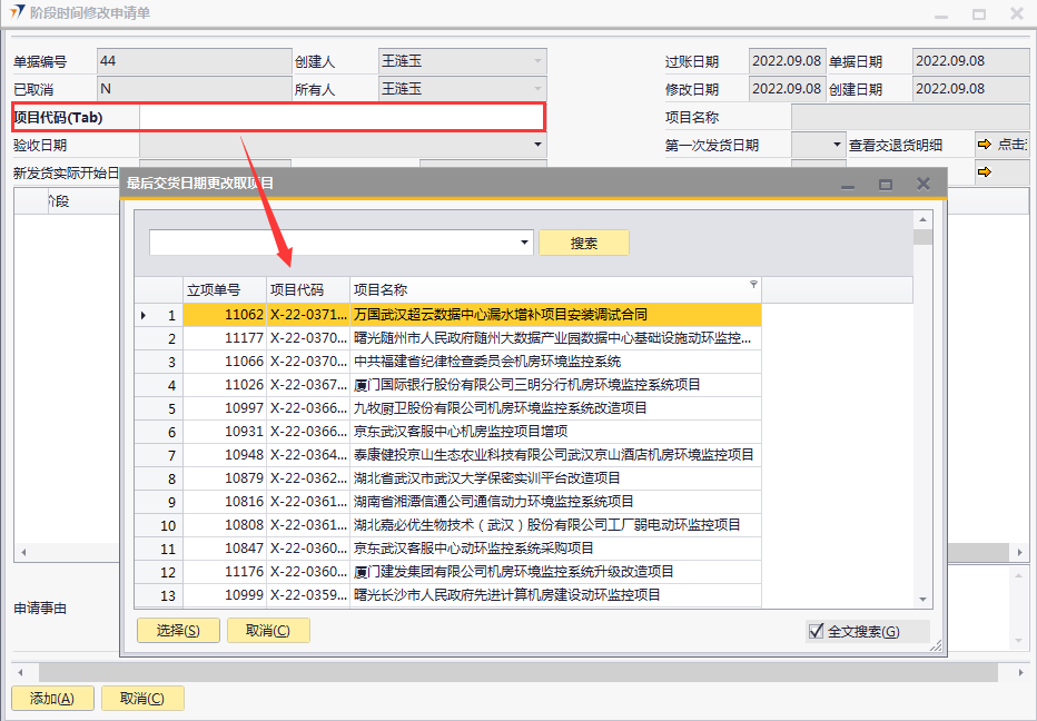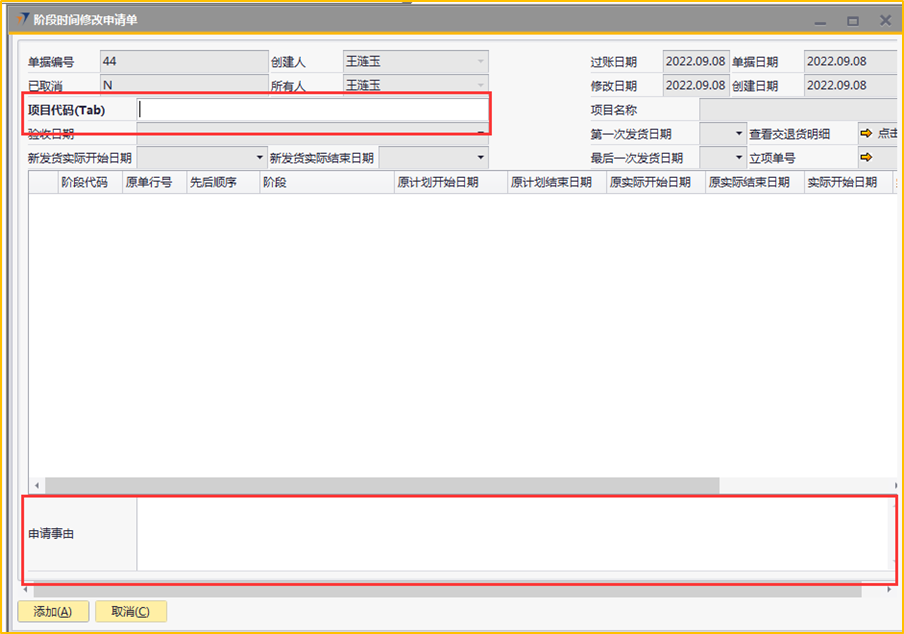 # 1 目的与作用 为了指导和规范工程人员、客服人员阶段时间修改申请操作,提升效率,规范管理 # 2 界面介绍 路径:工程项目管理 → 阶段时间修改申请单  # 3 操作说明 ## 3.1 表单  说明: * + **项目代码:**必填,按Tab选择,要修改阶段时间的项目 + **项目名称、第一次发货日期、最后一次发货日期、立项单号:**选择项目代码后,系统默认自动带出,不能录入也不能修改 + **申请事由:**必填,申请更改最后交货日期的原因 + **验收日期、新发货实际开始日期、新发货实际结束日期**,这些字段已关闭不启用 ## 3.2 操作说明 鼠标定位到项目代码(Tab),再按Tab键,会调取出来当前账号权限范围内所有可更修改阶段时间的项目  关键字搜索或直接鼠标滚动查找本次要更新的项目,双击或左下方选择,选择项目  系统会出来该项目【工程立项】单中所有阶段、原计划开始日期、原计划结束日期、原实际开始日期、原实际结束日期 实际开始日期、实际结束日期:默认跟原实际开始日期、原实际结束日期一致,为可以修改的时间,需要修改哪个阶段的原实际开始日期、原实际结束日期,就找到该阶段,在“实际开始日期”、“实际结束日期”录入实际完成时间  修改实际开始日期、实际结束日期为正确的日期,点左下方“添加”  单据添加后,实际开始日期、实际结束日期,数据会回写到对应的工程立项单 # 4 注意事项 无