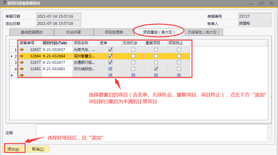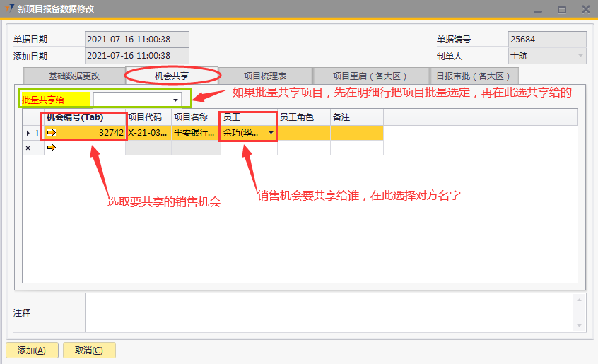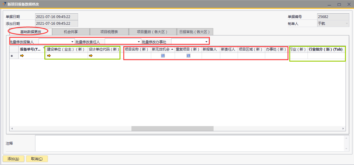 # 1 目的与作用 为了指导和规范销售人员新项目报备数据修改,规范管理 # 2 界面介绍 路径:销售机会管理 → 新项目报备数据修改  # 3 操作说明 ## 3.1 表头  说明: * + **单据日期、添加日期、单据编号、制单人**系统默认并自动带出 ## 3.2 表体 ## 基础数据更改  说明: * + 此页签用来修改新项目报备部分信息,按Tab选择要修改的新项目报备单,录入要修改的内容,左下方添加后,修改的内容会自动更新到对应的新项目报备单 + 如果报备时建设单位**为空**或设计单位**为空**,可修改成不为空 + 如果该报备项目没有后续单据,可修改**项目名称** + 行业、行业细分修改功能暂时**只对**营销中心助理开放,其他人无权操作 + **无效机会、重复项目、新报备人、新责任人、新项目区域、新办事处**:未做限制,业务实际情况需要修改时,可随时修改 + **批量修改报备人、批量修改责任人、批量修改办事处:**用来修改批量数据,操作时**先**选出要修改的批量数据,**再**选批量修改报备人、批量修改责任人、批量修改办事处,系统会自动填充到批量数据行里 + 基础数据如有修改并添加为正式单据后,修改的内容会自动更新到新项目报备单对应栏位 ## 3.2.1 机会共享  说明: * + 此页签用来共享新项目报备,按Tab选择要共享的新项目报备单,录入共享人员的名字,左下方添加后,新项目报备会自动共享到对方 + **批量共享给:**如果批量共享项目给同一人,操作时**先**选出要共享的批量数据,**再**选批量共享给,系统会自动填充到批量数据行里 ## 3.2.2 项目梳理表  说明: * + 此页签用来梳理新项目报备部分信息,按Tab选择要修改的新项目报备单,录入要梳理的内容,左下方添加后,梳理的内容会自动更新到对应的新项目报备单 + **可梳理的字段:**项目主产品、项目进度(新)、项目把握分类(新)、预计签单金额(新)、预计签单日期(新)、预计投标日期(新)、备注(新) ## 3.2.3 项目重启(行业总监权限)  说明: * + 项目重启功能只提供给行业总监使用 + 按Tab选择要重启的新项目报备(含丢单、无效机会、重复项目、项目终止),添加生成正式单据后,项目即刻重启为状态为“未清”的正常项目 ## 3.2.4 日报审批(行业总监权限)  说明: * + 日报审批功能只提供给行业总监使用 + 按Tab选择要审批的日报,添加生成正式单据后,对应日报即刻审批完成