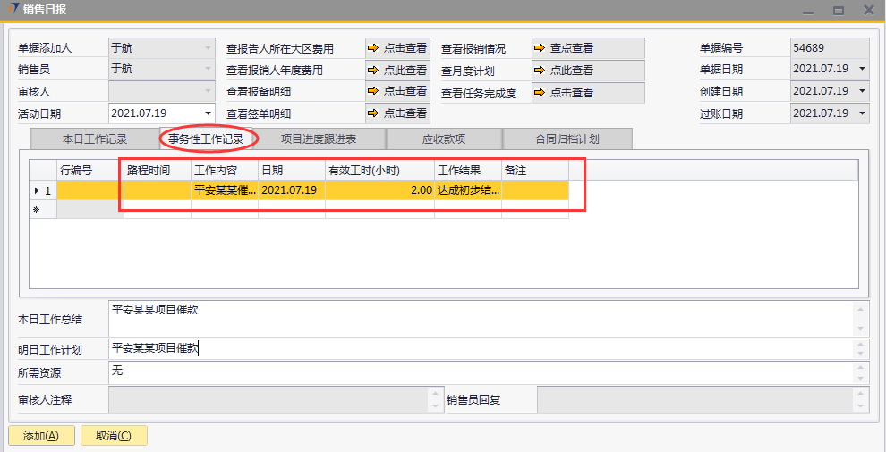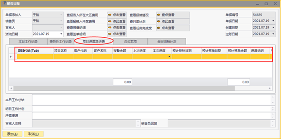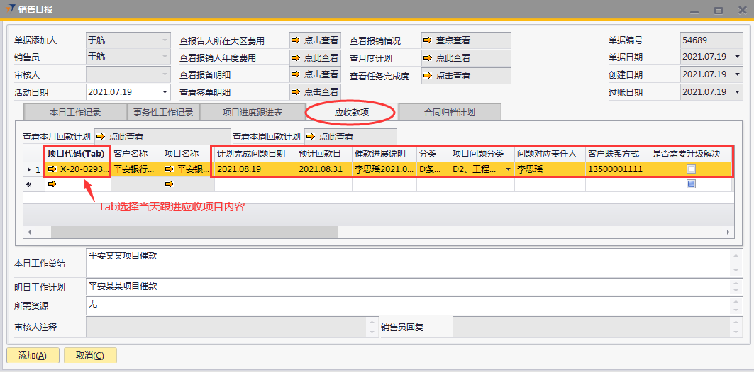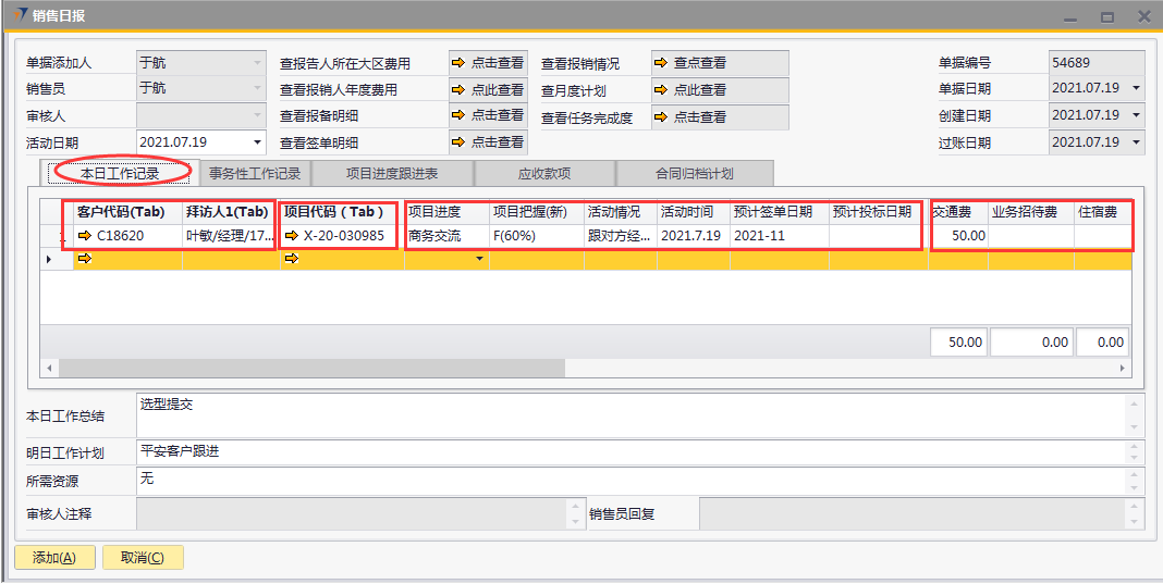 # 1 目的与作用 为了指导和规范销售人员销售日报填写,规范管理 # 2 界面介绍 路径:销售机会管理 → 销售日报  # 3 操作说明 ## 3.1 表头  说明: * + **活动日期:**必填,Tab选择,销售活动日期,可以是当天,也可以是前一天,同一活动日期只允许录入一张销售日报 。 + **审核人:**新建时为空,销售日报添加为正式单据后此字段会变白变亮 + **本日工作总结:**必填,当天的工作总结 + **明日工作计划:**非必填,明天的工作行程和计划 + **所需资源:**必填,跟进项目所需资源 + **单据添加人、销售员、单据编号、单据日期、创建日期、过账日期**系统默认自动带出 ## 3.2 表体 ### 3.2.1 本日工作记录(跟自定义费用报销关联)  说明: * + **客户代码:**必填,Tab选择拜访的客户代码 + **拜访人:**必填,Tab选择拜访的客户信息 + **项目代码:**如果是系统已经报备且已生成项目编号的项目,Tab选择;如果是还未在系统报备项目的,不录入。注意,先录入客户代码,才能选到对应报备的项目编号 + **项目进度:**必填,项目目前进度,销售日报中项目进度会自动回写到新项目报备 + **项目把握:**必填,项目目前把握程度,销售日报中项目把握会自动回写到新项目报备 + **活动情况:**必填,当天销售活动情况 + **活动时间:**必填,日报活动的时间 + **预计签单日期:**非必填,此字段目前不具回写功能 + **预计投标日期:**非必填,此字段目前不具回写功能 + **交通费:**如果产生交通费,录入 + **业务招待费:**如果产生业务招待费,录入 + **住宿费:**如果产生住宿费,录入 + **交通费、业务招待费、住宿费**金额会影响自定义报销金额,自定义费用报销中金额不可修改,所以销售日报的金额请务必按照发票金额准确无误录入 + 目前销售经理提交日报的主要作用有:汇报工作情况、关联自定义费用报销,所以一般只在**本日工作记录**页签中录入内容即可,其它页签可不用填写 ### 3.2.2 事务性工作记录  说明: * + **本日工作记录**、**事务性工作记录**必须满足有一个页签有明细内容,销售日报才能正常添加 + **事务性工作记录**跟自定义费用报销无关联 + 销售助理一般使用**事务性工作记录 + 应收款项**跟进应收 ### 3.2.3 项目进度跟进表  说明: * + 此页签内容功能暂停,可暂时不用录入 ### 3.2.4 应收款项(跟进应收使用)  说明: * + **项目代码:**必填,Tab选择当天跟进收款的项目内容 + **计划完成问题日期:**录入计划完成问题日期 + **预计回款日:**录入项目预计回款日期 + **催款进展说明:**录入当天催款进展说明 + **分类:**录入项目目前分类 + **项目问题分类:**录入项目目前问题分类 + **问题对应责任人:**录入项目问题对应的责任人 + **客户联系方式:**录入客户联系方式 + **是否需要升级解决:**如果需要升级,打勾 + 销售日报添加后,**计划完成问题日期、项目问题分类、问题对应责任人、客户联系方式、是否需要升级解决**数据会自动回写到应收账款明细账 ### 3.2.5 合同归档计划  说明: * + 此页签内容功能暂停,可暂时不用录入