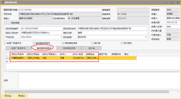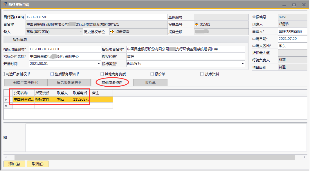 # 1 目的与作用 为了指导和规范销售人员商务资质申请提交,规范管理 # 2 界面介绍 路径:销售机会管理 → 商务资质申请  # 3 操作说明 ## 3.1 表头  说明: * + **项目代码:**必填,Tab选择,选择要申请商务资质的项目。可选择出来的项目逻辑为:项目报备状态为**未清**的报备项目,无效机会、重复项目、项目终止报备项目不能申请 + **招标项目编号:**必填,按实际填写招标项目编号 + **招标项目名称:**必填,按实际填写招标项目名称 + **招标公司名称:**必填,按实际填写招标公司名称 + **授权代表:**必填,按实际填写授权代表姓名 + **开标时间:**非必填,按实际录入开标时间 + **投标类型:**必填,有**配合投标**和**直接投标**,按实际情况选择 + **申请人:**必填,选择申请人 + **申请人区域:**必填,申请人所属区域 + **申请日期:**必填,申请商务资质的日期 + **制造厂家授权书、售后服务承诺书、其他商务资质、报价单**:必须勾选其中一个 + **项目名称、报备金额、创建人、行销负责人、项目级别**系统默认自动带出 ## 3.2 表体 如果表头勾选了**制造厂家授权书**,制造厂家授权书明细表必须有内容 如果表头勾选了**售后服务承诺书**,售后服务承诺书明细表必须有内容 如果表头勾选了**其他商务资质**,其他商务资质明细表必须有内容 如果表头勾选了**报价单**,报价单明细表必须有内容 ### 3.2.1 制造厂家授权书 如果表头勾选了制造厂家授权书,此明细表必须录入内容  说明: * + **投标公司名称:**必填,填写投标公司名称 + **投标公司地址:**必填,填写投标公司地址 + **投标公司联系人:**必填,填写投标公司联系人姓名 + **收件人:**必填,填写收件人姓名 + **收件人电话:**必填,填写收件人电话 + **邮寄地址:**必填,填写收件人地址 ### 3.2.2 售后服务承诺书 如果表头勾选了售后服务承诺书,此明细表必须录入内容  说明: * + **投标公司名称:**必填,填写投标公司名称 + **投标公司地址:**必填,填写投标公司地址 + **投标公司联系人:**必填,填写投标公司联系人姓名 + **收件人:**必填,填写收件人姓名 + **收件人电话:**必填,填写收件人电话 + **邮寄地址:**必填,填写收件人地址 ### 3.2.3 其他商务资质 如果表头勾选了其他商务资质,此明细表必须录入内容  说明: * + **公司名称:**必填,填写公司名称 + **所需资质:**必填,资质文件属性 + **联系人:**必填,填写相关联系人姓名 + **联系电话:**必填,填写相关人联系电话 ### 3.2.4 报价单 如果表头勾选了其他商务资质,此明细表必须录入内容  说明: * + **公司名称:**必填,填写公司名称 + **折扣率:**必填,填写本项目投标报价折扣率 + **折扣说明:**如果折扣率小于40%,必须填写折扣说明 + **联系人:**必填,填写相关联系人姓名 + **联系电话:**必填,填写相关人联系电话 + **投标金额:**必填,填写投标的金额