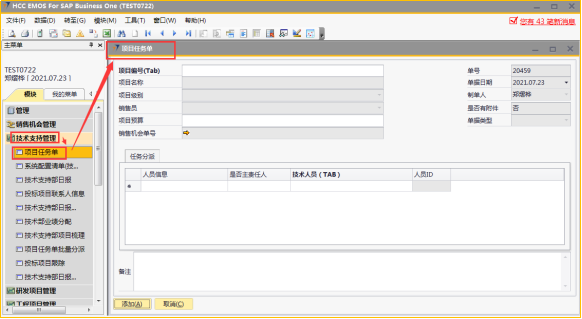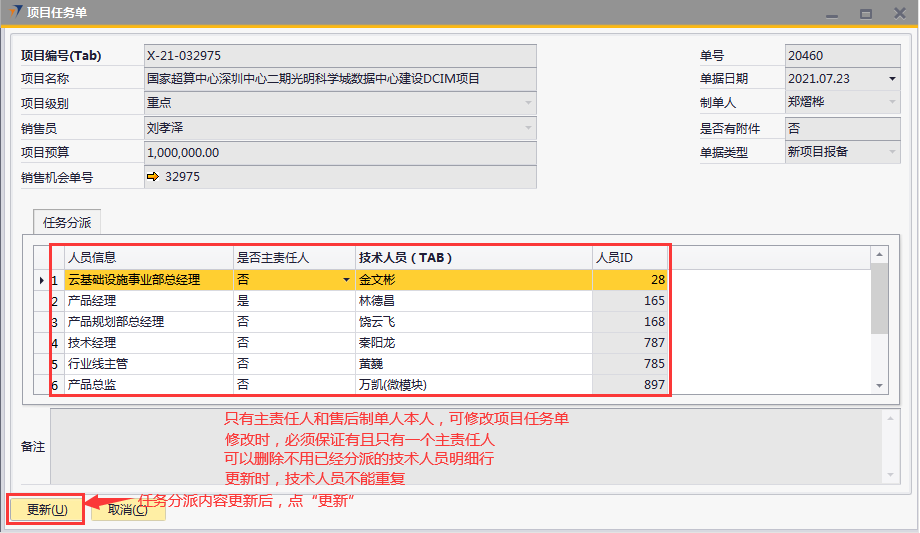 # 1 目的与作用 为了指导和规范行销人员项目任务单提交,规范管理 # 2 界面介绍 路径:技术支持管理 → 项目任务单  # 3 操作说明 ## 3.1 项目任务单新增 ### 3.1.1 表头  说明: * + **项目编号:**必填,Tab选择,选择要分配任务的项目(已经下过任务单的项目不允许再下任务单) + **项目预算:**项目编号自动带出,可修改 + **项目名称、项目级别、销售员**系统默认自动带出 ### 3.1.2 表体  说明: * + **技术人员:**必填,Tab选择,选择分配给哪些人,人员信息和ID会自动带出 + 只能由黄卫国、邓莉、黄巍、赵大为和售后人员分配任务单 + 项目任务单必须有一个主责任人 + 一个项目最多分配给6个行销人员 + 明细行技术人员不能重复 ## 3.2 项目任务单修改 已添加分配的项目任务单分配人员如果有变化,可以修改项目任务单 打开项目对应的项目任务单,直接更新任务分派明细行  说明: * + 只有主责任人和售后制单人本人,可修改项目任务单 + 行为亮白色的字段,都可以修改或者删除 + 修改时,必须保证有且只有一个主责任人 + 可以删除已经分派的技术人员明细行 + 更新时,技术人员不能重复