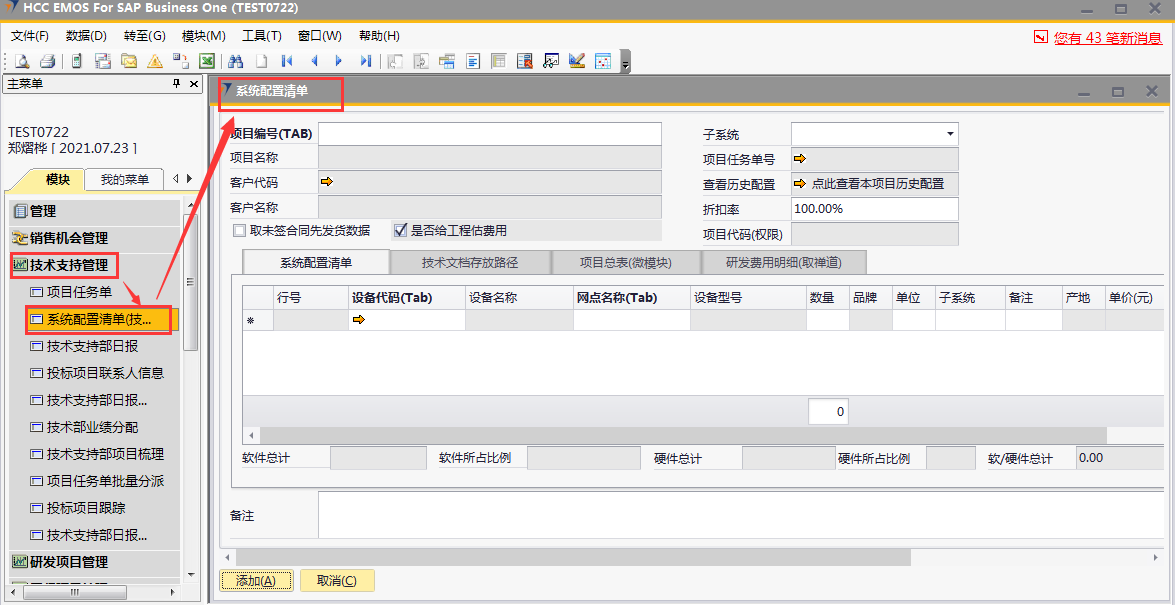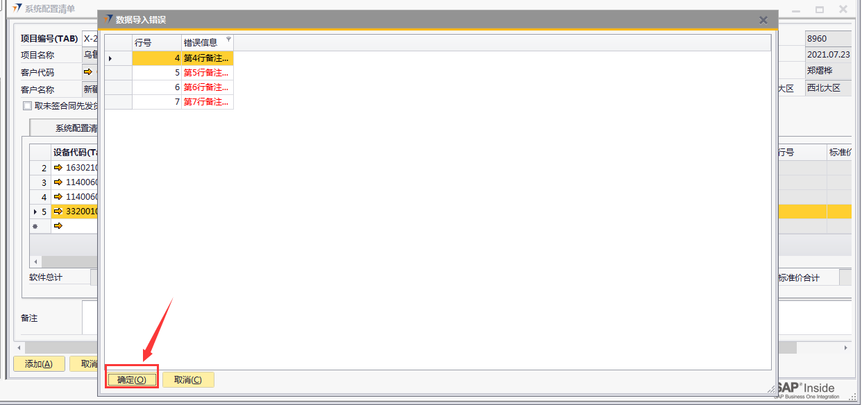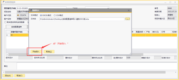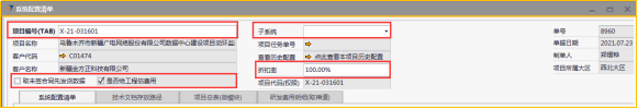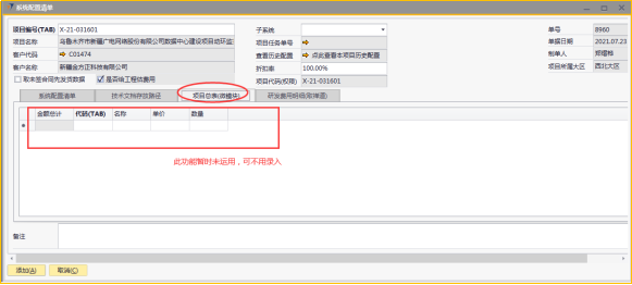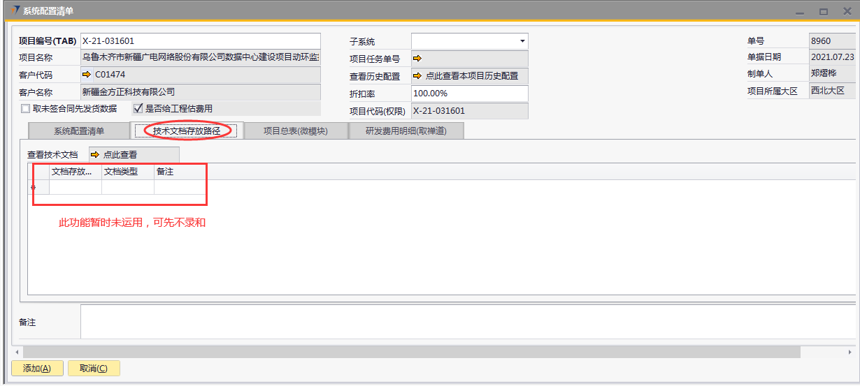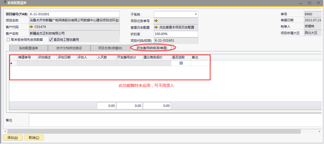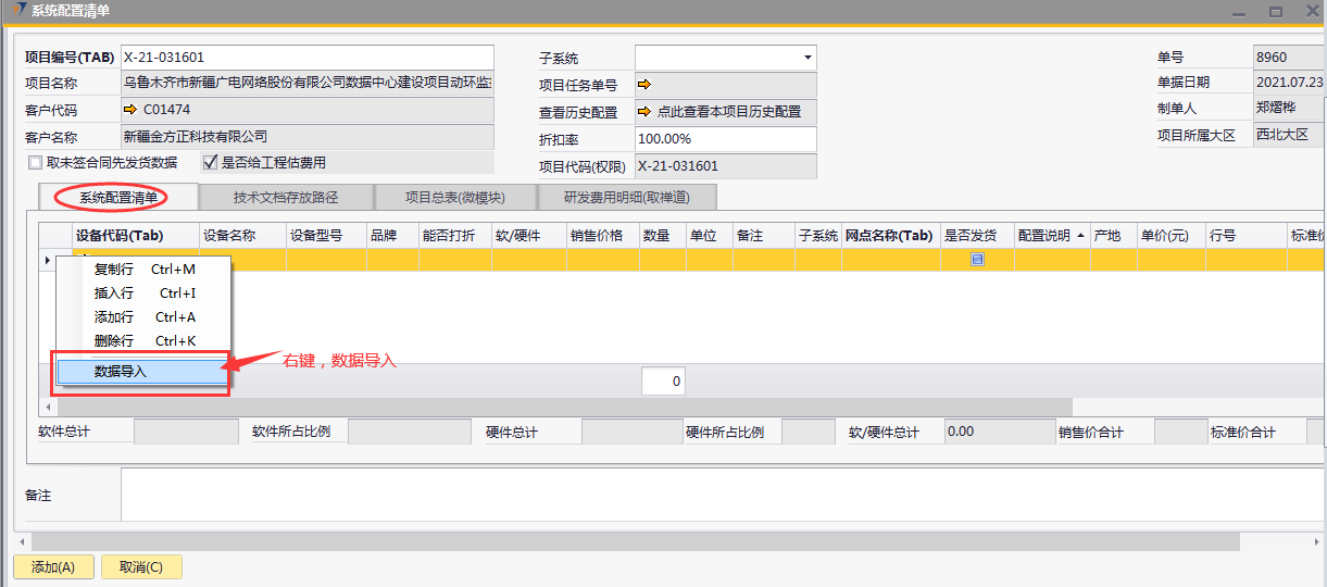 # 1 目的与作用 为了指导和规范技术支持人员系统配置清单录入,规范管理 # 2 界面介绍 路径:技术支持管理 → 系统配置清单(技术给销售)  # 3 操作说明 ## 3.1 表头  说明: * + **项目代码:**必填,Tab选择,选择要录入系统配置清单的项目。可选择出来已经报备且没有生成销售订单的项目 + **子系统:**非必填,选择项目所属子系统名称 + **折扣率:**跟项目代码自动带出,可修改 + **取未签合同先发货数据:**勾选后,表体系统配置清单Tab会取出未签合同先发货数据 + **是否给工程估费用:**勾选后,工程估算才能调取到该配置清单内容,不勾选工程估算调取不到 + **项目名称、客户代码、客户名称**系统默认自动带出 ## 3.2 表体 ### 3.2.1 系统配置清单 1. 手工录入  说明: * + 同一项目可以多次录入系统配置清单 + **设备代码:**必填,Tab选择。如果表头勾了**取未签合同先发货数据**,则出来未签合同先发货的设备;如果表头没勾**取未签合同先发货数据**,则出来所有未冻结且是技术支持物料的设备 + **销售价格:**必填,填写销售价格 + **数量:**必填,填写所需数量 + **是否发货:**必填,默认为打勾,如果不用发货则去掉打勾 + **子系统:**非必填 + **网点名称:**非必填,用于联网项目,录入联网项目网点明细 + **设备代码、设备名称、设备型号、品牌、能否打折、软/硬件、销售价格、数量、单位、备注、子系统、网点名称**会自动带到销售订单 + 设备代码、数量、是否发货,销售订单只能跟系统配置清单完全一致,所以录入时请一定要准确无误 2. 导入 导入模板 在导入模板录入数据,模板数据维护如下  系统配置清单明细表处,右键----数据导入  将弹出数据导入对话框,默认是EXCEL格式,如果导入文件是CSV格式,选CSV格式,并选择要导入的文件名,点“打开”  点“开始导入”  会看到如下界面,选“全部否定”  点“确定”  检查导入的数据,需要调整的调整,数据无误后,点“添加”提交  ### 3.2.2 技术文档存放路径  说明: * + 此功能暂时未运用,可不用录入 ### 3.2.3 项目总表(微模块)  说明: * + 此功能暂时未运用,可不用录入 ### 3.2.4 研发费用明细(取禅道)