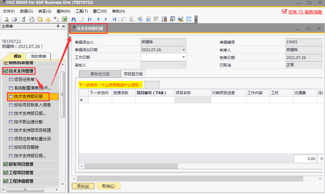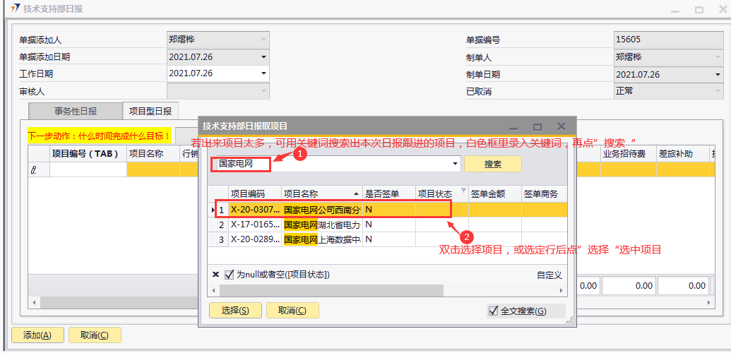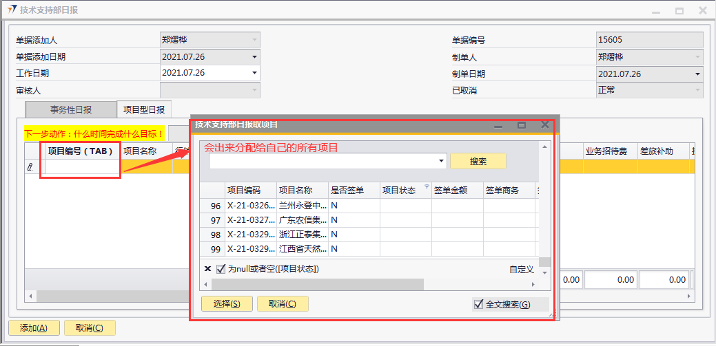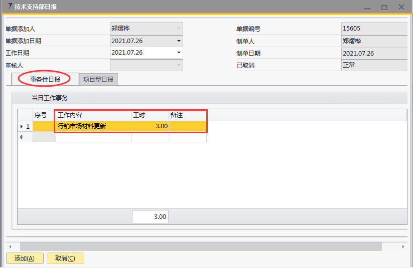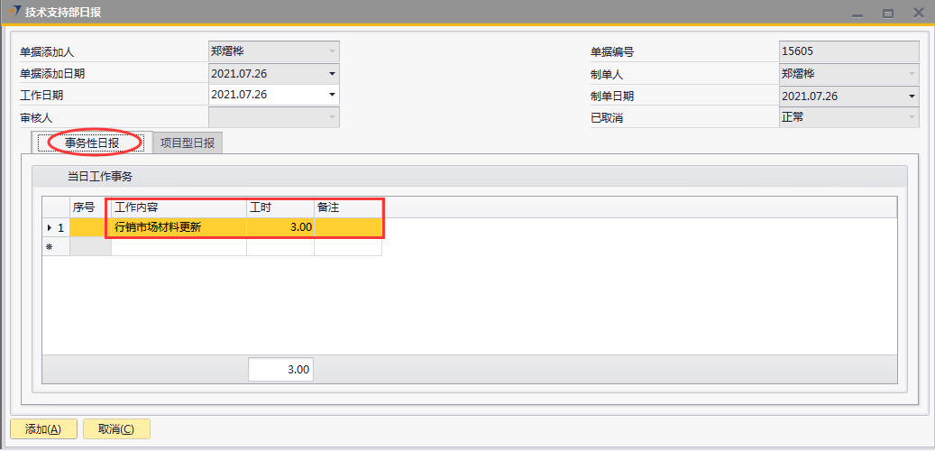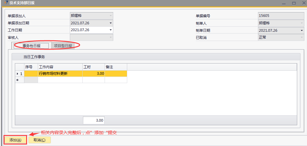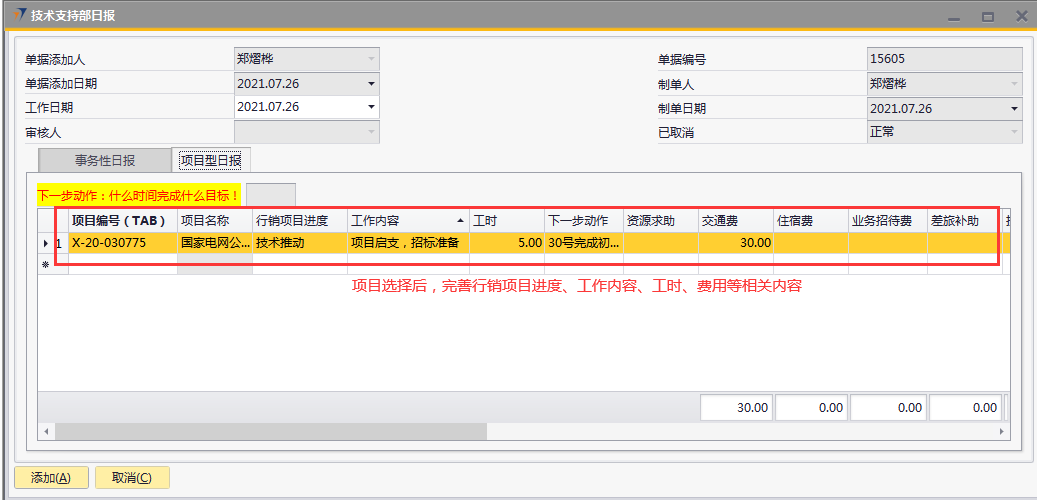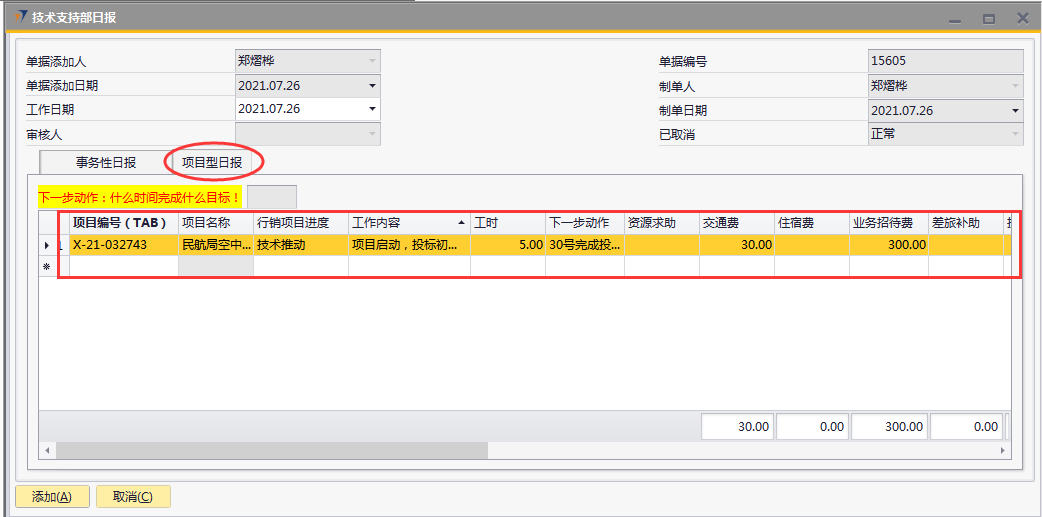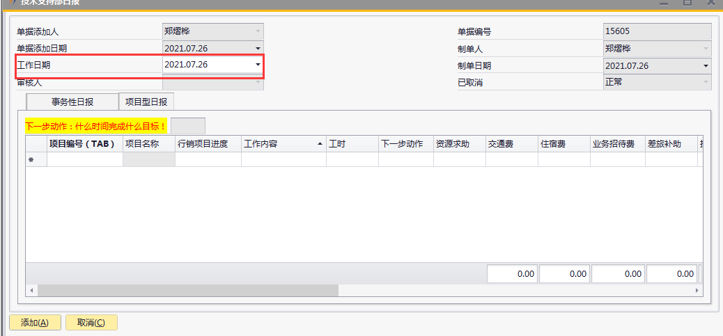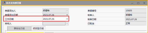 # 1 目的与作用 为了指导和规范技术支持人员日报录入,提升效率,规范管理 # 2 界面介绍 路径:技术支持管理 → 技术支持部日报  # 3 操作说明 注意事项: 1. 新增时,必须保证【事务性日报】页签或【项目型日报】页签至少有一行明细数据 2. 新增时,不可以填审核人 3. 审核时,自己的单据不能由自己审核 4. 审核时,不是自己负责的人员不允许审核 5. 日报不允许添加未来日期的单据 6. 日报不允许添加48小时之前的单据 7. 日报当天不允许重复提交单据 ## 3.1 表头  说明: * + **工作日期:**必填,日报汇报的是哪天的日期,就选哪天,只允许录入48小时内的日期 + **单据添加人、单据添加日期、制单人、制单日期、已取消:**系统默认自动带出,不能修改 + **审核人:**新建时默认为空,审核时由审核人录入 ## 3.2 表体 ### 3.2.1 事务性日报  说明: * + **工作内容:**必填,工作内容描述 + **工时:**必填,日报描述的工作所花费的时间,按小时计算 + **备注:**选填,说明性文字 ### 3.2.2 项目型日报  说明: * + **项目编号:**必填,按Tab选择,可调取到分配给自己的所有项目 + **项目名称:**必填,系统默认带出 + **行销项目进度:**必填,行销人员跟进项目已经进展到哪个阶段 + **工作内容:**必填,工作内容描述 + **工时:**必填,日报描述的工作所花费的时间,按小时计算 + **下一步动作:**选填,下一步计划 + **资源求助:**选填,项目所需帮助 + **交通费:**选填,根据实际情况填入发生的交通费 + **住宿费:**选填,根据实际情况填入发生的住宿费 + **业务招待费:**选填,根据实际情况填入发生的业务招待费 + **差旅补助:**选填,根据实际情况填入发生的差旅补助 + **投标费:**选填,根据实际情况填入发生的投标费 + **快递运输费:**选填,根据实际情况填入发生的快递运输费用 + **其他费用:**选填,根据实际情况填入发生的其他费用 + **交通费批准额:**系统自动根据申请费用带出,审核人可根据实际情况修改 + **住宿费批准额:**系统自动根据申请费用带出,审核人可根据实际情况修改 + **餐费批准额:**系统自动根据申请费用带出,审核人可根据实际情况修改 + **出差补助批准额:**系统自动根据申请费用带出,审核人可根据实际情况修改 + **竞标费批准额:**系统自动根据申请费用带出,审核人可根据实际情况修改 + **运输费批准额:**系统自动根据申请费用带出,审核人可根据实际情况修改 + **其他费用批准额:**系统自动根据申请费用带出,审核人可根据实际情况修改 + **费用小计:**系统自动计算,申请费用的合计 + **批准额小计:**系统自动计算,批准额的合计 ## 3.3 操作步骤 本次操作演示,项目型日报页签、事务性日报页签都有内容,技术人员录入日报时,按实际情况在对应页签录入即可 1. 录入表头信息  2. 鼠标定位到项目编号(TAB),再按Tab键,会调取出来所有分配给自己的项目  3. 选择日报当天跟进的项目  4. 项目选择后,完善行销项目进度、工作内容、工时、费用等相关内容  5. **事务性日报**页签录入内容  6. 相关内容都完整录入后,点“添加”提交单据。添加后,系统会有消息给到对应审批人。