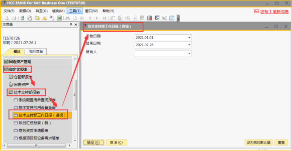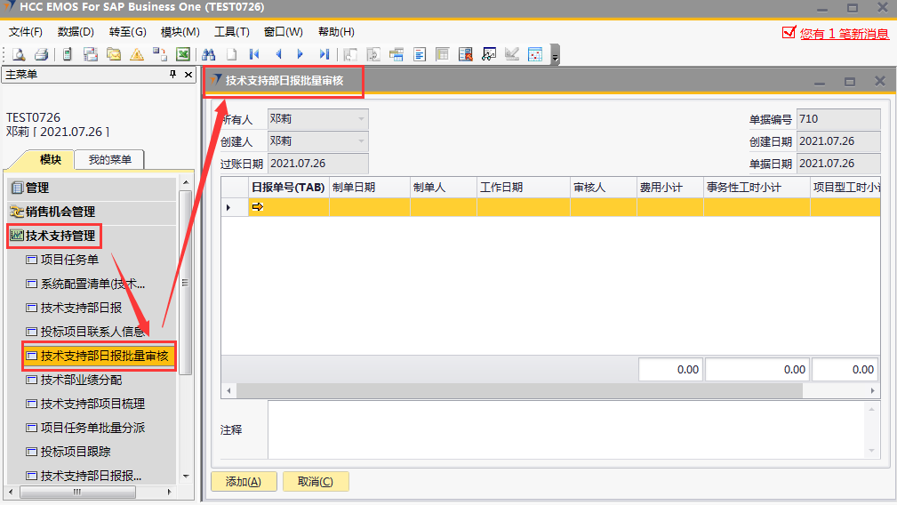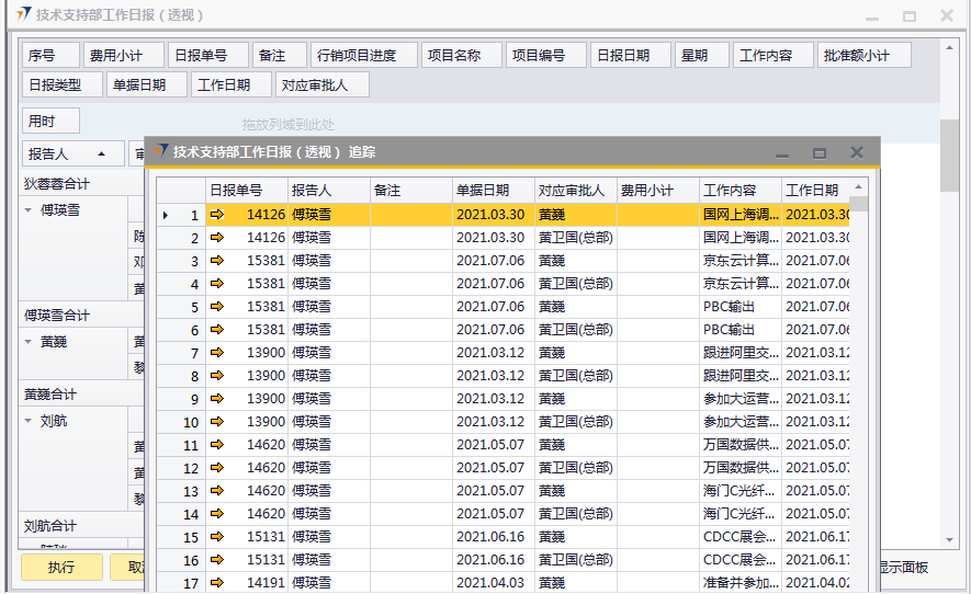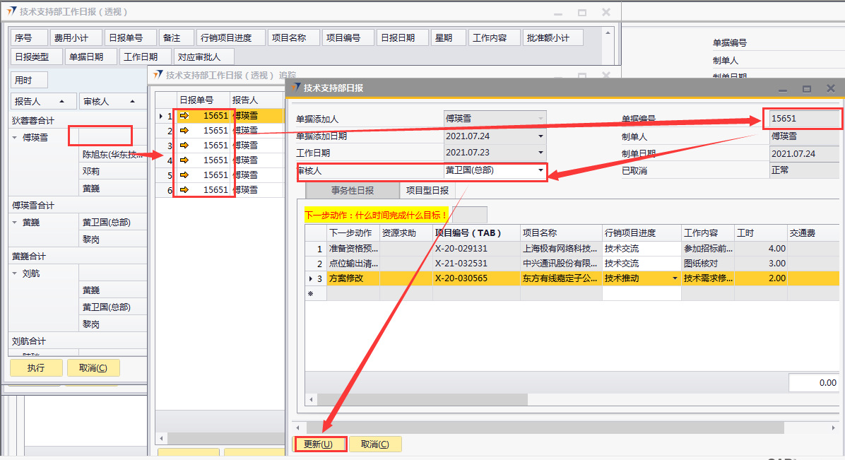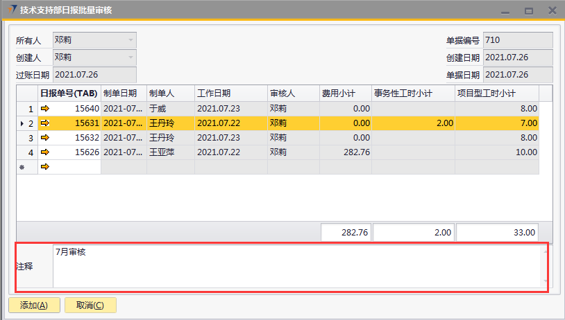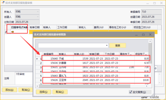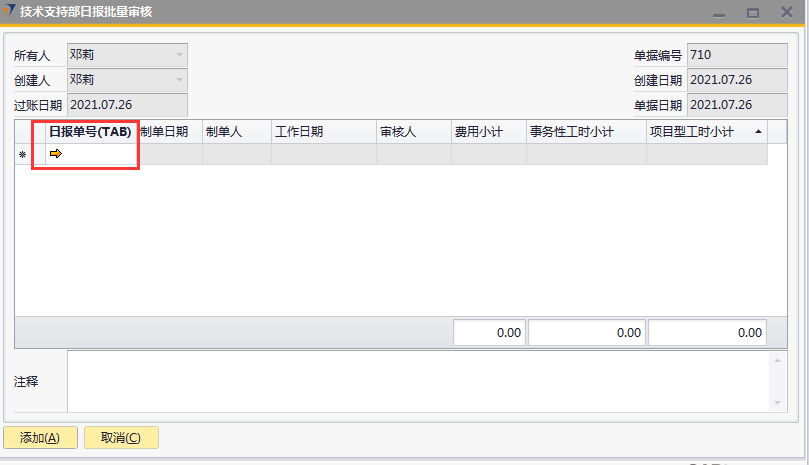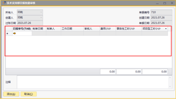 # 1 目的与作用 指导和规范相关人员技术支持部日报批量审核录入操作,准确快捷地录入内容,提升工作效率 # 2 界面介绍 ## 2.1 路径 技术支持管理 → 技术支持部日报批量审核  ## 2.2 表头  说明: * + **创建人、所有人、单据编号、创建日期、单据日期、过账日期:**系统默认带出,不能修改 ## 2.3 表体  说明: * + **日报单号(Tab):**按Tab键选择,必录,需要批量审核的日报单号 + **制单日期、制单人、工作日期、费用小计、事务性工时小计、项目型工时小计:**根据选择的项目自动填入,不可手工填入 + **审核人:**系统自动默认为当前登录账户 + **注释:**必录,当前单据的整体说明、备注字段 # 3 操作方法 1)将鼠标光标定位在**日报单号(Tab)**,按Tab键  2)在弹出来的对话框中,选择需要批量审核的日报,可按单号或者制单人搜索,支持模糊查询;也可一次性选择多个项目(按Ctrl键,然后点击鼠标左键,可以间隔多选;先选中开始行,然后按Shift键,然后鼠标左键点到想要选取的结束位置,可以连续多选);最后点击**选择**按钮,系统将选中的项目带到单据体中  3)填入注释,检查数据无误后,即可点击添加 注意: ①同一个日报单号不能在当前单据重复 ②如日报单有费用,则系统默认将制单人填入的费用更新为费用批准额,如批量审核日报时需要修改费用批准额,请到本身的日报单上去审核  4)日报单号(TAB)列里面的黄色箭头可链接到对应的技术支持部日报界面  # 4 报表说明 ## 4.1 路径 自定义报表 → 技术支持部报表 → 技术支持部日报(透视)  ## 4.2 操作步骤 1. 点击菜单,填入查询条件  2. 结果展示(可按自己的喜好,将上面的字段拖动到不同的分析位置去分析)  3. 也可以点击不同的单元格,去查看具体的分配数据  4. 可拖动列分析出没有审核的日报,然后双击对应的单元格链接到明细表,然后点击明细表里面对应的日报单号,链接到具体的日报单,则可以对某张具体的日报进行审核、并更新上行销项目进度和费用批准额  # 5 注意事项 按照技术支持部要求,操作权限目前只给到四大负责人(黄卫国、邓莉、赵大为、黄巍)