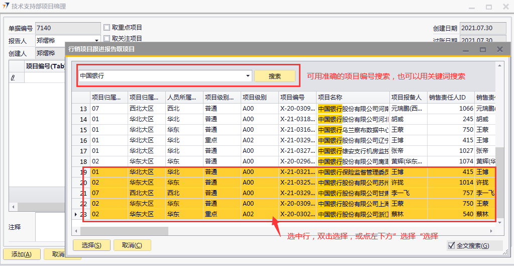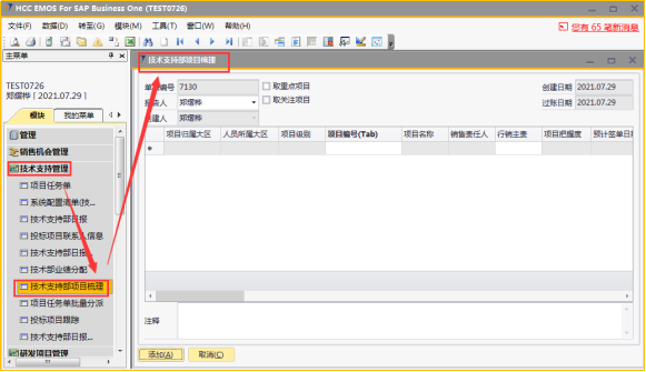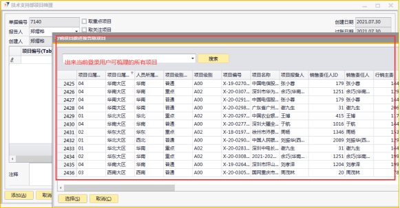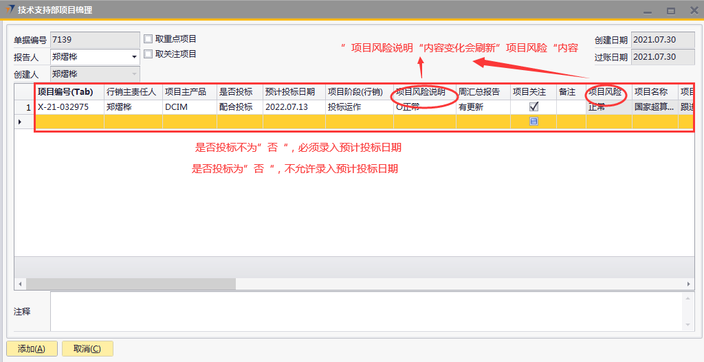 # 1 目的与作用 为了指导和规范技术支持人员梳理项目,提升效率,规范管理 # 2 界面介绍 路径:技术支持管理 → 技术支持部项目梳理  # 3 操作说明 ## 3.1 表头  说明: * + 取重点项目:可勾选,如果勾选,明细表会自动填充权限范围内所有重点项目 + 取关注项目:可勾选,如果勾选,明细表会自动填充权限范围内所有关注项目 + **报告人:**必填,当前项目梳理表报告人,默认跟创建人一致,可修改 + **创建日期、过账日期、创建人:**系统默认自动带出,不能录入也不允许修改 ## 3.2 表体  说明: * + **项目编号:**必填,Tab选择,选择要梳理的项目 + **行销主责任人:**必填,如果任务分配里有系统会自动带出;没有自动带出则手工录入 + **项目主产品:**必填,录入项目主产品 + **是否投标:**必填,按实际情况录入 + **预计投标日期:**“是否投标”不为“否”时,必须填写“预计投标日期”;“是否投标”为“否”时,不允许填写“预计投标日期” + **项目阶段(行销):**必填,按实际情况录入 + **项目风险说明:**必填,按实际情况录入,“项目风险说明”内容的选择会刷新“项目风险”字段 + **周汇总报告:**选填,按项目实际跟进情况录入 + **项目关注:**勾选表示关注,勾选后,之后的项目梳理如果取关注项目就会自动带出来 + **备注:**选填,说明性文字 + **项目名称、项目状态、项目归属大区、人员所属大区、项目级别、销售责任人、项目把握**等字段,系统默认自动带出,不能录入也不允许修改 + **项目风险、项目关注**,只有行销主责任人、邓莉、黄卫国,才允许录入 ## 3.3 操作步骤 1. 录入表头信息  2. 鼠标定位到项目编号(TAB),再按Tab键,会调取出来所有当前登录账号可梳理的项目  3. 选择要梳理的项目  4. 项目选择后,完善行销主责任人、项目主产品、是否投标、预计投票日期、项目阶段、项目风险说明等相关内容,最后点“添加”提交