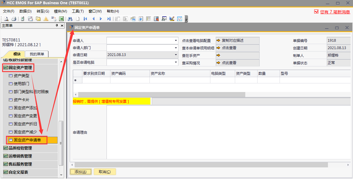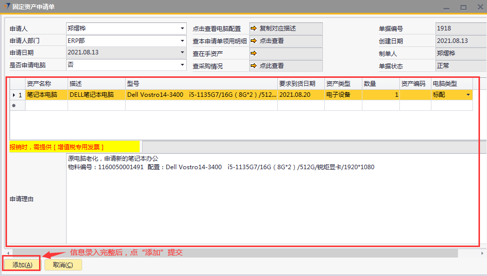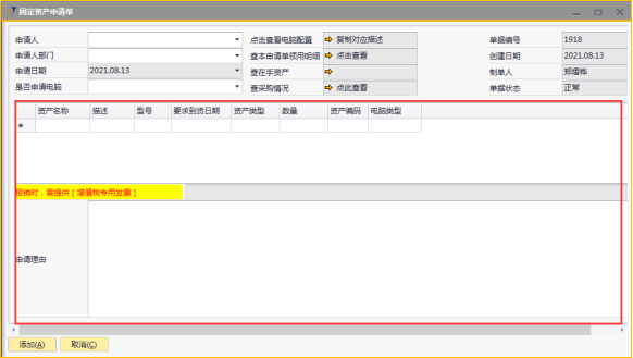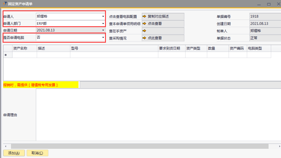 # 1 目的与作用 为了指导和规范相关人员固定资产申请,提升效率,规范管理 # 2 界面介绍 路径:固定资产管理 → 固定资产申请单  # 3 操作说明 ## 3.1 表头  说明: * + **申请人:**必填,选择申请人姓名 + **报销人:**必填,选择申请人所属部门 + **是否申请电脑:**必填,如果申请电脑,选**是**;如果不是申请电脑,选**否** + **点击查看电脑配置:**链接字段,点橙色箭头可查看相关人员可申请电脑标准配置 + **查本申请单领用明细:**链接字段,点橙色箭头可查看相关人员可申请电脑标准配置(添加为正式单据后才可查看进度) + **查在手资产:**链接字段,点橙色箭头可查看申请人员已经领用的固定资产 + **查采购情况:**链接字段,点橙色箭头可查看当前固定资产申请单采购情况(添加为正式单据后才可查看进度) + **申请日期、创建日期、单据状态:**系统默认自动带出,不能录入也不能修改 ## 3.2 表体  说明: * + **资产名称:**必填,录入申请的资产名称 + **描述:**必填,录入申请的资产描述,越详细越好 + **型号:**必填,录入申请的资产型号,越详细越好 + **要求到货日期:**选填,希望固定资产到货的日期 + **资产类型:**必填,有**办公家私、电子设备、房屋厂房、交通工具**四种类型,选择申请资产对应的资产类型 + **数量:**必填,申请的资产数量 + **资产编码:**不填,此栏位理论由财务人员在资产编码后录入 + **电脑类型:**如果申请的是电脑,必须录入 申请电脑时,请先点表头**点击查看电脑配置**,查看可申请的电脑配置明细 * + 申请理由:必填,申请固定资产的原因,请详细说明 ## 3.3 操作步骤 本次以申请电脑为例 ### 3.3.1 表头录入 录入申请人、申请人部门,是否申请电脑选择**是**  ### 3.3.2 表体录入 录入资产名称、描述、型号、要求到货日期、资产类型、数量、电脑类型、申请理由,信息录入完整无误后,点“添加”提交  # 注意事项 暂无