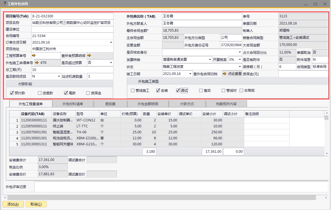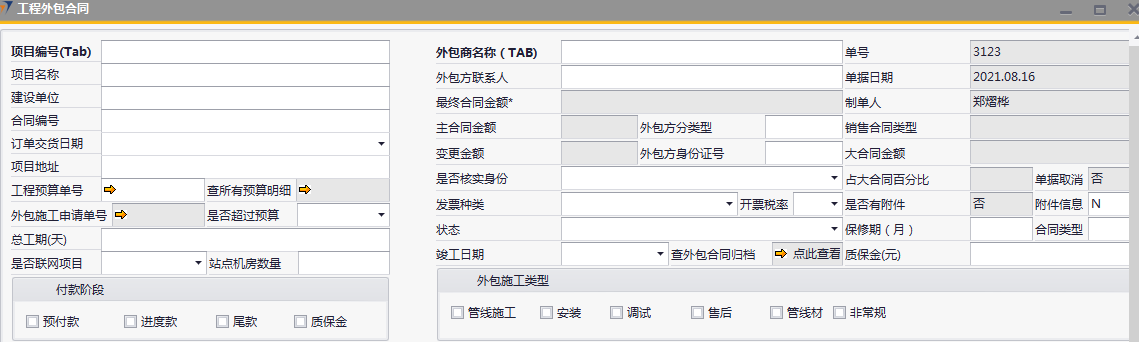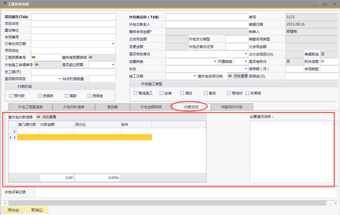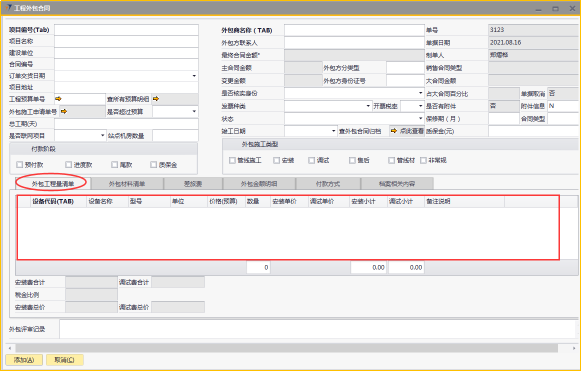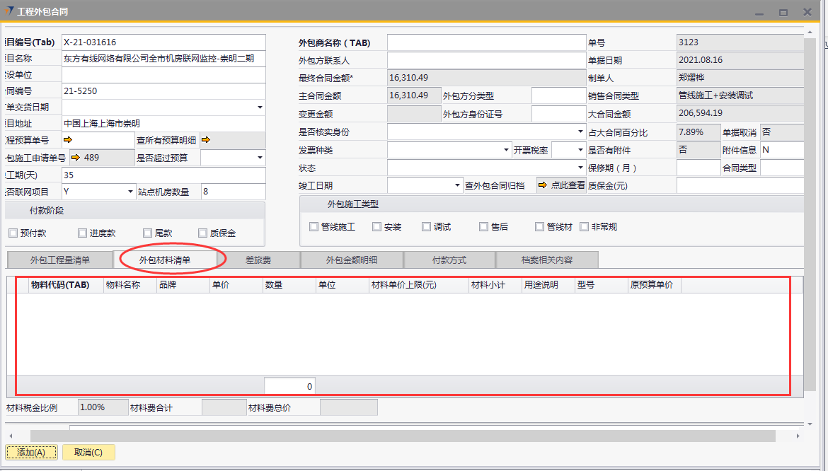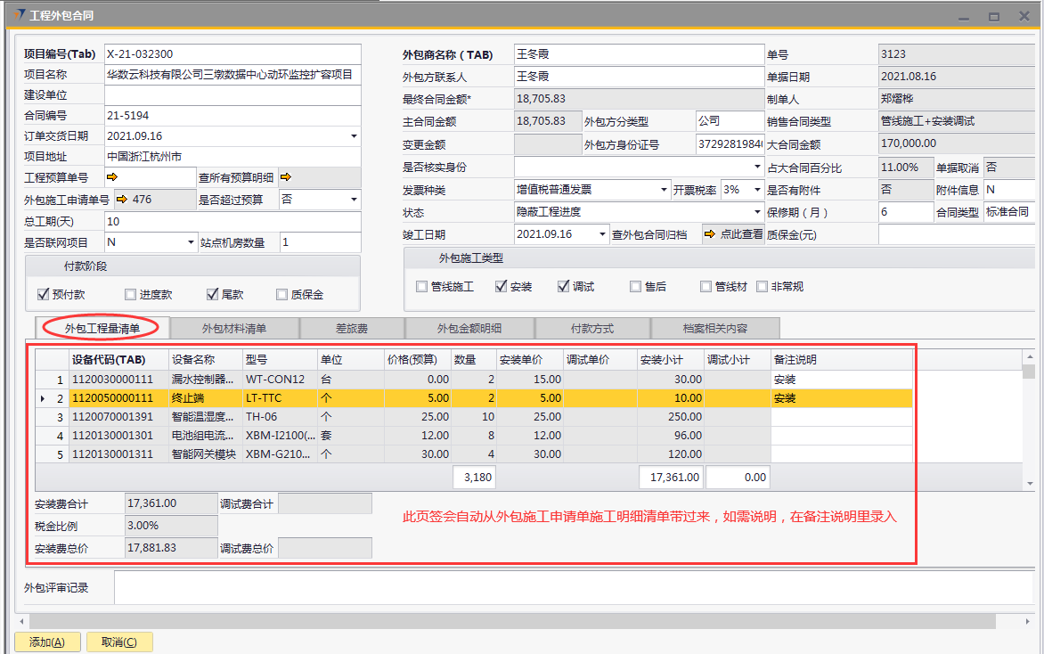 # 1 目的与作用 为了指导和规范工程人员工程外包合同录入,提升效率,规范管理 # 2 界面介绍 路径:工程项目管理 → 工程外包合同  # 3 操作说明 ## 3.1 表头  说明: * + **项目编号:**必填,按Tab选择,外包的项目编号 + **项目名称:**必填,跟项目编号自动带出 + **建设单位:**选填,项目的建设单位 + **合同编号:**选填,如果是销售订单的外包,会自动带出销售订单里的合同编号 + **订单交货日期:**选填,订单的交货日期 + **项目地址:**必填,项目所在地址 + **外包施工申请单:**链接字段,点橙色箭头可查看该项目外包施工申请单 + **是否超预算:**选填,外包合同是否超预算 + **总工期(天):**必填,外包需要的总工期,按天录入 + **是否联网项目:**选填,项目是否是联网项目 + **站点机房数量:**选填,项目站点机房总数 + **外包商名称:**必填,外包商名称 + **外包商联系人:**必填,外包商联系人 + **外包方分类型:**选填,外包方类型 + **外包方身份证号:**选填,外包方身份证号 + **最终合同金额:**必填,从外包施工单带出,不能录入也不能修改 + **主合同金额:**必填,从外包施工单带出,不能录入也不能修改 + **变更金额:**选填,从外包施工单带出,不能录入也不能修改 + **状态:**选填,项目最新状态 + **竣工日期:**必填,外包预计竣工日期 + **保质期(月):**必填,外包保质期,按月录入 + **质保金(元):**选填,质保金金额 + **合同类型:**选填,外包合同类型 + **销售合同类型、大合同金额、占大合同百分比:**系统默认自动带出,不能录入也不能修改 + **付款阶段:**必录,外包合同有哪些付款阶段 + **外包施工类型:**必选,必须选一个类型 ## 3.2 表体 ### 3.2.1 外包工程量清单  说明: * + **设备名称:**必填,设备名称,从外包施工申请单**施工明细清单**带过来,不能录入也不能修改 + **设备代码、型号、单位、价格(预算)、数量、安装单价、调试单价、安装小计、调试小计:**选填,设备型号,从外包施工申请单**施工明细清单**带过来,不能录入也不能修改 + **备注说明:**必填,设备基本情况说明 ### 3.2.2 外包材料清单  说明: * + 此页签内容,从外包施工申请单**管线及辅材清单**带过来,不能录入也不能修改 ### 3.2.3 差旅费  说明: * + 此页签内容,工程预算**外包人员差旅费**带过来,不能录入也不能修改 ### 3.2.4 外包金额明细  说明: * + 此页签内容,系统自动计算 ### 3.2.5 付款方式  说明: * + **第几笔付款:**必填,第几笔付款 + **付款金额:**必填,选择项目阶段时,系统会默认带出,不允许录入也不可修改 + **百分比:**必填,付款占外包总金额的百分比 + **条件:**选填,付款条件说明 + **必要情况说明:**选填,外包必要情况说明 ### 3.2.6 项目相关信息  说明: * + 此页签用来查看项目档案相关内容 ## 3.3 操作步骤 ### 3.3.1 录入表头信息 鼠标定位到项目编号(Tab),再按Tab键,会调取出来当前账号权限范围内的所有可做外包的项目  关键字搜索或直接鼠标滚动查找本次要录外包的项目,双击或左下方**选择**,选择项目  系统会带出来部分相关信息,手动录入其他需要录入的信息  ### 3.3.2 录入表体信息 #### 3.3.2.1 录入外包工程量清单 此页签会自动从外包施工申请单**施工明细清单**带过来,只有备注说明可以手工维护,如果需要说明,手工维护备注说明。检查明细行数据、安装费合计、调试费合计、税金比例、安装费总价、调试费总价  #### 3.3.2.2 录入外包材料清单 此页签数据自动从外包施工申请单**管线及辅材清单**带过来,检查明细、材料税金比例、材料费合计、材料费总价  #### 3.3.2.3 录入差旅费  #### 3.3.2.4 检查外包金额明细 检查外包金额明细  #### 3.3.2.5 录入付款方式 录入付款相关信息,相关信息录入完整无误后,点“添加”提交  # 4 注意事项 1. 先有外包施工申请单,才能录工程外包合同,否则工程外包合同明细表里取不到数据 2. 付款金额总和必须要等于最终合同金额