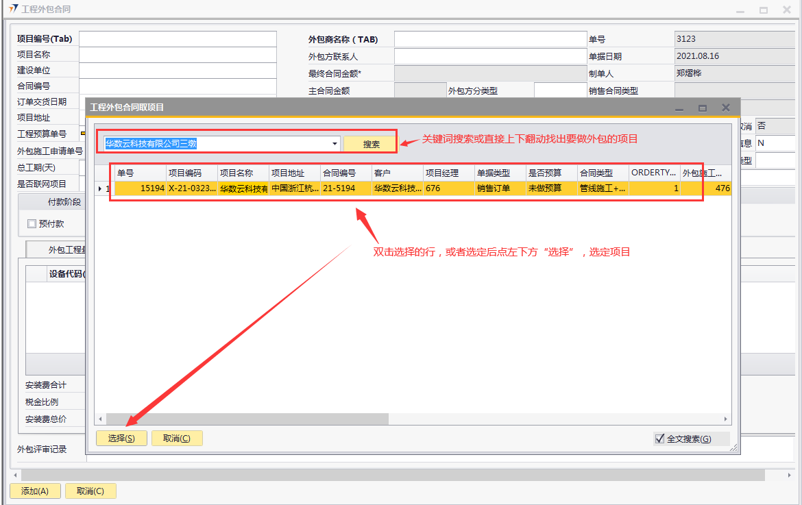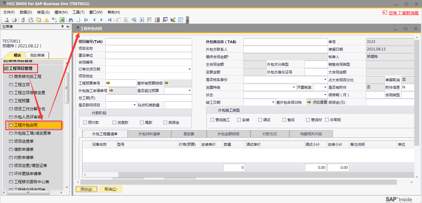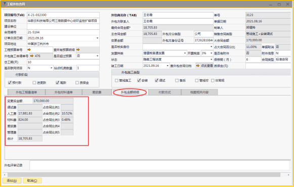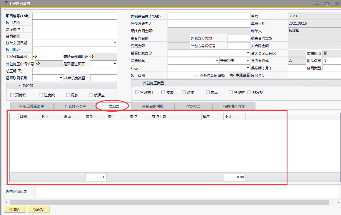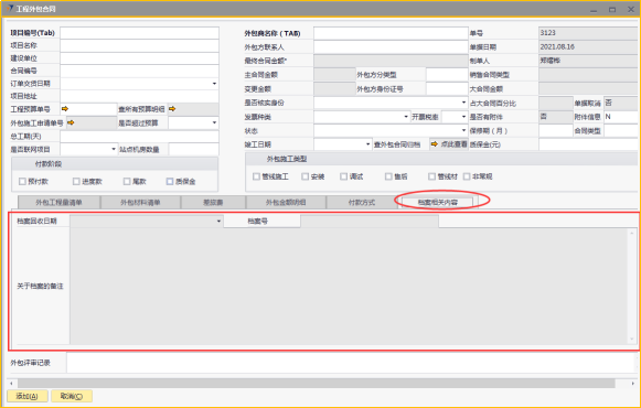 # 1 目的与作用 为了指导和规范工程人员工程外包合同录入,提升效率,规范管理 # 2 界面介绍 路径:工程项目管理 → 工程外包合同  # 3 操作说明 ## 3.1 表头  说明: * + **项目编号:**必填,按Tab选择,外包的项目编号 + **项目名称:**必填,跟项目编号自动带出 + **建设单位:**选填,项目的建设单位 + **合同编号:**选填,如果是销售订单的外包,会自动带出销售订单里的合同编号 + **订单交货日期:**选填,订单的交货日期 + **项目地址:**必填,项目所在地址 + **外包施工申请单:**链接字段,点橙色箭头可查看该项目外包施工申请单 + **是否超预算:**选填,外包合同是否超预算 + **总工期(天):**必填,外包需要的总工期,按天录入 + **是否联网项目:**选填,项目是否是联网项目 + **站点机房数量:**选填,项目站点机房总数 + **外包商名称:**必填,外包商名称 + **外包商联系人:**必填,外包商联系人 + **外包方分类型:**选填,外包方类型 + **外包方身份证号:**选填,外包方身份证号 + **最终合同金额:**必填,从外包施工单带出,不能录入也不能修改 + **主合同金额:**必填,从外包施工单带出,不能录入也不能修改 + **变更金额:**选填,从外包施工单带出,不能录入也不能修改 + **状态:**选填,项目最新状态 + **竣工日期:**必填,外包预计竣工日期 + **保质期(月):**必填,外包保质期,按月录入 + **质保金(元):**选填,质保金金额 + **合同类型:**选填,外包合同类型 + **销售合同类型、大合同金额、占大合同百分比:**系统默认自动带出,不能录入也不能修改 + **付款阶段:**必录,外包合同有哪些付款阶段 + **外包施工类型:**必选,必须选一个类型 ## 3.2 表体 ### 3.2.1 外包工程量清单  说明: * + **设备名称:**必填,设备名称,从外包施工申请单**施工明细清单**带过来,不能录入也不能修改 + **设备代码、型号、单位、价格(预算)、数量、安装单价、调试单价、安装小计、调试小计:**选填,设备型号,从外包施工申请单**施工明细清单**带过来,不能录入也不能修改 + **备注说明:**必填,设备基本情况说明 ### 3.2.2 外包材料清单  说明: * + 此页签内容,从外包施工申请单**管线及辅材清单**带过来,不能录入也不能修改 ### 3.2.3 差旅费  说明: * + 此页签内容,工程预算**外包人员差旅费**带过来,不能录入也不能修改 ### 3.2.4 外包金额明细  说明: * + 此页签内容,系统自动计算 ### 3.2.5 付款方式  说明: * + **第几笔付款:**必填,第几笔付款 + **付款金额:**必填,选择项目阶段时,系统会默认带出,不允许录入也不可修改 + **百分比:**必填,付款占外包总金额的百分比 + **条件:**选填,付款条件说明 + **必要情况说明:**选填,外包必要情况说明 ### 3.2.6 项目相关信息  说明: * + 此页签用来查看项目档案相关内容 ## 3.3 操作步骤 ### 3.3.1 录入表头信息 鼠标定位到项目编号(Tab),再按Tab键,会调取出来当前账号权限范围内的所有可做外包的项目  关键字搜索或直接鼠标滚动查找本次要录外包的项目,双击或左下方**选择**,选择项目  系统会带出来部分相关信息,手动录入其他需要录入的信息  ### 3.3.2 录入表体信息 #### 3.3.2.1 录入外包工程量清单 此页签会自动从外包施工申请单**施工明细清单**带过来,只有备注说明可以手工维护,如果需要说明,手工维护备注说明。检查明细行数据、安装费合计、调试费合计、税金比例、安装费总价、调试费总价  #### 3.3.2.2 录入外包材料清单 此页签数据自动从外包施工申请单**管线及辅材清单**带过来,检查明细、材料税金比例、材料费合计、材料费总价  #### 3.3.2.3 录入差旅费  #### 3.3.2.4 检查外包金额明细 检查外包金额明细  #### 3.3.2.5 录入付款方式 录入付款相关信息,相关信息录入完整无误后,点“添加”提交  # 4 注意事项 1. 先有外包施工申请单,才能录工程外包合同,否则工程外包合同明细表里取不到数据 2. 付款金额总和必须要等于最终合同金额
