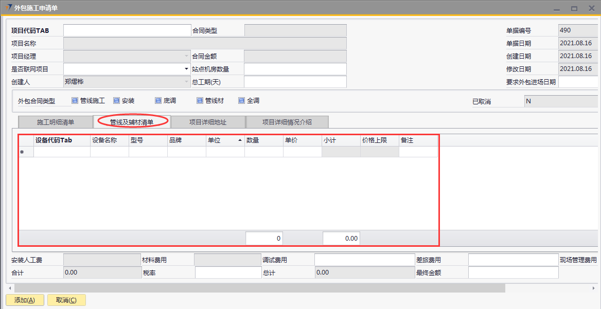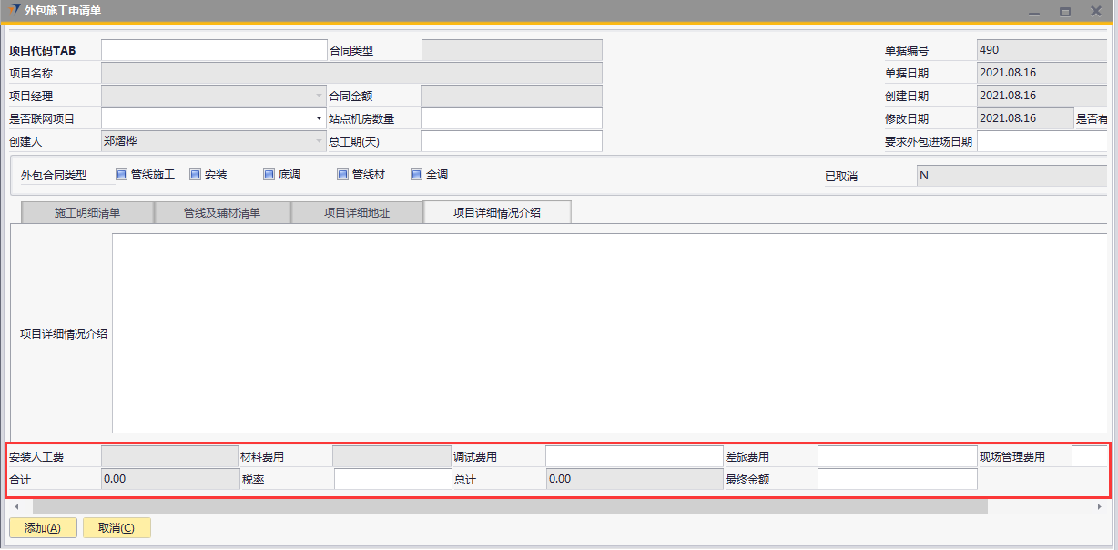 # 1 目的与作用 为了指导和规范工程人员外包施工申请单录入,提升效率,规范管理 # 2 界面介绍 路径:工程项目管理 → 外包施工申请单  # 3 操作说明 ## 3.1 表头  说明: * + **项目编号:**必填,按Tab选择,外包施工申请的项目 + **项目经理:**必填,负责本项目的项目经理 + **是否联网项目:**选填,项目是否是联网项目 + **站点机房数量:**选填,项目站点机房数量 + **总工期(天):**必填,外包施工总工期,按天计算 + **要求外包进场日期:**必填,要求外包商进场的时间 + **项目名称、项目经理、合同类型、合同金额、单据日期、已取消:**系统默认自动带出,不能录入也不能修改 ## 3.2 表体 ### 3.2.1 施工明细清单 表头信息选择后,本页签内容会自动填充(项目如果有销售订单,填充内容是销售订单明细行+变更单明细行;项目如果只有未签合同先发货,填充内容是未签合同先发货明细行+变更单明细行),可手动调整  说明: * + **设备代码:**选填,如果是系统设备,按Tab选择 + **设备名称:**必填,如果选择系统设备,设备名称会自动带出;如果不是系统设备,手动录入设备名称 + **型号:**选填,如果选择系统设备,设备型号会自动带出;如果不是系统设备,手动录入设备型号 + **单位:**选填,如果选择系统设备,单位会自动带出;如果不是系统设备,手动录入单位 + **数量:**必填,需要的设备数量 + **安装单价:**必填,设备安装单价 + **安装小计:**等于安装单价*数量 + 价格上限:如果是系统设备,会自动带出,不能录入也不能修改 + **备注:**要说明的相关事项 ### 3.2.2 管线及辅材清单  说明: * + **设备代码:**选填,如果是系统设备,按Tab选择 + **设备名称:**必填,如果选择系统设备,设备名称会自动带出;如果不是系统设备,手动录入设备名称 + **型号:**选填,如果选择系统设备,设备型号会自动带出;如果不是系统设备,手动录入设备型号 + **品牌:**选填,如果选择系统设备,品牌会自动带出;如果不是系统设备,手动录入品牌 + **单位:**选填,如果选择系统设备,单位会自动带出;如果不是系统设备,手动录入单位 + **数量:**必填,需要的设备数量 + **单价:**必填,设备单价 + **小计:**等于单价*数量 + 价格上限:如果是系统设备,会自动带出,不能录入也不能修改 + **备注:**要说明的相关事项 ### 3.2.3 项目详细地址  说明: * + **省:**必填,选择项目所在省 + **市:**必填,选择项目所在市 + **区:**选填,录入项目所在区 + **街道:**选填,录入项目所在街道 ### 3.2.4 项目详细情况介绍  说明: * + **项目详细情况介绍:**必填,录入项目详细情况介绍 ### 3.2.5 其他  说明: * + **安装人工费:**施工明细清单中安装小计之和,系统自动带出,不能录入也不能修改 + **材料费用:**管线及辅材清单小计之和,系统自动带出,不能录入也不能修改 + **调试费用:**选填,如果有调试费用,手工录入 + **差旅费用:**选填,如果有差旅费用,手工录入 + **现场管理费用:**选填,如果有现场管理费用,手工录入 + **合计:**安装人工费 + 材料费用 + 调试费用 + 差旅费用 + 现场管理费用 + **税率:**选填,手工录入税率 + **总计:**合计* (1+税率) + **最终金额:**选填,外包施工申请单最终金额 ## 3.3 操作步骤 ### 3.3.1 录入表头信息 鼠标定位到项目代码(Tab),再按Tab键,会调取出来当前账号权限范围内所有可做外包施工申请单的项目  关键字搜索或直接鼠标滚动查找本次要立项的项目,双击或左下方选择,选择项目  系统会带出来部分相关信息,手动录入其他需要录入的信息  ### 3.3.2 录入表体信息 #### 3.3.2.1 录入施工明细清单 表头项目信息选择后,施工明细清单会自动填充,如有填充,可手动调整(删行、增行、调整单价、调整数量等),如有需要备注说明的,在备注栏录入  #### 3.3.2.2 录入管线及辅材清单 如果是系统设备,按Tab选择,再录入数量和单价;如果不是系统设备,手动录入设备名称、型号、品牌、数量、单价  #### 3.3.2.3 录入项目详细地址 录入项目的项目地址  #### 3.3.2.4 录入项目详细情况介绍 录入项目详细情况说明  说明: * + Tab出来内容,系统默认申报工时跟有效工时上限一致。如修改,修改时如果申报工时>有效工时上限,需要在备注内说明 #### 3.3.2.5 其他 调试费用、差旅费用、现场管理费用如果有产生,录入 录入税率、最终金额 信息录入完整无误后,点左下方“添加”提交  说明: * + Tab出来内容,系统默认申报工时跟有效工时上限一致。如修改,修改时如果申报工时>有效工时上限,需要在备注内说明 # 4 注意事项 一个项目只允许录入一次外包施工申请单