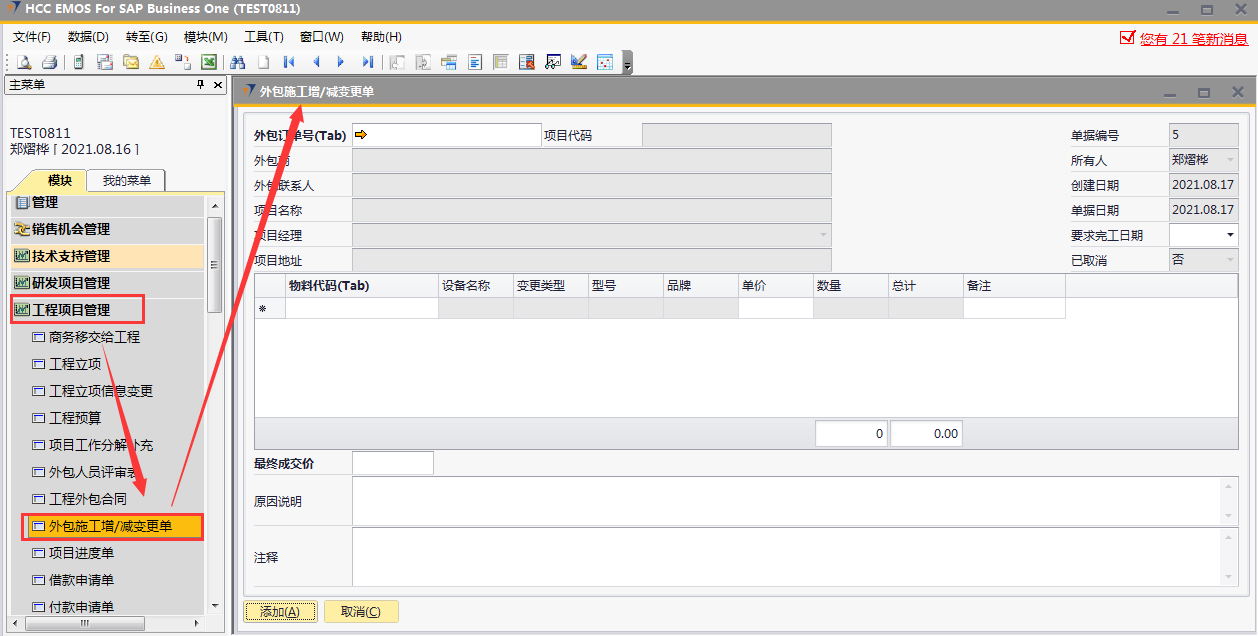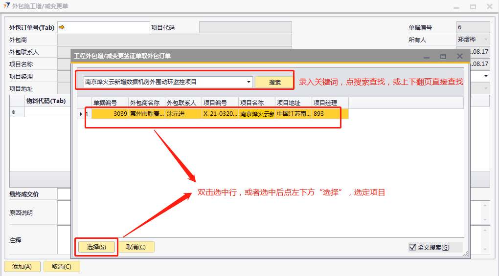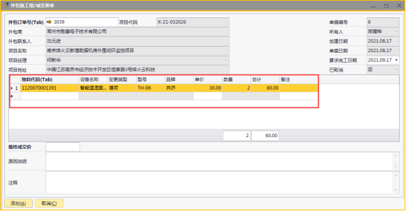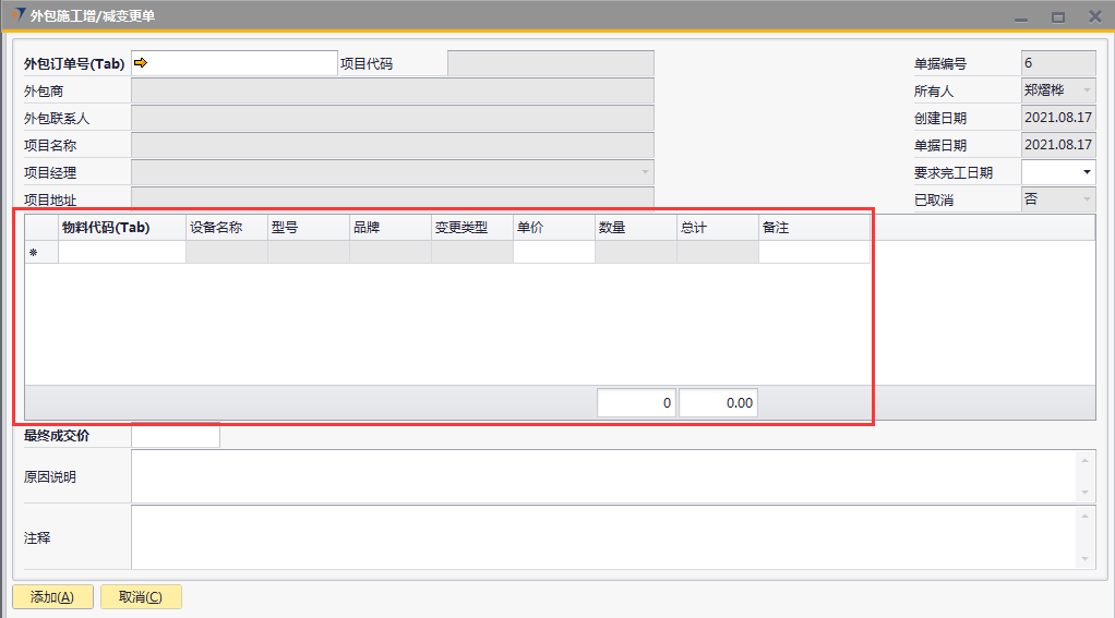 # 1 目的与作用 为了指导和规范工程人员外包施工增减项录入,提升效率,规范管理 # 2 界面介绍 路径:工程项目管理 → 外包施工增/减变更单  # 3 操作说明 ## 3.1 表头  说明: * + **外包订单号:**必填,按Tab选择,要做外包施工增减变更单的项目 + **要求完工日期:**必填,外包增减项要求完工的日期 + **外包商、外包联系人、项目代码、项目名称、项目经理、项目地址、创建日期、单据日期、所有人、已取消:**系统默认自动带出,不能录入也不能修改 ## 3.2 表体 如果只是金额变更,不用录入明细行数据;如果有设备变更,需要录入明细行数据  说明: * + **物料代码:**必填,按Tab选择,选择有外包金额变更的增减项物料 + **单价:**选填,设备单价 + **设备名称、型号、品牌、变更类型、数量:**系统默认自动带出,不能录入也不能修改 ## 3.3 其他  说明: * + **最终成交价:**必填,外包增减项变更最终成交价 + **原因说明:**必填,外包增减项变更原因 + **注释:**选填,需要说明的相关事项 ## 3.4 操作步骤 ### 3.4.1 录入表头信息 鼠标定位到外包订单号(Tab),再按Tab键,会调取出来当前账号权限范围内所有可做外包外包增减项的项目  关键字搜索或直接鼠标滚动查找本次要做外包增减项的项目,双击或左下方选择,选择项目  系统会带出来部分相关信息,手动录入其他需要录入的信息  ### 3.4.2 录入表体信息 鼠标定位到物料代码,按Tab选择,会调出来所有可外包变更设备,选择设备,录入单价,需要说明在备注栏录入内容  ### 3.4.3 录入其他信息 录入最终成交价、原因说明,有其它相关说明的在注释里录入,相关信息录入完整无误后,点“添加”提交  # 4 注意事项 表体物料代码取项目变更单逻辑:物料必须是硬件