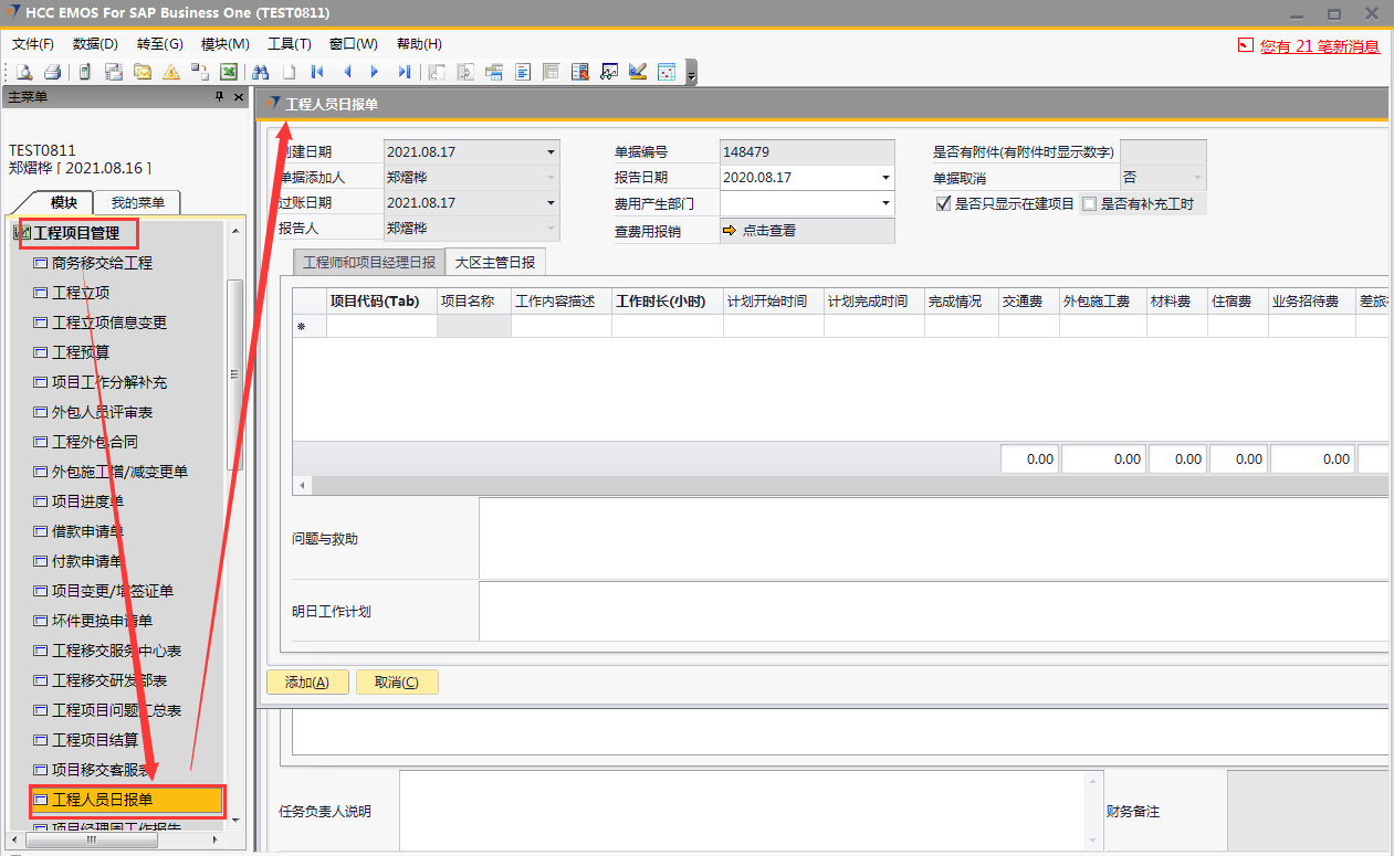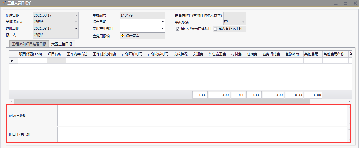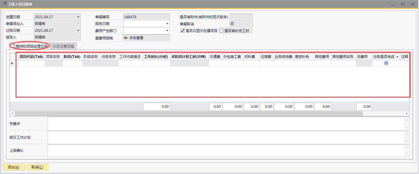# 1 目的与作用 为了指导和规范工程人员工程日报录入,提升效率,规范管理 # 2 界面介绍 路径:工程项目管理 → 工程人员日报单  # 3 操作说明 ## 3.1 表头  说明: * + **报告日期:**必填,录入报告日期,可录入48小时内的日期 + **费用产生部门:**选填,费用产生部门 + **单据添加人、报告人、过账日期、单据取消:**系统默认自动带出,不能录入也不能修改 ## 3.2 表体 ### 3.2.1 工程师和项目经理日报(工程师、项目经理填写)  说明: * + **项目代码:**必填,按Tab选择,选择跟进项目 + **项目名称:**Tab项目代码时系统自动带出,不能录入也不能修改 + **阶段:**必填,按Tab选择,选择项目所属阶段 + **阶段名称:**Tab阶段时系统自动带出,不能录入也不能修改 + **任务名称:**Tab阶段时系统自动带出,不能录入也不能修改 + **工作内容描述:**必填,当天工作内容描述 + **工作时长(小时):**必填,当天工作时长,小时为单位 + **交通费:**选填,如果有交通费产生,录入 + **外包施工费:**选填,如果有外包施工费产生,录入 + **材料费:**选填,如果有材料费产生,录入 + **住宿费:**选填,如果有住宿费产生,录入 + **业务招待费:**选填,如果有业务招待费产生,录入 + **差旅补助:**选填,如果有差旅补助产生,录入 + **其他费用:**选填,如果有其他费用产生,录入。有其他费用时,其他费用名称一定要录入 + **其他费用名称:**选填,如果有其他费用产生时,必选 + **任务是否完成:**选填,如果当前任务完成,打勾 + **注释:**要说明的相关事项 ### 3.2.2 大区主管日报(大区主管填写)  说明: * + **项目代码:**必填,按Tab选择,选择跟进项目 + **项目名称:**Tab项目代码时系统自动带出,不能录入也不能修改 + **工作内容描述:**必填,当天工作内容描述 + **工作时长(小时):**必填,当天工作时长,小时为单位 + **计划开始时间:**选填,工作计划开始时间 + **计划完成时间:**选填,工作计划完成时间 + **完成情况:**选填,计划工作完成情况 + **交通费:**选填,如果有交通费产生,录入 + **外包施工费:**选填,如果有外包施工费产生,录入 + **材料费:**选填,如果有材料费产生,录入 + **住宿费:**选填,如果有住宿费产生,录入 + **业务招待费:**选填,如果有业务招待费产生,录入 + **差旅补助:**选填,如果有差旅补助产生,录入 + **其他费用:**选填,如果有其他费用产生,录入。有其他费用时,其他费用名称一定要录入 + **其他费用名称:**选填,如果有其他费用产生时,必选 + **备注:**要说明的相关事项 ### 3.2.3 其他  说明: * + **问题与救助:**选填,项目存在的问题与需要的救助 + **明日工作计划:**选填,明日工作计划 ## 3.3 操作步骤 本次以工程师、项目经理录入工程日报为例 ### 3.3.1 录入表头信息 录入报告日期  ### 3.3.2 录入表体信息 鼠标定位到项目代码(Tab),再按Tab键,会调取出来当前账号权限范围内所有可录工程日报的项目  关键字搜索或直接鼠标滚动查找本次要提日报单的项目,双击或左下方选择,选择项目  系统会带出来项目代码和项目名称,鼠标再定位到阶段,按Tab,选择项目目前阶段  选择项目阶段,录入工作内容概述、工作时长、本阶段计划工时、相关费用  ### 3.3.3 录入其他信息 录入关键点、明日工作计划,信息录入完整无误后,点“添加”提交  # 4 注意事项 1. 报告必须在48小时内填写 2. 报告日期不能是明天或明天之后的日期 3. 每天只可以做一次报告,不能重复提交 4. 工作时长(小时)不能大于本阶段计划工时 5. 工作时长不能大于16(小时) 6. 工作内容描述,不能有围标、陪标、替票、无票、发票抵扣报销、送礼、年终奖等词 7. 工程阶段有先后顺序,勾选任务完成时系统会判断前面阶段是否已经完成 8. 工程日报表中勾选任务完成,完成时间会回写到对应工程立项单对应阶段的实际开始日期和实际结束日期,可在工程人员日报更新的阶段有:深化设计、进场验货、管线施工、安装调试、自检、培训。验货、终验(签字)、终验(盖章)阶段只能在项目进度单更新