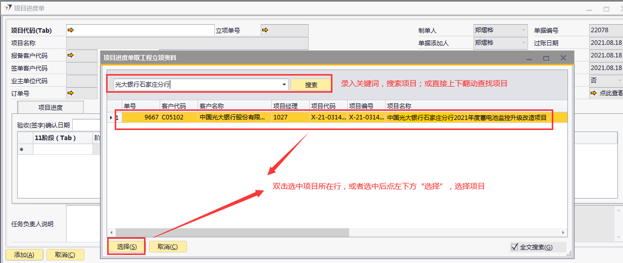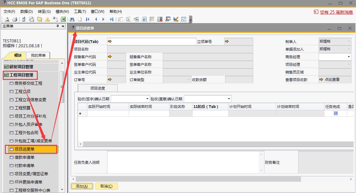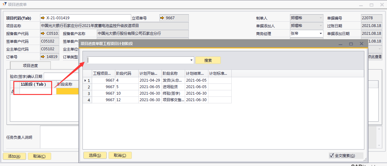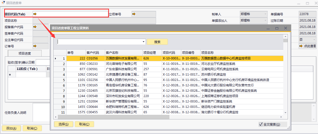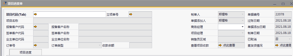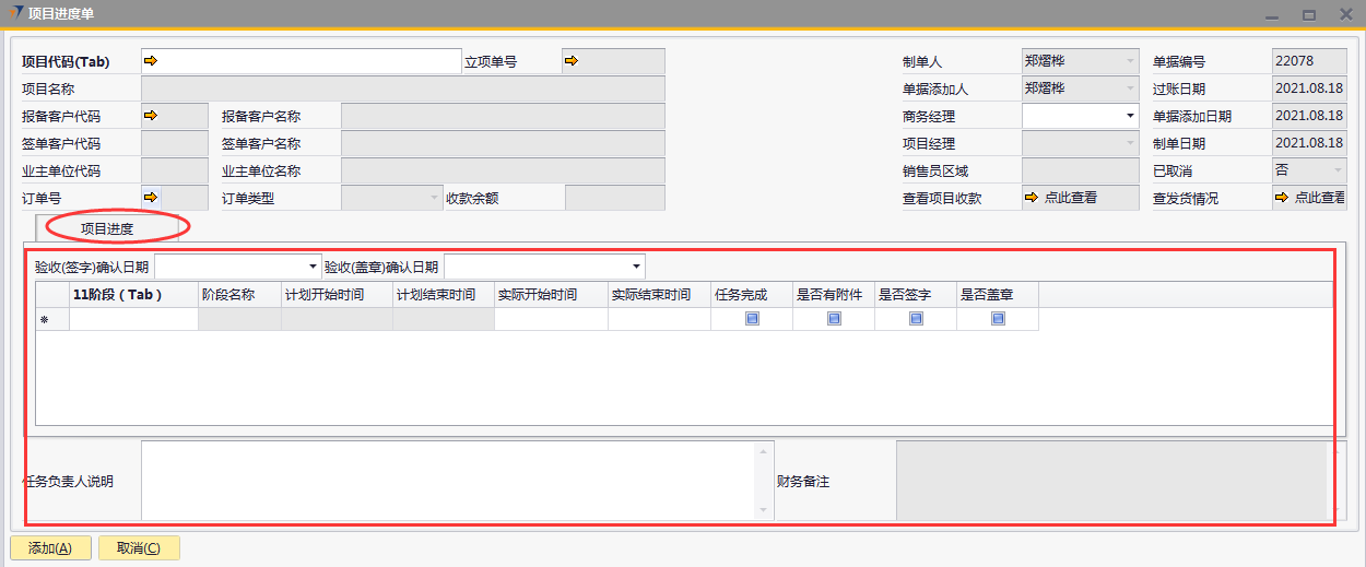 # 1 目的与作用 为了指导和规范工程人员项目进度单录入,提升效率,规范管理 # 2 界面介绍 路径:工程项目管理 → 项目进度单  # 3 操作说明 ## 3.1 表头  说明: * + **项目代码:**必填,按Tab选择,报告进度的项目 + **商务经理:**必填,系统自动带出,可修改 + **项目名称、报备客户代码、报备客户名称、签单客户代码、签单客户名称、业主单位代码、业主单位名称、订单类型、收款余额、项目经理、销售员区域:**系统默认自动带出,不能录入也不能修改 ## 3.2 表体  说明: * + **验收(签字)确认日期:**新建时不录入,财务编辑时录入 + **验收(盖章)确认日期:**新建时不录入,财务编辑时录入 + **阶段:**必填,项目阶段 + **阶段名称、计划开始时间、计划结束时间:**系统自动带出,不能录入也不能修改 + **实际开始时间:**必填,项目对应阶段实际开始时间 + **实际结束时间:**必填,项目对应阶段实际结束时间 + **任务完成:**选填,如果对应阶段任务完成,勾选;未完成,不勾选 + **是否有附件:**选填,如果有附件,勾选;没有附件,不勾选 + **是否签字:**选填,如果有签字,勾选;没有签字,不勾选 + **是否盖章:**选填,如果有盖章,勾选;没有盖章,不勾选 + **任务负责人说明:**选填,任务负责人相关说明 ## 3.3 操作步骤 ### 3.3.1 录入表头信息 鼠标定位到项目代码(Tab),再按Tab键,会调取出来当前账号权限范围内所有可更新进度的项目!  关键字搜索或直接鼠标滚动查找本次要立项的项目,双击或左下方选择,选择项目  系统会带出来相关信息,检查相关信息  ### 3.3.2 录入表体信息 鼠标定位到阶段,按Tab  选择更新进度的阶段,录入实际开始时间、实际结束时间,任务完成、是否有附件、是否有附件、是否签字、是否盖章按实际情况选择是否打勾  # 4 注意事项 1. 实际开始日期、实际结束日期不能大于当天 2. 实际开始日期不能小于实际结束日期 3. 工程阶段有先后顺序,勾选任务完成时系统会判断前面阶段是否已经完成 4. 项目进度中勾选任务完成,完成时间会回写到对应工程立项单对应阶段实际开始日期和实际完成日期,可更新的阶段有:验货、终验(签字)、终验(盖章)阶段。深化设计、进场验货、管线施工、安装调试、自检、培训只能在工程人员日报中更新