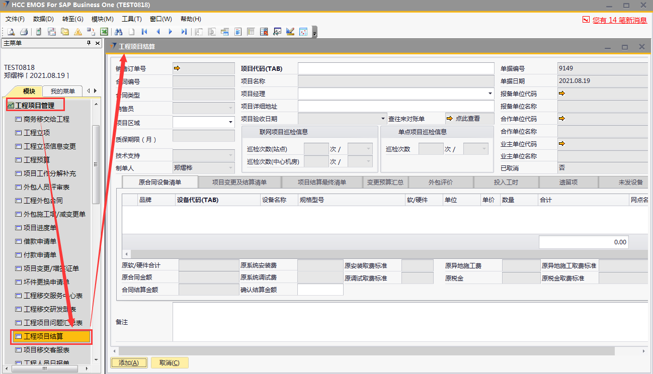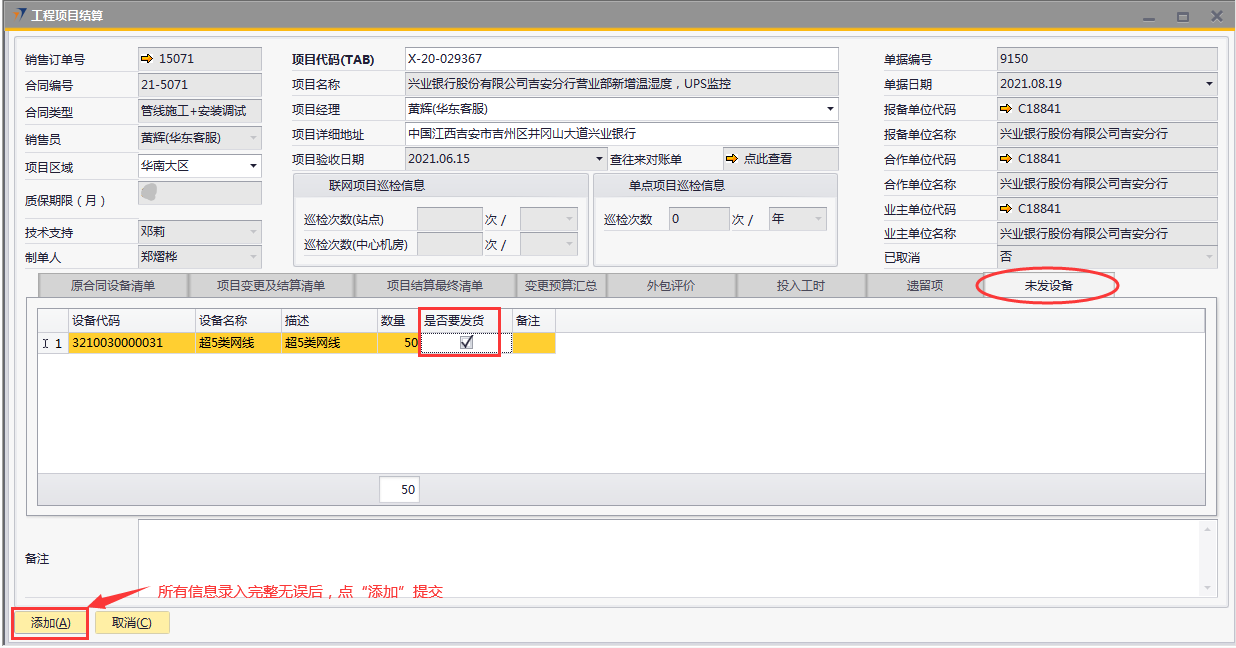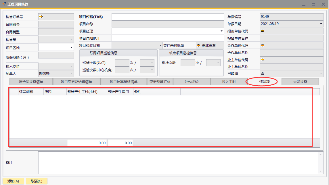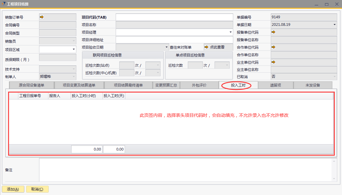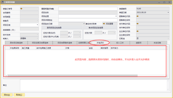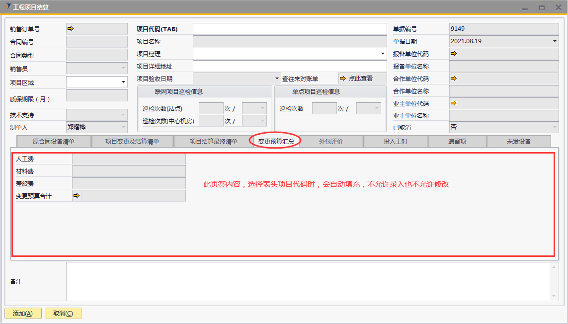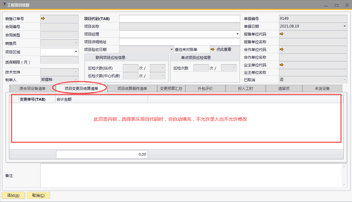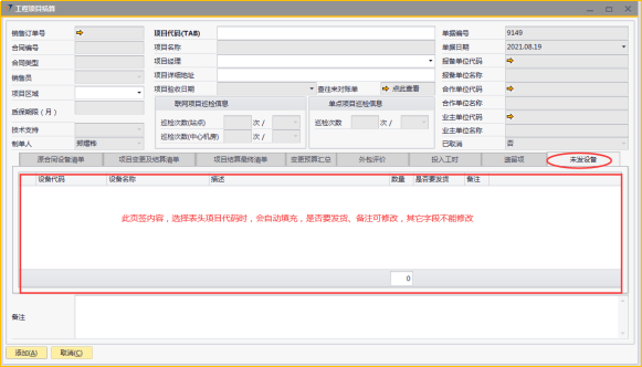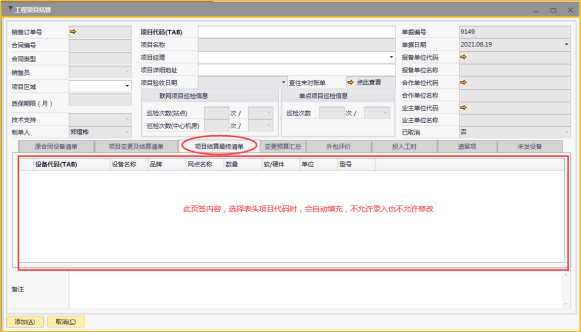 # 1 目的与作用 为了指导和规范工程人员结算项目,提升效率,规范管理 # 2 界面介绍 路径:工程项目管理 → 工程项目结算  # 3 操作说明 ## 3.1 表头  说明: * + **项目代码:**必填,按Tab选择,选择要结算的项目 + **项目经理:**必填,项目的项目经理 + **项目区域:**必填,项目对应区域 + **项目详细地址:**必填,项目的详细地址 + **项目验收日期:**必填,系统默认带出。逻辑为:非买卖合同,项目验收日期为验收日期;买卖合同,项目验收日期为最后一次发货日期+7天 + **确认结算金额:**必填,最终确认的结算金额 + **项目名称、报备单位代码、报务单位名称、合作单位代码、合作单位名称、业主单位代码、业主单位名称、联网项目巡检信息、单点项目巡检信息:**系统默认自动带出,不能录入也不能修改 ## 3.2 表体 ### 3.2.1 原合同设备清单  说明: * + 此页签内容,选择表头项目代码时,会自动填充,不允许录入也不允许修改 ### 3.3.2 项目变更及结算清单  说明: * + 此页签内容,选择表头项目代码时,会自动填充,不允许录入也不允许修改 ### 3.2.3 项目结算最终清单  说明: * + 此页签内容,选择表头项目代码时,会自动填充,不允许录入也不允许修改 ### 3.2.4 变更预算汇总  说明: * + 此页签内容,选择表头项目代码时,会自动计算和填充,不允许录入也不允许修改 ### 3.2.5 外包评价  说明: * + 此页签内容,选择表头项目代码时,会自动填充,不允许录入也不允许修改 ### 3.2.6 投入工时  说明: * + 此页签内容,选择表头项目代码时,会自动填充,不允许录入也不允许修改 ### 3.2.7 遗留项 如果做结算时,有遗留项后续需要处理,请在遗留项这里录入相关内容  说明: * + **遗留问题:**必填,遗留问题描述 + **原因:**必填,外包增减项变更原因 + **预计产生工时:**选填,处理遗留问题预计产生的工时 + **预计产生费用:**选填,处理遗留问题预计产生的费用 + **备注:**需要说明的情况 ### 3.2.8 未发设备 如果做结算时,如果还有设备未发,系统会自动带过来 是否要发货、备注可修改,其它字段不能修改  说明: * + **设备代码:**还没发完的设备 + **设备名称、描述、数量:**系统自动带过来,不能录入也不能修改 + **是否要发货:**如果需要发货,打勾;不需要发货,不打勾 + **备注:**其他相关说明 ## 3.3 操作步骤 本次以项目有遗留项、有未发设备后续需要发货为例 ### 3.3.1 录入表头信息 鼠标定位到外包订单号(Tab),再按Tab键,会调取出来当前账号权限范围内所有可结算的项目  关键字搜索或直接鼠标滚动查找本次要结算的项目,双击或左下方选择,选择项目  系统会带出来相关信息,手动录入项目区域、项目详细地址、确认结算金额  ### 3.3.2 录入表体信息 表头项目选择后,原合同设备清单、项目变更及结算清单、项目结算最终清单、变更预算汇总、外包评价、投入工时、未发设备这几个页签会自动填充 录入遗留项  如果还有未发设备后续需要发货,需要将未发设备页签里**是否要发货**打上勾 所有信息录入完整无误后,点“添加”提交  # 4 注意事项 1. 有验收进度的项目才允许结算 2. 一个项目只允许结算一次 3. 只有项目经理才能做项目结算单,现场工程师暂时无权做项目结算单