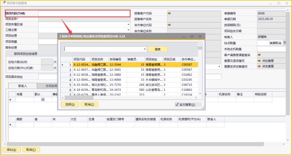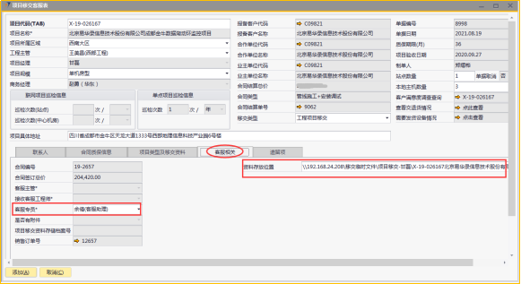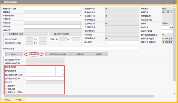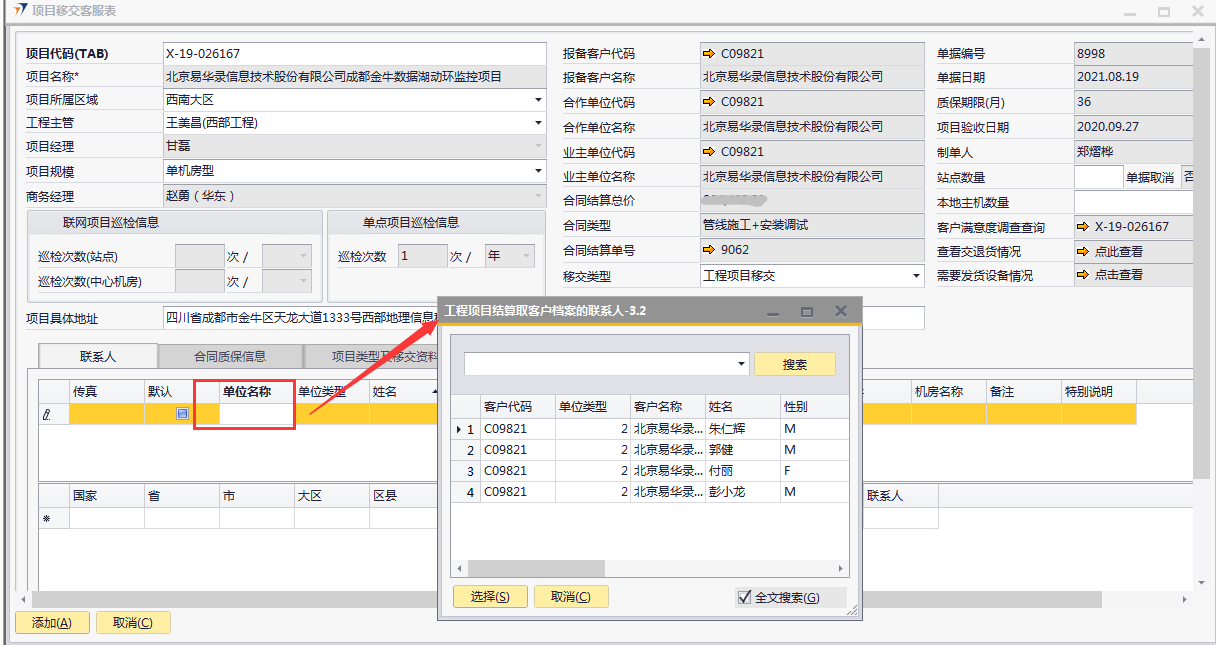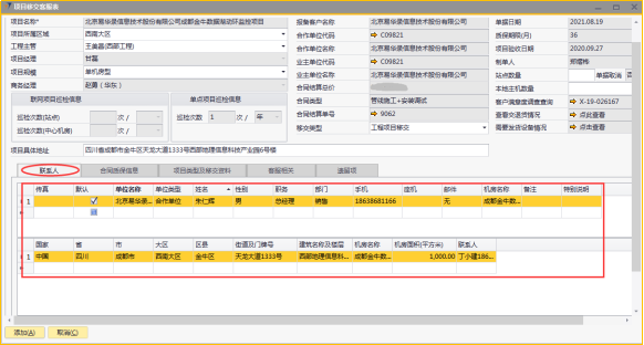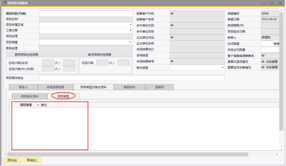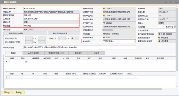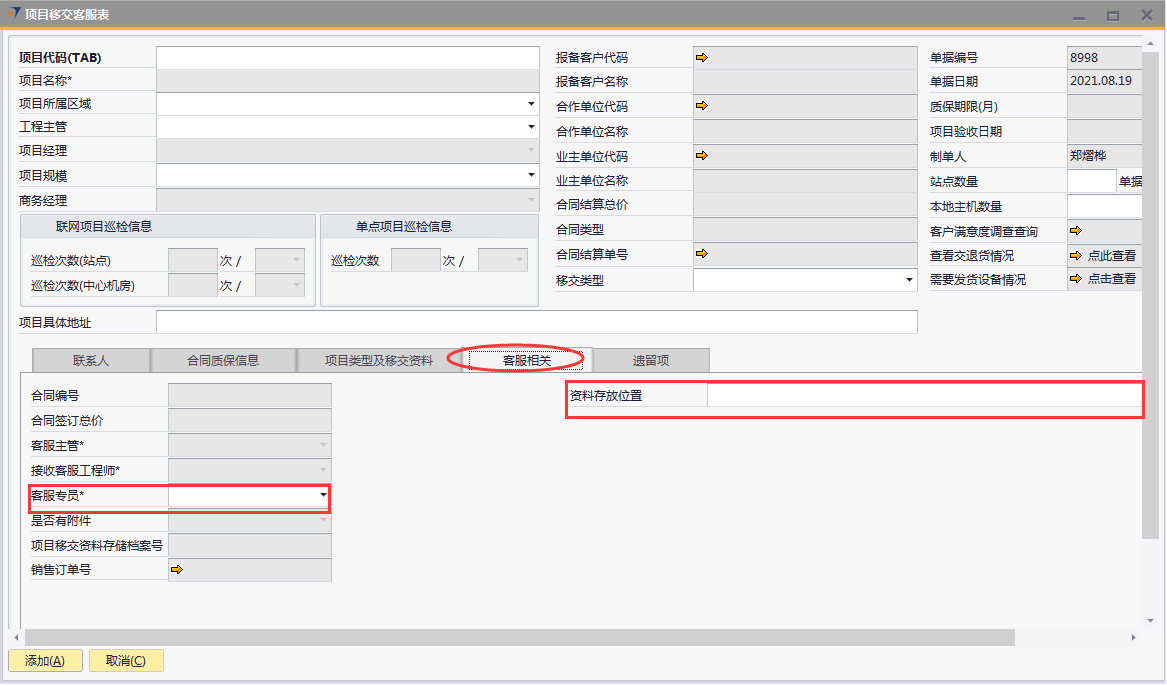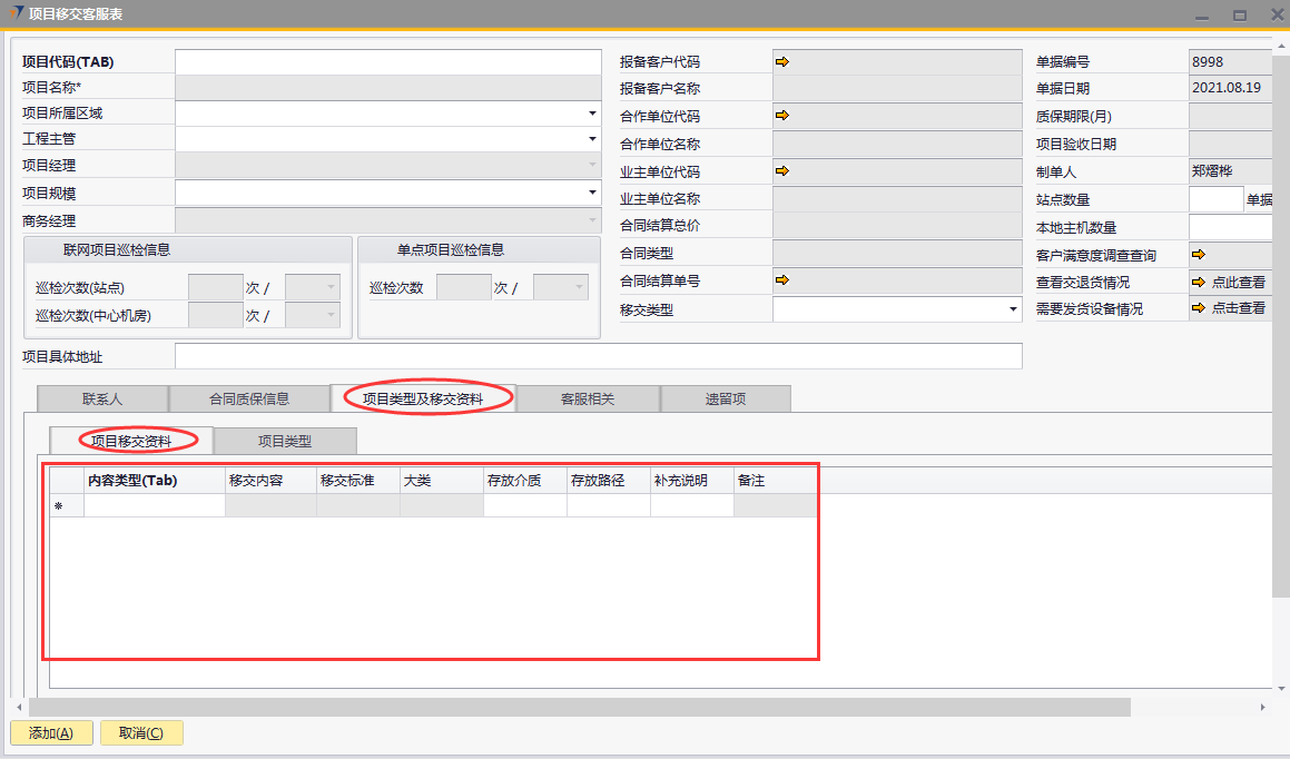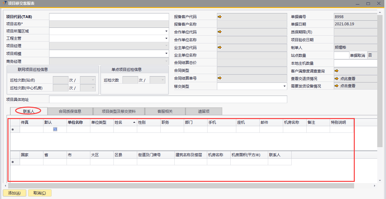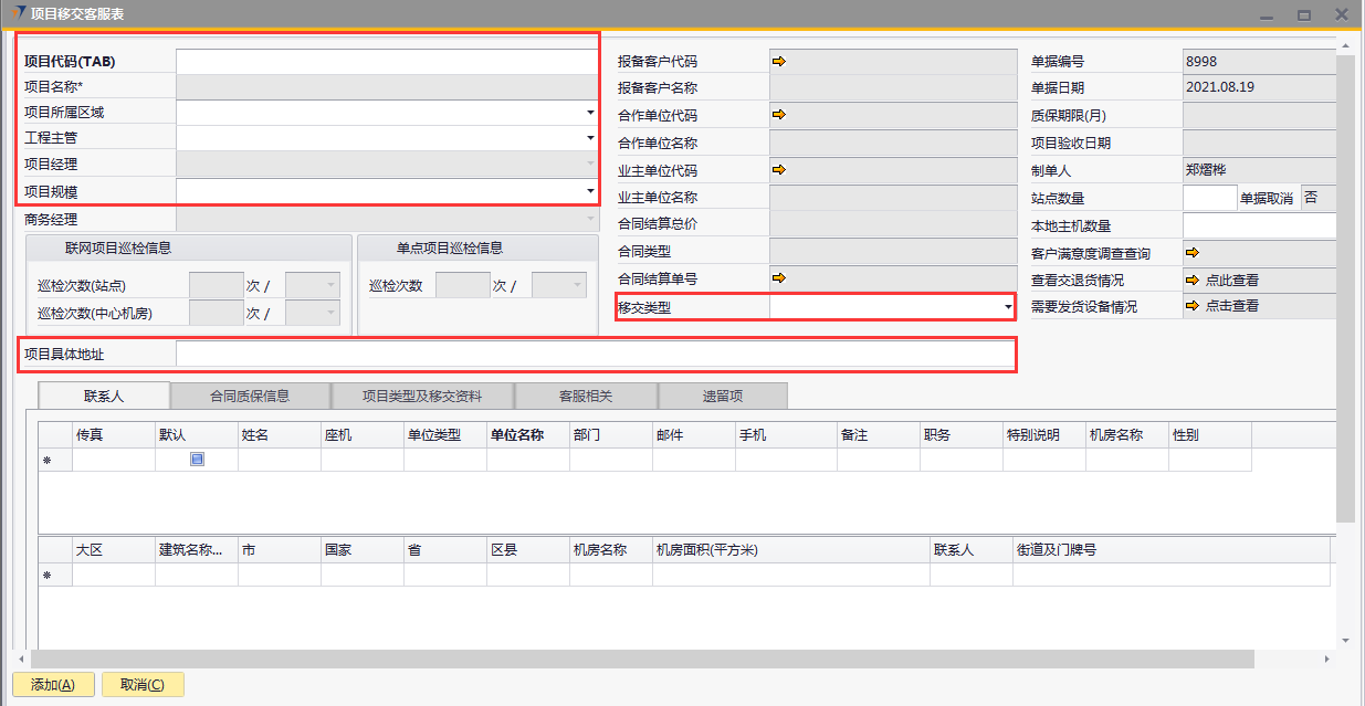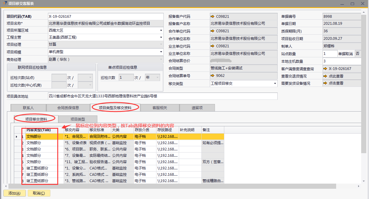 # 1 目的与作用 为了指导和规范工程人员已结算项目移交给售后,提升效率,规范管理 # 2 界面介绍 路径:工程项目管理 → 项目移交客服表  # 3 操作说明 ## 3.1 表头  说明: * + **项目代码:**必填,按Tab选择,要移交售后的项目 + **项目所属于区域:**必填,项目所属区域 + **工程主管:**选填,如果不是买卖合同一定要录入工程主管 + **项目规模:**必填,项目规模 + **移交类型:**必填,项目移交类型 + **项目具体地址:**必填,项目具体地址 + **站点数量:**选填,项目站点总数 + **本地主机数量:**选填,本地主机总数 + **项目名称、项目经理、报备客户代码、报备客户名称、合作单位代码、合作单位名称、业主单位代码、业主单位名称、合同结算总价、合同类型、质保期限、项目验收日期、联网项目巡检信息、单点项目巡检信息:**系统默认自动带出,不能录入也不能修改 ## 3.2 表体 ## 3.2.1 联系人  说明: * + **单位类型:**必填,按Tab选择,选择联系人行 + **单位名称:**必填,Tab时会自动带出,联系人单位名称 + **姓名:**必填,Tab时会自动带出,联系人姓名 + **性别:**必填,Tab时会自动带出,联系人性别 + **部门:**必填,Tab时会自动带出,联系人部门 + **职务:**必填,Tab时会自动带出,联系人职务 + **手机:**必填,Tab时会自动带出,联系人手机 + **座机:**选填,Tab时会自动带出,联系人座机,可修改 + **邮件:**选填,Tab时会自动带出,联系人座机,可修改 + **机房名称:**必填,填写项目机房名称 + **备注:**选填,需要说明的相关事项 + **特别说明:**选填,需要特别说明的事项 + **国家:**必填,外包增减项变更最终成交价 + **省:**必填,外包增减项变更原因 + **市:**必填,项目所属市区 + **大区:**必填,项目所属大区 + **区县:**必填,项目所属区县 + **街道及门牌号:**必填,项目所属街道及门牌号 + **建筑名称及楼层:**必填,项目所在建筑名称和楼层 + **机房名称:**必填,项目机房名称 + **机房面积(平方米):**项目机房面积,以平方米为单位 + **联系人:**必填,机房联系人姓名 ## 3.2.2 合同质保信息  说明: * + **要求响应时限:**选填,要求响应时限 + **要求解决时限:**选填,要求解决时限 + **要求到达现场解决时限:**选填,要求到达现场时限 + **质保服务时间区间:**选填,质保服务时间区间 + **巡检次数:**选填,按实际情况填写 ## 3.2.3 项目类型及移交资料 项目移交资料  说明: 如果有移交资料,需要录入 * + **内容类型:**必填,按Tab选择移交资料类型 + **存放介质:**必填,选择内容类型时会自动带出,可修改 + **存放路径:**选填,存放的路径 + **补充说明:**选填,需要说明的相关事项 + **移交内容、移交标准、大类、备注:**选择内容类型时会自动带出,不能录入也不能修改 项目类型  说明: * + **项目类型:**选填,直接选择 + **备注:**需要说明的相关事项 ## 3.2.4 客服相关  说明: * + **客服专员:**必填,移交售后所属大区客服专员 + **资料存放位置:**选填,资料存放位置 ## 3.2.5 遗留项  说明: * + 此页签内容从项目对应的工程项目结算单带过来,如果结算单有数据,则这里会相应数据;如果结算单没数据,则这里也没有数据 ## 3.3 操作步骤 ### 3.3.1 录入表头信息 鼠标定位到项目代码(TAB),再按Tab键,会调取出来当前账号权限范围内所有可做移交的项目  关键字搜索或直接鼠标滚动查找本次要移交的项目,双击或左下方选择,选择项目  系统会带出来部分相关信息,手动录入工程主管、项目规模、移交类型  ### 3.3.2 录入表体信息 #### 3.3.2.1 录入联系人信息 鼠标定位到单位名称,按Tab选择,会调出来所有联系人相关信息  选择联系人,录入机房名称相关信息 录入国家、省、市、大区、区县、街道及门牌号、建筑名称及楼层、机房名称、机房面积、联系人相关信息  #### 3.3.2.2 录入合同质保信息  #### 3.3.2.3 录入项目类型及移交资料 鼠标定位到内容类型,按Tab选择移交资料内容,需要补充说明的,在补充说明字段录入  #### 3.3.2.4 录入客服相关 录入客服专员、资料存放位置  #### 3.3.2.5 遗留项检查 如果项目结算单里有遗留项,项目移交客服表里检查下遗留项是否带过来,数据是否准确 相关数据录入完整无误后,点左下方“添加”提交  # 4 注意事项 1. 只有有工程结算单的项目才能做项目移交客服表 2. 一个项目只允许做一次项目移交客服表