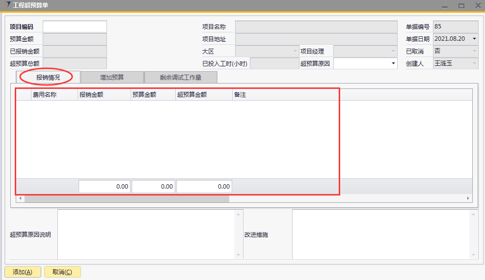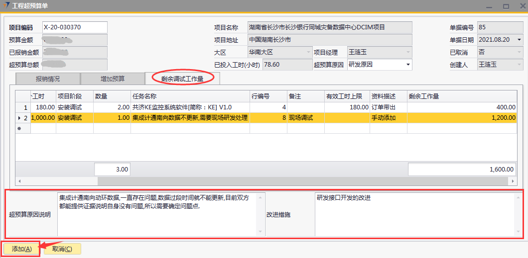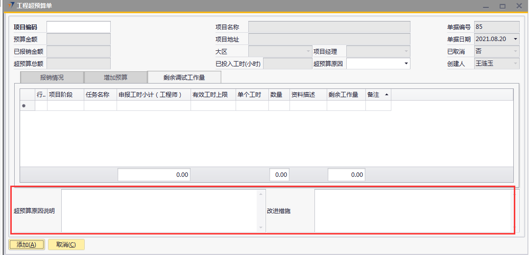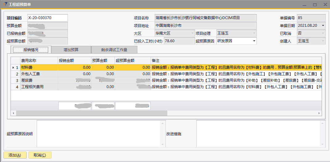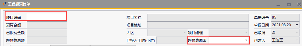 # 1 目的与作用 为了指导和规范工程人员工程超预算单录入,提升效率,规范管理 本单主要作用:自定义费用报销有超预算时,有工程超预算单可以关联,否则不允许提交自定义费用报销 # 2 界面介绍 路径:工程项目管理 → 工程超预算单  # 3 操作说明 ## 3.1 表头  说明: * + **项目代码:**必填,按Tab选择,费用超预算的项目 + **超预算原因:**必填,费用超预算的原因 + **项目名称、项目地址、项目经理、大区、预算金额、已报销金额、超预算总额:**选择项目编号后,系统默认自动带出,不能录入也不能修改 ## 3.2 表体 ### 3.2.1 报销情况 此页签内容在选择项目编号后会自动填充,不允许增加也不允许删除  说明: * + **费用名称:**必填,表头项目编码选择后,费用名称会自动填充 + **报销金额:**必填,表头项目编码选择后,报销金额会自动填充 + **预算金额:**必填,表头项目编码选择后,预算金额会自动填充 + **超预算金额:**必填,表头项目编码选择后,超预算金额会自动填充 + **备注:**必填,费用名称的说明,表头项目编码选择后,备注会自动填充 ### 3.2.2 增加预算  说明: * + **日期:**选填,预算发生日期 + **交通工具:**必填,出行交通工具 + **起止:**选填,从哪 + **终点:**选填,到哪 + **单位:**选填,交通工具单位 + **单价:**必填,搭乘交通工具单价 + **数量:**必填,需要的数量 + **总计:**必填,=单价*数量 + **备注:**选填,其他相关说明 ### 3.2.3 剩余调试工作量 此页签内容在选择项目编号后会自动填充,可手动增加删除修改  说明: * + **项目阶段:**必填,表头项目编码选择后,项目阶段自动填充 + **任务名称:**必填,表头项目编码选择后,任务名称自动填充 + **申报工时小计:**选填,表头项目编码选择后,申报工时小计自动填充 + **有效工时上限:**选填,表头项目编码选择后,有效工时上限自动填充 + **单个工时:**表头项目编码选择后,单个工时自动填充 + **数量:**表头项目编码选择后,数量自动填充 + **资料描述:**表头项目编码选择后,资料描述自动填充 + **剩余工作量:**表头项目编码选择后,剩余工作量自动填充 + **备注:**其他相关说明 ### 3.2.4 其他  说明: * + **超预算原因说明:**必填,项目超预算原因详细说明 + **改进措施:**选填,项目可以改进的措施 ## 3.3 操作步骤 ### 3.3.1 录入表头信息 鼠标定位到项目代码(TAB),再按Tab键,会调取出来当前账号权限范围内所有可做超预算单的项目  关键字搜索或直接鼠标滚动查找本次要移交的项目,双击或左下方选择,选择项目  系统会带出来相关信息,手动录入超预算原因  ### 3.3.2 录入表体信息 #### 3.3.2.1 检查报销情况 表头项目代码选择后,报销情况明细会自动填充,检查报销情况  #### 3.3.2.2 录入增加预算 录入增加预算明细行数据  #### 3.3.2.3 检查剩余调试工作量 表头项目代码选择后,报销情况明细会自动填充,检查报销情况 如果需要修改,可修改  #### 3.3.2.4 录入其他 录入超预算原因说明、改进措施,所有信息录入完整无误后,点“添加”提交  # 4 注意事项 一个项目只允许做一次工程超预算单