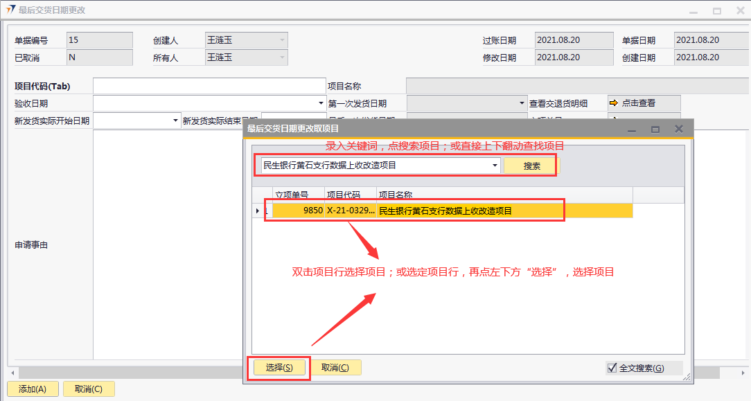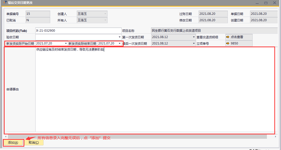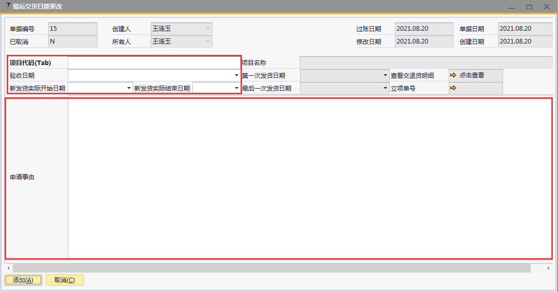 # 1 目的与作用 为了指导和规范工程人员最后交货日期更改,提升效率,规范管理 # 2 界面介绍 路径:工程项目管理 → 最后交货日期更改  # 3 操作说明 ## 3.1 表单  说明: * + **项目代码:**必填,按Tab选择,要更新发货日期的项目 + **验收日期:**选填,项目已经验收的日期 + **新发货实际开始日期:**必填,新的发货实际开始日期 + **新发货实际结束日期:**必填,新的发货实际结束日期 + **项目名称、第一次发货日期、最后一次发货日期、立项单号:**选择项目代码后,系统默认自动带出,不能录入也不能修改 + **申请事由:**必填,申请更改最后交货日期的原因 ## 3.2 操作说明 鼠标定位到项目代码(Tab),再按Tab键,会调取出来当前账号权限范围内所有可更新交货日期的项目  关键字搜索或直接鼠标滚动查找本次要更新的项目,双击或左下方选择,选择项目  系统会出来相关信息,录入新发货实际开始日期、新发货实际结束日期,申请事由,全部信息录入完整无误后,点“添加”提交  # 4 注意事项 无