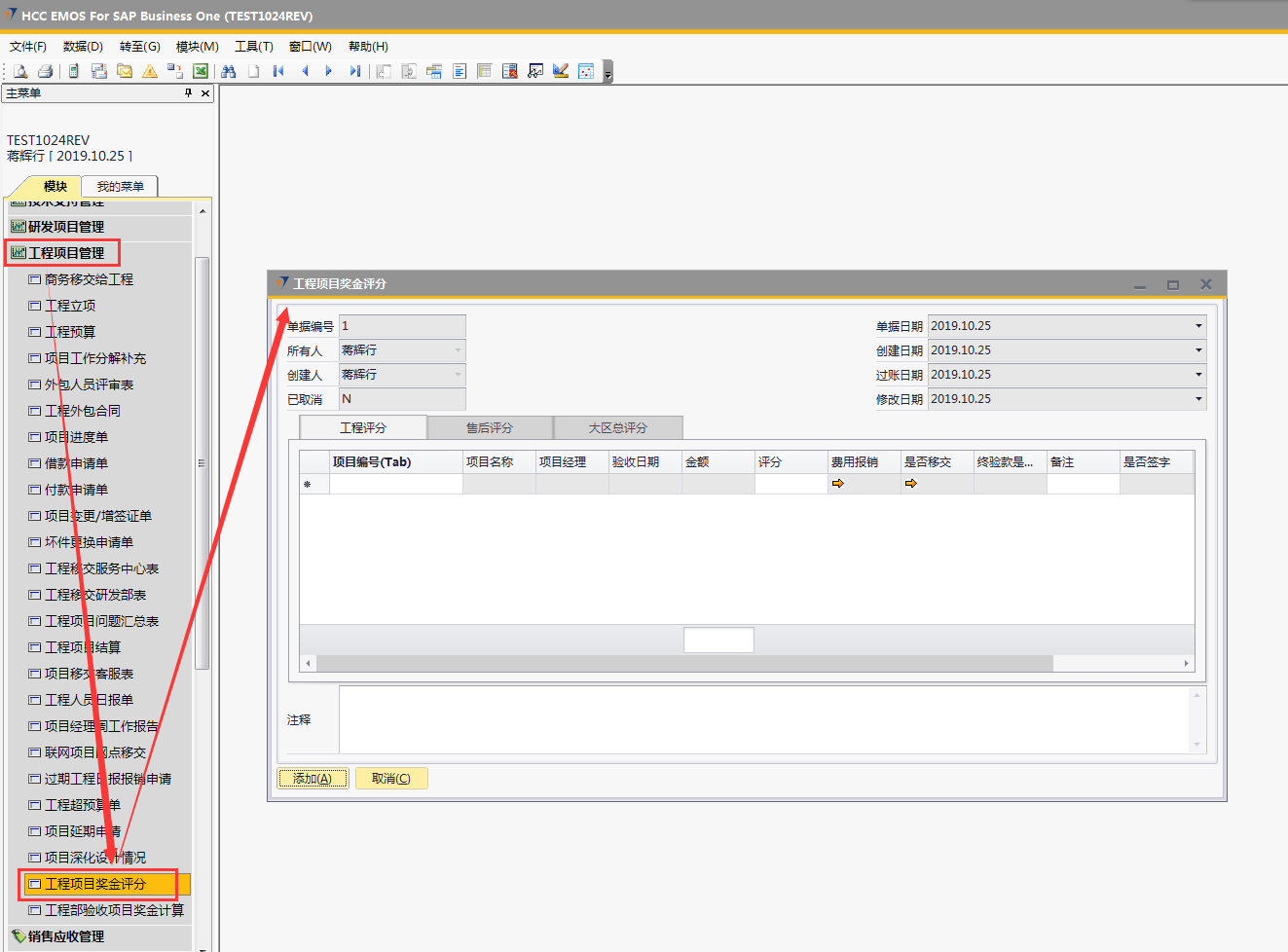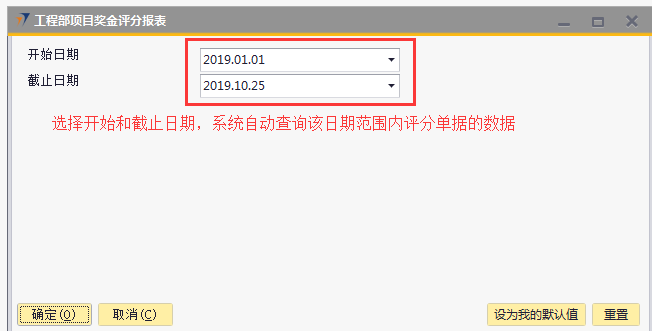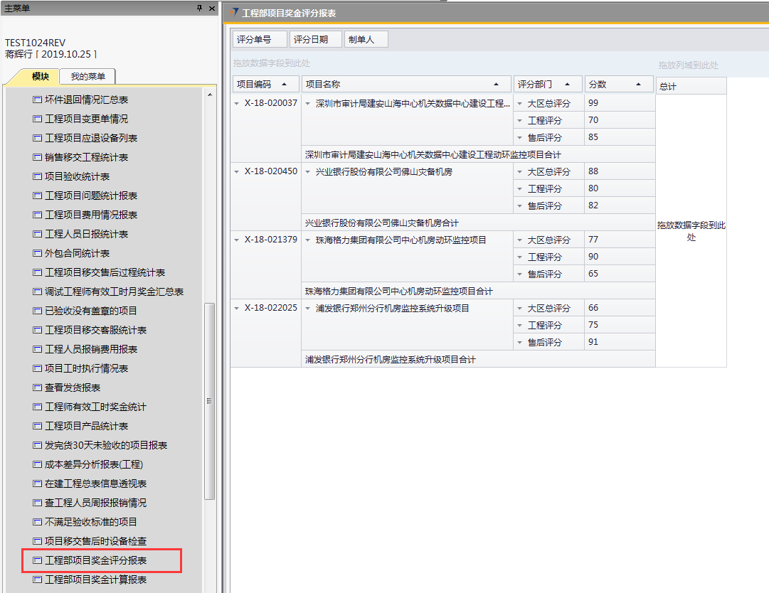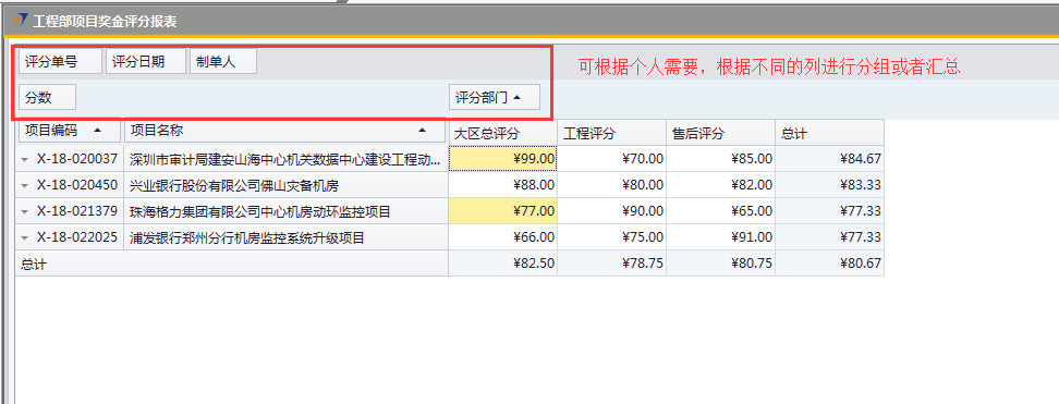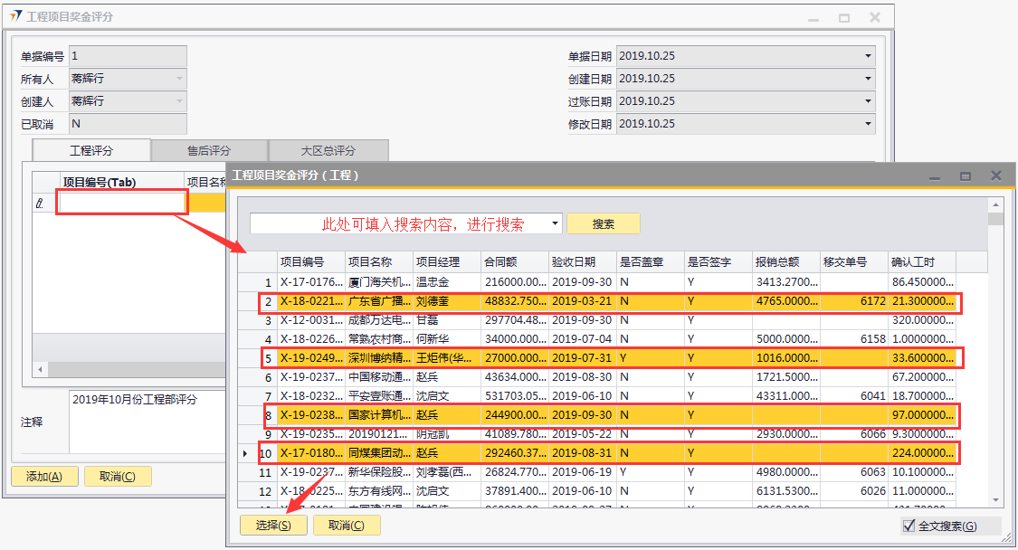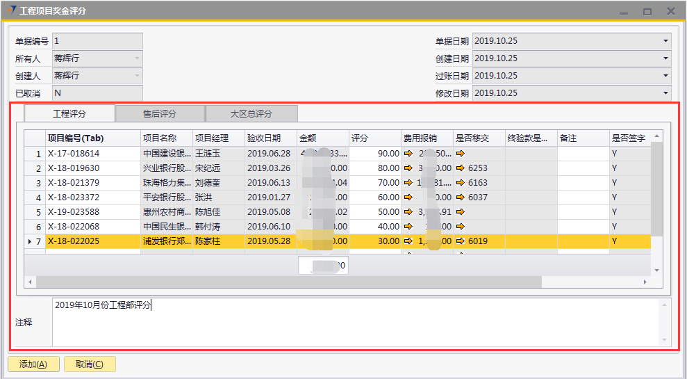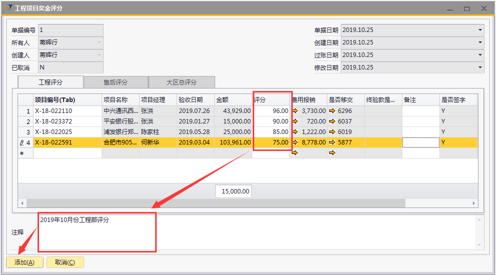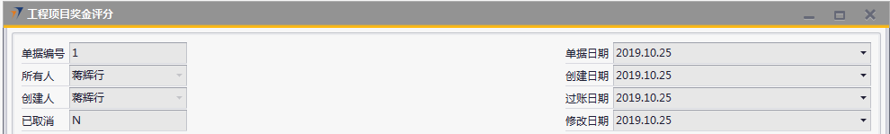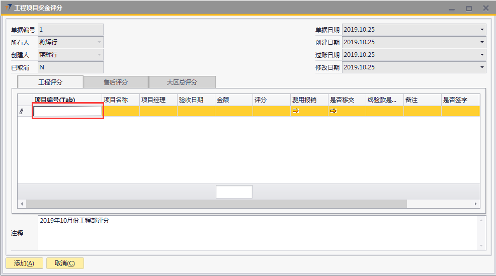 # 1 目的与作用 指导和规范相关人员工程项目奖金评分操作,准确快捷地录入内容,提升工作效率。 # 2 界面介绍 ## 2.1 路径 工程项目管理 → 工程项目奖金评分  ## 2.2 表头  说明: * + **创建人、所有人、单据编号、单据日期、创建日期、过账日期、修改日期、已取消:**系统默认,不需要录入,也不允许修改 ## 2.3 表体 此单据表体有3个页签,每个部门或领导进入到对应的页签填入评分内容即可。  说明: * + **项目编号(Tab):按**Tab键选择,必录,要评分的项目代码; + **项目名称:**根据选择的项目编号自动填入,项目的名称; + **项目经理:**根据选择的项目编号自动填入,此项目的项目经理姓名; + **验收日期:**根据选择的项目编号自动填入,项目验收的时间; + **金额:**根据选择的项目编号自动填入,该项目变更后的合同金额; + **费用报销:**根据选择的项目编号自动填入,该项目报销的费用金额; + **是否移交:**根据选择的项目编号自动填入,该项目管理的移交客服的单据号码; + **是否签字、是否盖章:**根据选择的项目编号自动填入,该项目的签字、盖章状态; + **工时数:**根据选择的项目编号自动填入,必录,该项目的确认工时数; + **评分:**各部门或领导在对应页签、对应的项目行填入真实有效的评分数值,数值范围为0-100分; + **注释:**当前评分单据的整体说明、备注字段,必录; + **备注:**选填,该项目行的评分备注说明; + **说明:同一项目、同一部门/领导不允许重复评分。** # 3 操作方法 具体评分准则请参考公司颁布的【2019年工程项目经理激励政策】! 1)将光标定位在【项目编号(Tab)】处按TAB键 ;(以工程评分为例,其他页签操作方法一致)  2)在弹出来的对话框中,选择要评分的项目,可按项目编号或者项目名称搜索,支持模糊查询;也可一次性选择多个项目(按Ctrl键,然后点击鼠标左键,可以间隔多选;先选中开始行,然后按Shift键,然后鼠标左键点到想要选取的结束位置,可以连续多选);最后点击【选择】按钮,系统将选中的项目带到单据体中;  3)给对应的项目评分,在评分列填入分数; 注意:每个项目的评分不允许超过100分,每个项目在同一个页签不允许重复评分!  # 4 报表操作 ## 4.1 报表操作说明 1. 路径 自定义报表 → 工程部报表 → 工程部项目奖金评分报表  1. 操作方法   # 5 注意事项 ## 5.1 注意事项说明 工程、售后、大区总相关人员必须及时评分,否则奖金计算出来的数据为0。