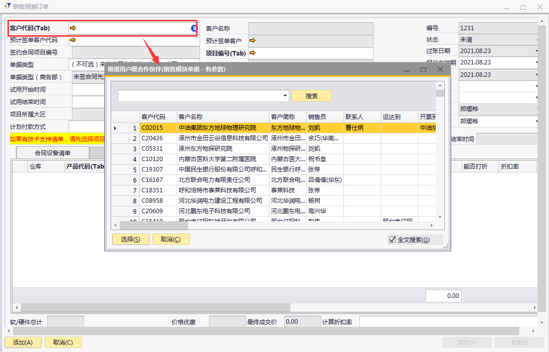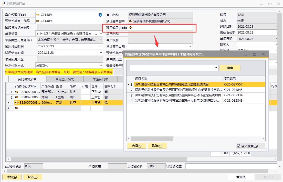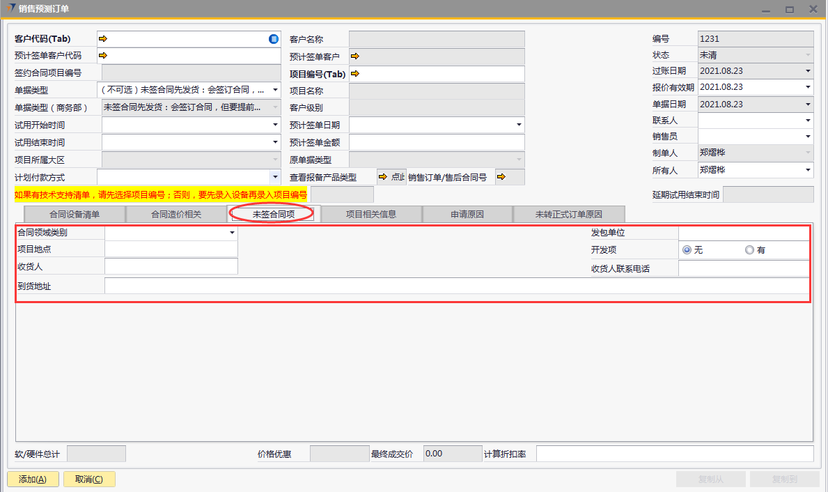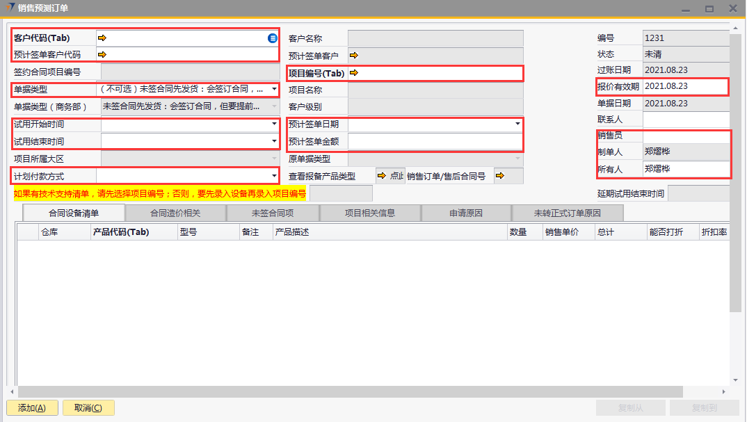 # 1 目的与作用 为了指导和规范销售、客服人员销售预测订单录入,提升效率,规范管理 # 2 界面介绍 路径:销售应收管理 → 销售预测订单  # 3 操作说明 ## 3.1 表头  说明: * + **客户代码:**必填,按Tab选择,报备客户代码。必须先录入客户代码,才能添加合同设备清单,才能调取到客户对应报备的项目代码和相关信息 + **预计签单客户代码:**必填,按Tab选择,预计签单客户代码 + **项目代码:**必填,按Tab选择,系统会读取出销售预测单所录客户报备的且没有销售订单的所有项目 + **单据类型:**必填,按实际情况选择,不要选择有“不可选”三个字的单据类型 + **单据类型(商务部):**必填,跟单据类型一致,选择单据类型时系统会自动刷新过来 + **试用开始时间:**必填,设备试用开始时间 + **试用结束时间:**必填,设备试用结束时间 + **预计签单日期:**必填,项目预计签单日期,选择项目编码后,系统默认自动带出,可修改 + **预计签单金额:**必填,项目预计签单金额,选择项目编码后,系统默认自动带出,可修改 + **计划付款方式:**必填,项目计划付款方式 + **报价有效期:**选填,报价有效期 + **销售员:**必填,项目对应销售经理,销售员必须跟所有人一致 + **所有人:**必填,项目对应所有人,所有人必须跟销售员一致 + **客户名称、预计签单客户、项目名称、项目所属大区:**选择项目编码后,系统默认自动带出,不能录入也不能修改 ## 3.2 表体 ### 3.2.1 合同设备清单  说明: * + **产品代码:**必填,按Tab选择,选择坏件设备代码 + **软/硬件:**必填,选择产品代码后,系统默认自动带出,不能录入也不能修改 + **能否打折:**必填,选择产品代码后,系统默认自动带出,不能录入也不能修改 + **数量:**必填,需要数量 + **销售单价:**选填,销售价格,销售预测订单中销售单价没有实际参考意义 + **总计:**必填,= 数量 *销售单价 + **是否客户自购:**选填,是否客户自购,默认为**否** + **折扣率:**选填,产品折扣率 + **仓库:**必填,设备所在仓库,默认为**正常仓** + **备注:**选填,需要说明的事项 + **产品描述、型号、品牌、单位价格、标准价、标准价总计:**选择产品代码后,系统默认自动带出,不能录入也不能修改 + **软/硬件总计:**系统自动计算,不能录入也不能修改 + **价格优惠:**系统自动计算,不能录入也不能修改 + **最终成交价:**系统自动计算,不能录入也不能修改 + **计算折扣率:**选填,折扣率 ### 3.2.2 合同造价相关  说明: * + 此页签内容没有实际参考意义,可暂时不用理会 ### 3.2.3 未签合同项  说明: * + **合同领域类别:**必填,选择合同领域类别 + **项目地点:**必填,录入项目地点 + **收货人:**必填,录入收货人姓名 + **到货地址:**必填,录入到货地址 + **发包单位:**必填,录入发包单位名称 + **开发项:**选填,是否有开发项,默认为无 + **收货人联系电话:**必填,收货人联系电话 ### 3.2.4 项目相关信息  说明: * + 此页签可查看项目相关信息,只做查询用,不用录入 ### 3.2.5 申请原因  说明: * + **申请原因:**必填,申请走销售预测订单的原因 ### 3.2.6 未转正式订单原因  说明: * + 此页签内容由市场部陈佳维护,新建时,不允许录入 ## 3.3 操作步骤 如果有技术支持清单,请先选择项目编号,再录入明细行 如果没有技术支持清单,请先录入明细行设备,再选项目编号 必须先录入客户代码,才能增加明细行,才能选择项目 本次以项目没有技术支持请单为例 ### 3.3.1 录入表头客户代码等信息 鼠标定位到**客户代码(Tab)**,再按Tab键,会调取出来当前账号权限范围内所有客户信息  关键字搜索或直接鼠标滚动查找本次要做预测订单的客户,双击或左下方选择,选择客户,录入试用开始时间、试用结束时间、计划付款方式  ### 3.3.2 录入表体信息 #### 3.3.2.1 合同设备清单 鼠标定位到产品代码,按Tab选择,选择要发货的设备,录入数量  #### 3.3.2.2 合同设备清单 录入合同领域类别、项目地点、收货人、到货地址、发包单位、收货人联系电话  #### 3.3.2.3 申请原因 录入申请原因  ### 3.3.3 录入表头项目代码等信息 鼠标定位到**项目编号**,将出来客户相关联的还没有销售订单的新项目报备项目  选择本次预测订单项目,系统会自动带过来预计签单日期、预计签单金额,录入单据类型,所有信息录入完整无误后,点“添加”提交  # 4 注意事项 无