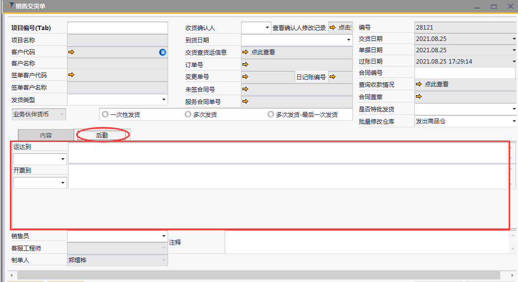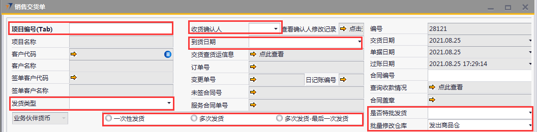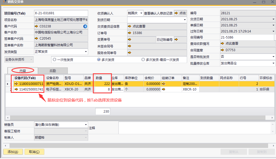 # 1 目的与作用 为了指导和规范PMC销售交货单录入,提升效率,规范管理 # 2 界面介绍 路径:销售应收管理 → 销售交货单  # 3 操作说明 ## 3.1 表头  说明: * + **项目编号:**必填,按Tab选择,销售交货项目 + **发货类型:**必填,发货类型 + **收货确认人:**必填:收货确认人 + **到货日期:**选填,到货日期 + **是否特批发货:**必填,项目是否特批发货 + **一次性发货、多次发货、多次发货-最后一次发货:**至少选择一个 + **批量修改仓库:**默认发出商品仓,如果需要批量修改发货仓名,请在明细行录入后,再在批量修改仓库选择对应的发货仓 + **项目名称、客户代码、客户名称、签单客户代码、签单客户名称:**选择项目编号时,系统默认自动带出,不能录入也不能修改 ## 3.2 表体 ### 3.2.1 内容  说明: * + **设备代码:**必填,发货设备代码 + **数量:**必填,发货数量 + **仓库:**必填,默认为发出商品仓,可明细行修改或表头批量修改 + **备注:**选填,需要说明的事项 + **设备名称、型号、品牌、库存单位:**选择设备代码时,系统默认自动带出,不能录入也不能修改 ### 3.2.2 后勤  说明: * + **运达到:**选填,货运达到的地方 + **开票到:**选填,货物开票地址 ### 3.2.3 其他  说明: * + **销售员:**必填,项目编号选择后,系统默认自动带出,可修改 + **注释:**选填,需要说明的事项 ## 3.3 操作步骤 ### 3.3.1 录入表头信息 鼠标定位到项目编号(Tab),再按Tab键,会调取出来当前账号权限范围内的所有可做销售交货单的项目  关键字搜索或直接鼠标滚动查找本次要发货项目,双击或左下方**选择**,选择项目  系统会带出来项目编号等相关信息,手动录入发货类型、收货确认人、是否特批发货  ### 3.3.2 录入表体信息 #### 3.3.2.1 录入内容 鼠标定位到设备代码,按Tab选择发货设备,录入数量  #### 3.3.2.2 录入后勤 录入运达到,检查销售员,如果需要说明其他事项请在注释说明  # 4 注意事项 无