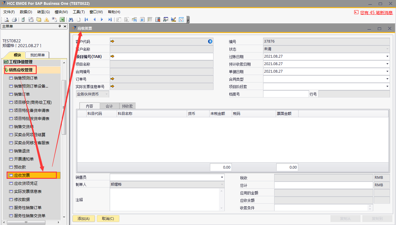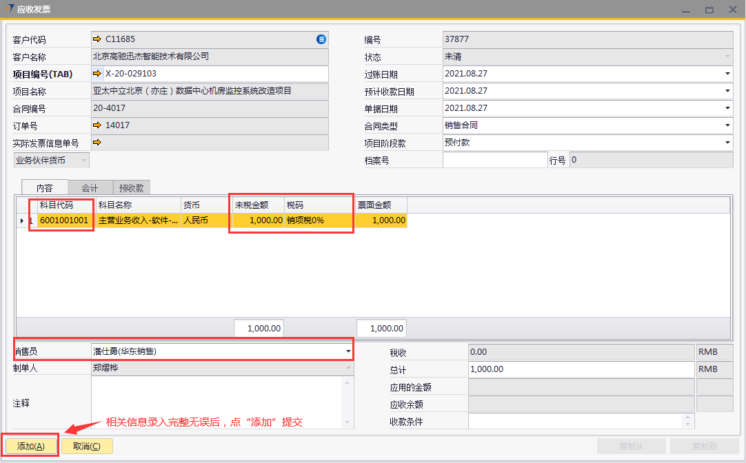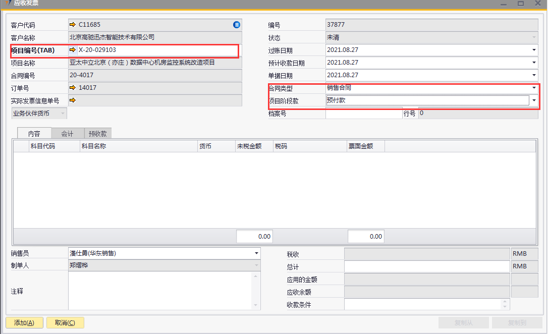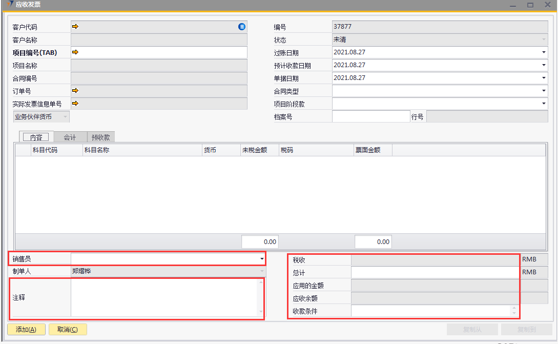 # 1 目的与作用 为了指导和规范财务人员应收发票录入,提升效率,规范管理 # 2 界面介绍 路径:销售应收管理 → 应收发票  # 3 操作说明 ## 3.1 表头  说明: * + **项目编号:**必填,按Tab选择,立应收项目 + **合同类型:**必填,有销售合同和维护合同可选 + **项目阶段款:**必填,项目哪个阶段的应收款 + **过账日期、预计收款日期、单据日期:**必填,系统默认当天日期,如需要修改可修改 ## 3.2 表体 ### 3.2.1 内容  说明: * + **科目代码:**必填,按Tab选择,应收科目代码 + **科目名称:**必填,跟科目代码一起带出,不能录入也不能修改 + **货币:**必填,默认为人民币,不是外币需要修改 + **税码:**必填,税率,默认为0%,可修改 + **未税金额:**必填,未税金额 + **票面金额:**必填,= 未税金额*(1+税码) ### 3.2.2 会计  说明: * + 此页签内容不需要手工录入 ### 3.2.3 预收款  说明: * + 此页签内容暂时未启用,不需要手工录入 ## 3.3 其他  说明: * + **销售员:**必填,选择项目编号时,系统会自动带出,可修改 + **注释:**选填,需要说明的相关事项 + **税收、应用的金额、应收余额:**系统自动带出,明细行中金额改变会对应改变,不能录入也不可修改 + **总计:**必填,系统自动计算 + **收款条件:**选填,收款相关条件 ## 3.4 操作步骤 ### 3.4.1 录入表头信息 鼠标定位到项目编号(Tab),再按Tab键,会调取出来当前账号权限范围内的所有可做应收发票的项目  关键字搜索或直接鼠标滚动查找本次要录应收发票项目,双击或左下方**选择**,选择项目  系统会带出来项目编号等相关信息,手动录入合同类型、项目阶段款  ### 3.4.2 录入表体和其他信息 右键增加明细行,录入科目代码、未税金额、税码,检查销售员、总计,信息录入完整无误后,点“添加”提交  # 4 注意事项 无