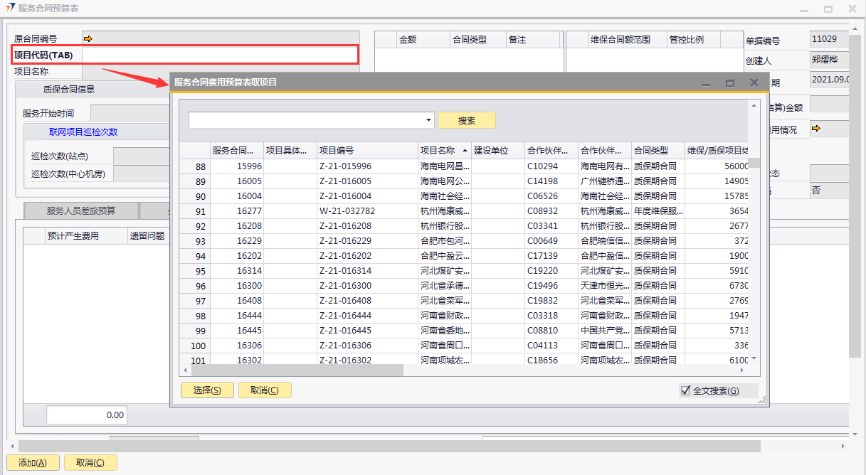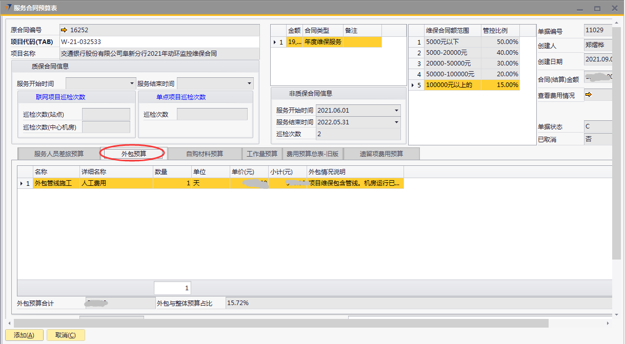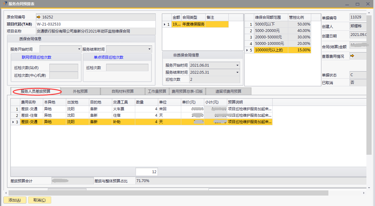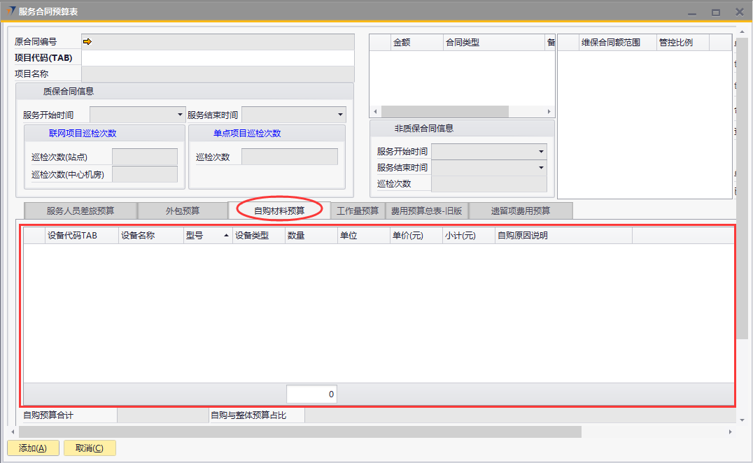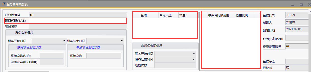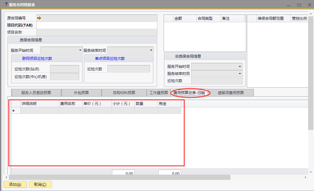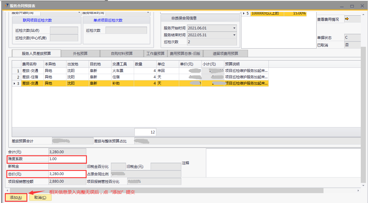 # 1 目的与作用 为了指导和规范售后人员服务合同预算单录入,提升效率,规范管理 # 2 界面介绍 路径:售后服务管理 → 售后服务 → 服务合同预算表  # 3 操作说明 ## 3.1 表头  说明: * + **项目代码:**必填,按Tab选择,选择要做预算的项目 + **项目名称、合同类型部分、管控比例部分、质保合同信息、非质保合同信息、巡检次数:**选择项目时系统会自动带出,不能录入也不能修改 ## 3.2 表体 ### 3.2.1 服务人员差旅预算  说明: * + **费用名称:**必填,费用名称 + **本异地:**选填,本地还是异地出差 + **出发地:**选填,出发地 + **目的地:**选填,目的地 + **交通工具:**选填,搭乘的交通工具 + **数量:**必填,搭乘的交通工具数量 + **单位:**必填,搭乘的交通工具单位 + **单价(元):**必填,搭乘的交通工具单价 + **小计(元):**必填,系统自动计算,= 数量*单价(元) + **预算说明:**选填,预算情况说明 ### 3.2.2 外包预算  说明: * + **名称:**必填,费用名称 + **详细名称:**选填,详细的费用名称 + **数量:**必填,搭乘的交通工具数量 + **单位:**必填,搭乘的交通工具单位 + **单价(元):**必填,搭乘的交通工具单价 + **小计(元):**必填,系统自动计算,= 数量*单价(元) + **外包情况说明:**选填,外包情况说明 ### 3.2.3 自购材料预算  说明: * + **设备代码:**必填,按Tab选择 + **设备名称、型号:**选择设备代码时,系统会默认带出,可修改 + **设备类型:**必填,设备类型 + **数量:**必填,设备数量,只能是数字,按实际录入 + **单位:**选填,设备的单位 + **单价(元):**必填,设备单价,以元为单位,按实际录入 + **小计(元):**必填,系统自动计算,=数量*单价(元) + **自购原因说明:**选填,自购原因说明 ### 3.2.4 工作量预算  说明: * + **名称:**必填,工作名称 + **本/异地:**必填,本地还是异地 + **类型:**必填,工作类型 + **数量:**必填,工作数量 + **单位工作量(H):**必填,单位工作量 + **工作量合计:=** 数量*单位工作量 + **单价(元):**默认为100,不能录入也不能修改 + **小计(元):=** 数量*单位工作量*单价(元) + **详细说明:**选填,详细说明 ### 3.2.5 费用预算总表-旧版  说明: * + 此页签内容仅供查询以前相关数据,不做录入使用 ### 3.2.6 遗留项费用预算  说明: * + 此页签内容从工程项目结算单遗留项取出,如果所选项目有数据,会自动带过来 ### 3.2.7 其他  说明: * + **难度系数:**必填,项目难度系数 + **总价:**必填,预算总价 + **注释:**需要说明的其他事项 + **新税金、项目报销管控额、项目报销管控百分比:**系统自动计算,不能录入也不能修改 ## 3.3 操作步骤 ###3.3.1 录入表头信息 鼠标定位到项目编号(Tab),再按Tab键,会调取出来当前账号权限范围内的所有可做预算单的项目  关键字搜索或直接鼠标滚动查找本次要做预算的项目,双击或左下方**选择**,选择立项的项目  选择项目后,鼠标在任意地方点击下,会出来相关信息  ### 3.3.2 录入表体信息 #### 3.3.2.1 录入服务人员差旅预算 录入服务人员差旅预算  #### 3.3.2.2 录入外包预算 录入外包预算  #### 3.3.2.3 录入自购材料预算 录入自购材料预算(如果没有自购设备,不录入)  #### 3.3.2.4 录入工作量预算 录入工作量预算  #### 3.3.2.5 录入其他 录入难度系统、总价(元),相关信息录入完整无误后,点“添加”提交  # 4 注意事项 一个项目只能做一次服务合同预算