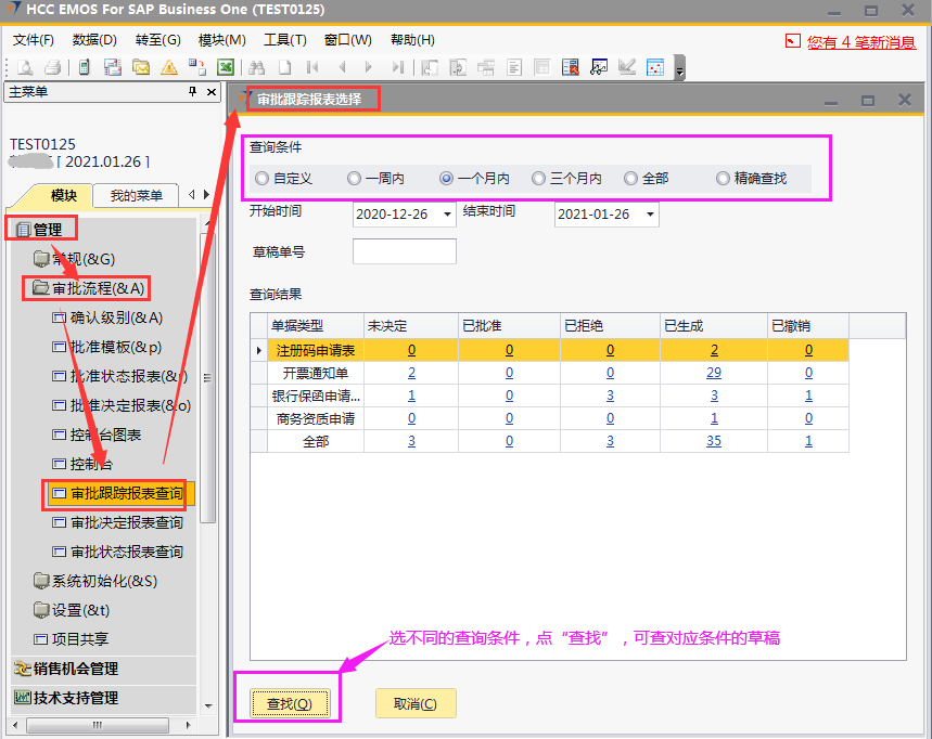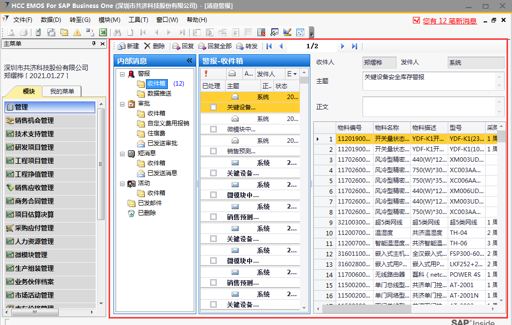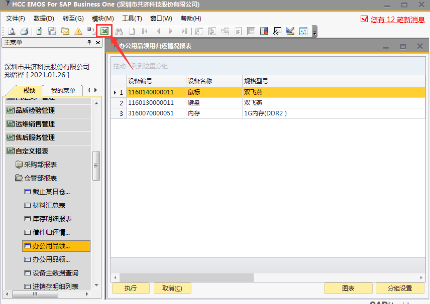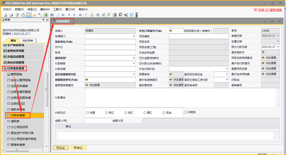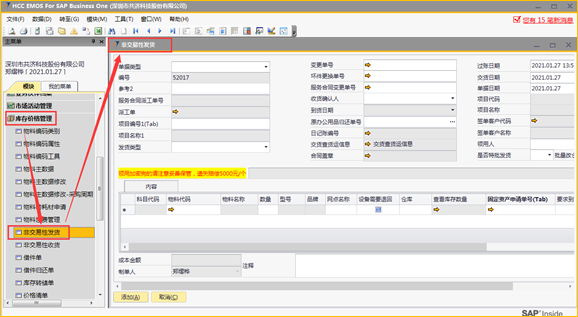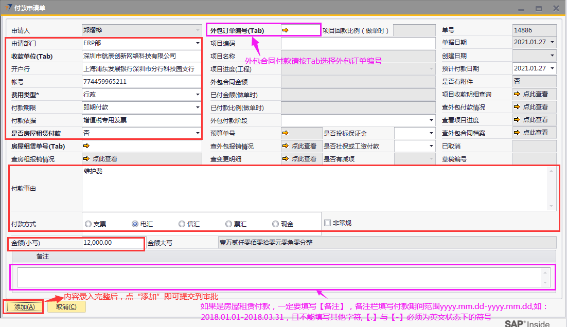# 1 目的与作用 为了指导和规范新进员工ERP操作 # 2 ERP常规说明 ## 2.1 账号获取 新员工登录企业微信后,会收到一条**应用系统账号提醒**的消息推送,内容有ERP账号和密码信息、ERP客户端下载地址  ## 2.2 安装文件和配置文件获取 1. 企业微信 → 工作台 → 微盘 → ERP安装包 <https://drive.weixin.qq.com/s?k=AGEAIQdLAA0qumM1CUAOYAbQaKABE>  2. EDOC → 文档 → 03信息化部 → ERP部 → ERPERP-WJ-01 → ERP安装文件 <http://edoc2.xbrother.com:8086/default.aspx?token=2b34a19d-b3ab-4e5f-a9de-d85b07d9d7ed#doc/fld/793>  ## 2.3 软件安装 双击安装文件,除了下面两步骤需要选择外,其他步骤直接点击下一步直到安装完成 1. 许可协议选择“我同意该许可协议的条款”  2. 选项处选择“客户端安装”  ## 2.4 软件配置 安装完ERP程序后, 请将下载的配置文件,放到C:\Windows下,完成ERP配置 效果如下:  ## 2.5 密码修改 路径:管理 → 系统初始化 → 修改密码(自定义)  录入**新密码**、**确认新密码**,点击“添加”即可 ## 2.6 窗口重开 打开单据后,点右上方,关掉当前窗口,再重新打开单据,叫窗口重开  ## 2.7 重新启动 点工具栏,可重启ERP  ## 2.8 消息警报查看 点工具栏,可查看消息警报 或点“您有X笔消息”,也可查看消息警报  如下为效果图,请及时查看和留意警报 、审批及短消息内容  ## 2.9 数据导出 导出可导出报表、单据数据 **数据可导出的前提是:**用户必须有要导出单据或报表的权限,如果提示“不能进行此操作”,说明用户没有导出权限。ERP系统出于数据安全性考虑,导出权限管理比较严格,如果实在需要,请先找本部门管理人员反应沟通 打开要导出的单据或报表,点击工具栏,可导出数据  ## 2.10 单据上下翻页 打开单据,点工具栏,可实现上下翻页、查找第一张、查找最后一张操作  ## 2.11 保存草稿 单据如果不需要或不能直接添加,需要先保存草稿时,可另存为草稿 路径:文件 另存为草稿  会弹出来如下**草稿备注**对话框,录入草稿备注,点“确定”即可  ## 2.12 草稿查询 路径:管理 → 系统初始化 → 草稿单据  如果不选择单据,查询所有单据草稿;如果选择单据,查询该单据相关的草稿 草稿单不多的情况下,可不选单据直接查找  选中要打开的草稿单 双击选定的那一行,可打开草稿单;或点右下方**打开草稿单**,可打开草稿单  ## 2.13 单据提交后是否走审批 新建单据**添加**后,添加后会出现如下窗口,也就是需要审批。如果出现如下窗口,表示正常走流程;如果提交时没有弹出如下窗口,说明提交人此单据的流程可能没配置或没配置到位,请及时联系ERP部门人员反应情况  注:系统单据基本上提交后需要走流程,如费用报销、付款、非交易性收发货、固定资产申请等;极少单据不需要走流程,如项目任务单 ## 2.14 已提交审批单据状态查找 路径:管理 → 审批流程 → 审批跟踪报表查询  **单据状态说明:** **未决定:**表示还在走审批的单据 **已批准:**表示已经审批完成还没添加为正式单据 **已拒绝:**表示某个审批阶段,被审批人拒绝的单据 **已生成:**表示已经完成审批且已经添加为正式单据 **已撤销:**表示提单人自行撤销的单据 如要查找未审批的开票通知单流程已经到哪,点击开票通知单—未决定**对应的数字**,进入到审批跟踪报表,可看到未完成审批的单据  点击想查看的行,可看到单据的对应审批情况  ## 2.15 已提交审批草稿单据撤销 路径:管理 → 审批流程 → 审批跟踪报表查询  ## 2.16 已生成单据查找 1. 如果单据不多,可上下翻页查找 2. 如果单据多,可用单据编号、项目编号、项目名称等关键字段精确查找或模糊查找 以查找办公用品领用单为例 打开非交易性发货单,此单据打开时默认是“添加”状态  点工具栏切换到查找状态  录入查询条件:查询办公用品领用时,单据类型选择“办公用品领用”,录入领用人,点左下方“查找”  会出来对应领用人所有的办公用品领用单据  ## 2.17 关键词模糊查找 1. 如果只记得单据部分内容,可用关键词模糊查找 2. 如果只需要查找特定内容的所有单据,可用关键词模糊查找 3. 报表过滤时,可用关键词查找过滤 关键词前后加上**号,表示模糊查找。如想查找系统里项目名称有“招商银行”的所有工程立项,在项目名称栏位录入*招商银行* ,再点左下方“查找”,即可出来所有招商银行项目工程立项。 ## 2.18 数据过滤 报表里,选择要过滤的字段,可进行数据过滤。过滤时可选择具体值精确过滤,或关键词过滤 如要找办公用品领用明细报表,所有设备名称含**网卡**二字的行 先找到字段设备名称,鼠标定位到该字段上,字段右上方会出来倒三角,点倒三角  选“自定义”,可对关键词过滤  用户自定义过滤器录入条件,**类似于*网卡***,点左下方“确定”  会出来设备名称关键词是“网卡”的所有办公用品领用明细  ## 2.19 数据排序 报表或单据,有多行数据时,可按需求对字段进行数据排序 在打开的报表或单据上,找到要排序的字段,单击即可进行排序  # 3 常用单据录入 ## 3.1 费用报销申请 路径:日常事务管理→ 费用报销→ 费用报销申请  空白处右键,点击“添加行”  表头和明细行录入相关内容,点左下方“添加”即可  说明: * + **发生月份:**必录,系统默认为单据新建时当天月份,可修改 + **费用类型(表头):**必录,选择报销的费用类型 + **报销人:**必录,选择报销人 + **费用名称:**必录,按TAB选择。必须**先**录入**表