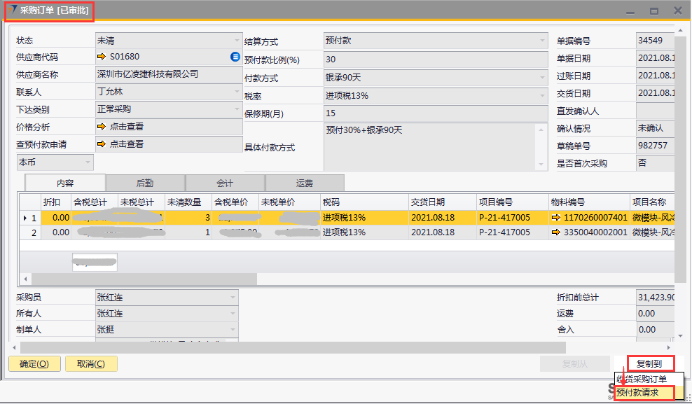 # 1 目的与作用 为了指导和规范采购人员预付款请求操作,提升效率,规范管理 # 2 界面介绍 路径:采购应付管理 → 预付款请求  # 3 操作说明 预付款请求操作有两种方法: 1. 打开采购订单,右下方点**复制到,**选择**预付款请求**。此方法只能针对当前打开的采购订单操作预付款请求 2. 打开预付款请求,录入要收货的供应商代码,点右下方**复制从**,选择**采购订单**。此方法可选择该供应商所有可做预付款请求的采购订单做预付款 ## 3.1 采购订单复制到预付款请求 1. 打开要做预付款的采购订单,右下方点**复制到**,选择**预付款请求**  2. 采购订单相关信息会带到预付款请求,修改预付款百分比**。**检查相关信息,确认无误后,点“添加”提交  ## 3.2 预付款请求复制从采购订单 1. 打开预付款请求,录入供应商代码,点右下方**复制从**采购订单  2. 将会弹出供应商所有可申请预付款的采购订单。如果只对一张采购订单申请预付款,选择要预付的采购订单,双击;如果对多张采购订单操作预付款,按住ctrl可不连续选择采购订单(或按住shift连续选择采购订单)  3. 默认状态,直接点**完成**  4. 修改预付款比例,检查相关信息,确认无误后点**添加**提交  # 4 注意事项 本系统不支持100%预付,如是100%预付,需要拆分成两张预付款单完成