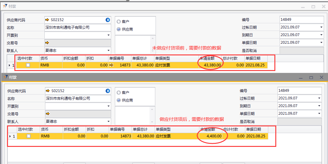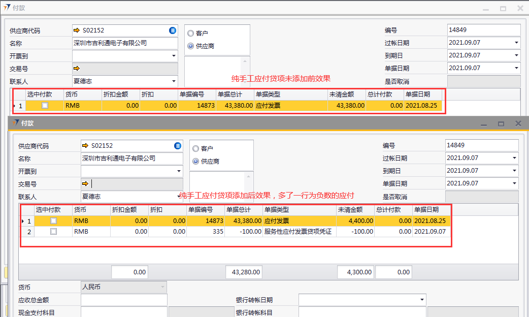 # 1 目的与作用 为了指导和规范采购人员应付贷项操作,提升效率,规范管理 # 2 界面介绍 路径:采购应付管理 → 应付贷项凭证  # 3 操作说明 应付贷项凭证操作有两种: 1. 应付发票复制到应付贷项凭证:此方法会扣库存,并会**自动扣除**该应付发票的应付金额 2. 纯手工录入应付贷项凭证:此方法会扣除库存,因为没有关联应付发票,所以**只会**在付款里体现应付金额的变化 ## 3.1 应付发票复制到应付贷项凭证 1. 打开要做应付贷项的应付发票,点**复制到**应付贷项凭证  2. 应付发票相关信息会带到应付发票,如果不是整单要提应付贷项,修改数量,检查总计等下关数据,确认无误后,点“添加”提交  3. 从应付发票复制过来的应付贷项添加后,库存会减少,因为没有关联应付发票,所以**只会**在付款里体现应付金额的变化。如下只截图应付贷项添加后的应付金额差异效果  ## 3.2 纯手工录入应付贷项凭证 1. 打开应付贷项凭证,录入供应商代码,录入物料代码、单价、税码、仓库,检查总计,相关信息录入完整无误后,点添加提交  2. 纯手工录入的应付贷项添加后,库存会减少,也会自动扣除应付发票的应付金额。如下只截图应付贷项添加后的应付金额差异效果  # 4 注意事项 无