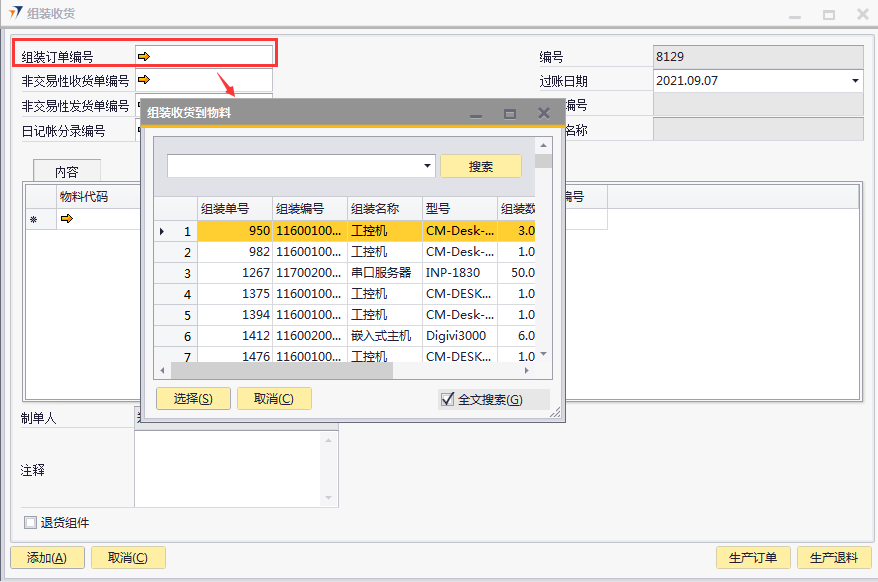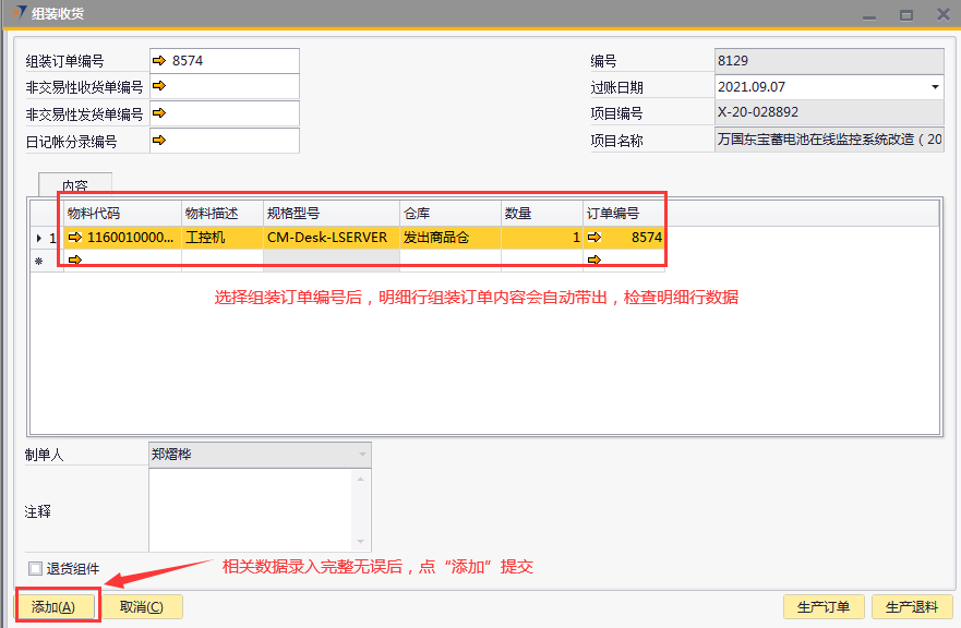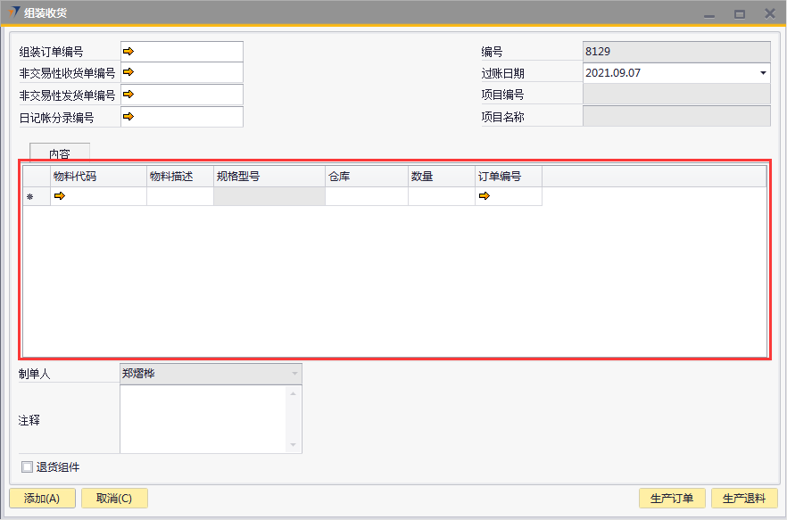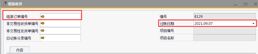 # 1 目的与作用 为了指导和规范生产制造相关人员组装收货录入,提升效率,规范管理 # 2 界面介绍 路径:生产组装管理 → 组装收货  # 3 操作说明 组装收货是基于组装订单的收货 ## 3.1 表头  说明: * + **组装订单号:**必填,按Tab选择,选择要收货的组装订单 + **非交易性收货单号:**组装收货单添加后,系统自动回写,不需要录入 + **非交易性发货单号:**组装收货单添加后,系统自动回写,不需要录入 + **日记账分录编号:**不需要录入 + **过账日期:**必填,系统默认为当天 + **项目编号、项目名称:**选择组装订单时系统会自动带出,不能录入也不能修改 ## 3.2 表体  说明: 选择组装订单编号,表体明细数据会自动带出 * + **物料代码:**必填,物料代码 + **物料描述、规格型号:**必填,选择物料代码时系统会自动带出 + **仓库:**必填,选择物料代码时系统会自动带出 + **数量:**必填,选择物料代码时系统会自动带出 + **订单编号:**必填,选择物料代码时系统会自动带出 ## 3.3 操作步骤 1. 鼠标定位到组装订单编号,再按Tab键,会调取出来当前账号权限范围内的所有可收货的组装订单  2. 关键词搜索或直接鼠标滚动查找本次要做收货的组装订单,双击选择或选中后点左下方**选择**,选择订单  3. 选择组装订单编号后,组装订单明细会一起带出,检查明细行数据。相关数据录入完整无误后,点“添加”提交  # 注意事项 无