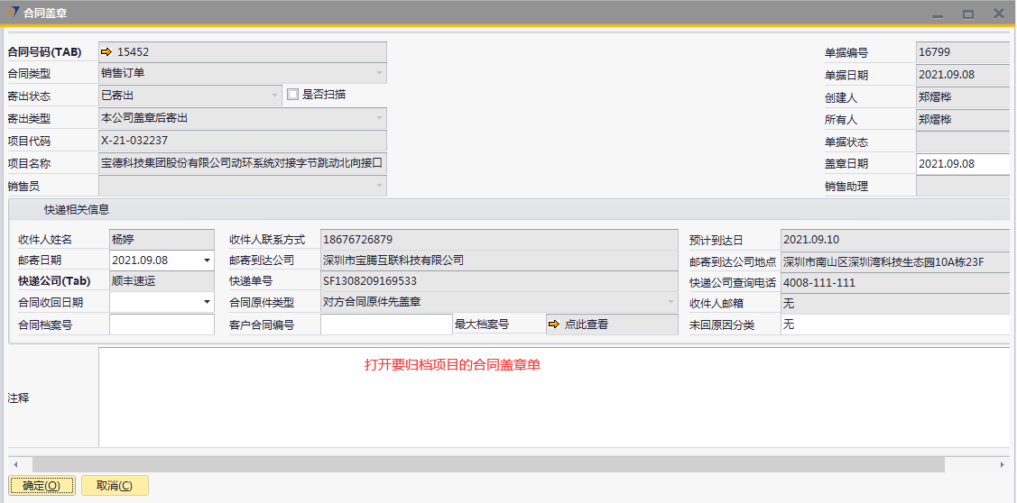 # 1 目的与作用 为了指导和规范合同管理相关人员合同盖章录入,提升效率,规范管理 # 2 界面介绍 路径:商务合同管理 → 合同盖章  # 3 操作说明 ## 3.1 表单  说明: * + **合同号码:**必填,按Tab选择,选择合同盖章项目 + **项目代码:**必填,选择合同号码后,系统会自动带出,不允录入也不允许修改 + **项目名称:**必填,选择合同号码后,系统会自动带出,不允录入也不允许修改 + **销售员:**选填,销售员姓名 + **盖章日期:**选填,合同盖章日期 + **销售助理:**选填,销售助理 + **合同类型:**必填,选择合同号码后,合同类型自动带出,有销售订单和售后服务合同两种 + **寄出状态:**必填,有已寄出、已送达、已返回三种 + **寄出类型:**必填,有本公司盖章后寄出、双方公司均已盖章后寄出两种 + **收件人姓名:**必填,选择合同号码后,收件人姓名会自动带出,可修改 + **收件人联系方式:**必填,选择合同号码后,收件人姓名会自动带出,可修改 + **邮寄日期:**必填,邮寄日期 + **邮寄到达公司:**必填,选择合同号码后,收件人姓名会自动带出,可修改 + **快递公司:**必填,默认为顺丰速运,可修改 + **快递单号:**必填,快递单号 + **预计到达日:**选填,快递预计到达日 + **邮寄到达公司地点:**必填,选择合同号码后,收件人姓名会自动带出,可修改 + **快递公司查询电话:**必填,默认为顺丰速运 + **合同收回日期:**如果是客户先盖章,新建时录入;如果不是客户先盖章,归档时录入 + **合同档案号:**如果是客户先盖章,新建时录入;如果不是客户先盖章,归档时录 + **客户合同编号:**如果是客户先盖章,新建时录入;如果不是客户先盖章,归档时录入 + **收件人邮箱:**选填,选择合同号码后,收件人姓名会自动带出,可修改 + **未回原因分类:**选填,未回原因 + **注释:**选填,需要说明的其他事项 ## 3.2 操作步骤 如果是客户先盖章,合同收回日期、合同档案号、客户合同编号新建时直接录入 如果不是客户先盖章,归档时再录入合同收回日期、合同档案号、客户合同编号 本次演示以不是客户先盖章为例 ### 3.2.1 合同盖章新建 1. 鼠标定位到合同号码,再按Tab键,会调取出来当前账号权限范围内的所有可做合同盖章的项目  2. 关键词搜索或直接鼠标滚动查找本次要合同盖章的项目,双击选择或选中后点左下方**选择**,选择项目  3. 选择合同号码后,项目代码、项目名称、收件人相关等信息会一起带出,检查数据,录入寄出状态、寄出类型、盖章日期、快递单号、预计到达日。相关数据录入完整无误后,点“添加”提交  ### 3.2.2 合同归档 1. 打开要归档的项目的合同盖章单  2. 录入合同收回日期、合同档案号、客户合同编号,然后点左下方“更新”保存即可  # 4 注意事项 同一项目只能录入一次合同盖章
