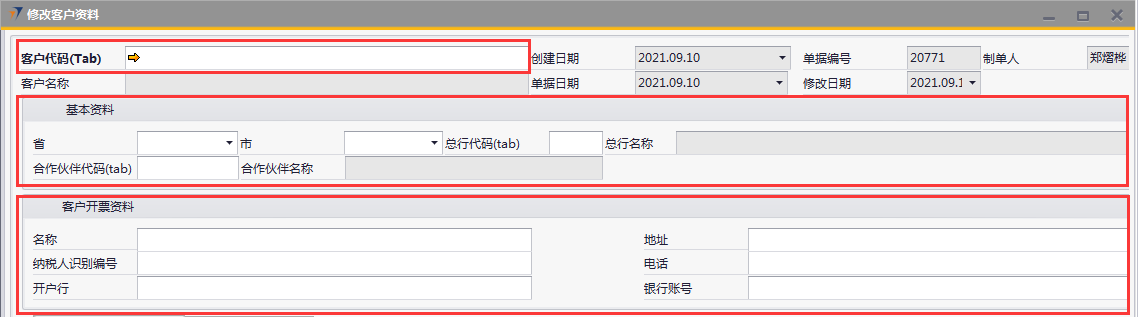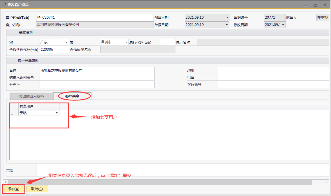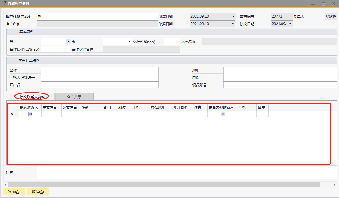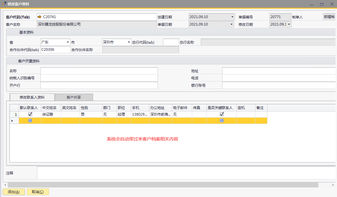# 1 目的与作用 为了指导和规范销售、售后人员客户档案修改(客户名称修改不能用此单据操作),提升效率,规范管理 # 2 界面介绍 路径:业务伙伴档案 → 修改客户资料  # 3 操作说明 ## 3.1 表头  说明: * + **客户代码:**必填,按Tab选择,选择要修改信息的客户代码 + **省:**系统会自动带出客户档案里的省,如果需要修改,选择要修改的省 + **市:**系统会自动带出客户档案里的市,如果需要修改,选择要修改的市 + **总行代码:**系统会自动带出客户档案里的总行代码,如果需要修改,选择要修改的总行代码 + **总行名称:**系统会自动带出客户档案里的总行名称,如果需要修改,选择要修改的总行代码时,总行名称会自动带过来 + **合作伙伴代码:**系统会自动带出客户档案里的合作伙伴代码,如果需要修改,选择要修改的合作伙伴代码 + **合作伙伴名称:**系统会自动带出客户档案里的合作伙伴名称,如果需要修改,选择要修改的合作伙伴代码时,合作伙伴名称会自动带过来 + **客户地址:**必填,客户详细的地址 + **总行代码:**选填,如果有总行,录入总行代码 + **总行名称:**如果录入总行代码,系统会自动带出总行名称,不允许新建也不允许修改 + **合作伙伴代码:**选填,如果有合作伙伴,录入合作伙伴代码 + **合作伙伴名称:**如果录入合作伙伴代码,系统会自动带出合作伙伴名称,不允许新建也不允许修改 客户开票资料 * + 名称:系统会自动带出客户档案里的开票名称,如果需要修改,手动修改 + 纳税人识别编号:系统会自动带出客户档案里的纳税人识别编号,如果需要修改,手动修改 + 开户行:系统会自动带出客户档案里的开户行,如果需要修改,手动修改 + 地址:系统会自动带出客户档案里的开票地址,如果需要修改,手动修改 + 电话:系统会自动带出客户档案里的开票电话,如果需要修改,手动修改 + 银行账号:系统会自动带出客户档案里的开票银行账号,如果需要修改,手动修改 ## 3.2 表体 ### 3.2.1 修改联系人资料 表头客户代码选择后,联系人资料信息会自动带过来。**修改时,不能删除原来行,只能增加行,或者修改已存在的行里的信息**  说明: * + **默认联系人:**选填,系统会自动带出客户档案里的默认联系人信息,如果需要修改,手动修改 + **中文姓名:**必填,系统会自动带出客户档案里的联系人中文姓名,如果需要修改,手动修改 + **英文姓名:**选填,系统会自动带出客户档案里的联系人英文姓名,如果需要修改,手动修改 + **性别:**必填,系统会自动带出客户档案里的联系人性别,如果需要修改,手动修改 + **部门:**必填,系统会自动带出客户档案里的联系人部门,如果需要修改,手动修改 + **职位:**必填,系统会自动带出客户档案里的联系人职位,如果需要修改,手动修改 + **手机:**必填,系统会自动带出客户档案里的联系人手机 ,如果需要修改,手动修改 + **办公地址:**必填,系统会自动带出客户档案里的联系人办公地址,如果需要修改,手动修改 + **电子邮件:**必填,系统会自动带出客户档案里的联系人电子邮件,如果需要修改,手动修改 + **是否关键联系人:**选填,系统会自动带出客户档案里的是否关键联系人,如果需要修改,手动修改 + **传真:**选填,系统会自动带出客户档案里的联系人传真,如果需要修改,手动修改 + **备注:**选填,需要说明的相关事项 ### 3.2.2 客户共享  说明: 要共享给相关人员时,在此录入 * + **共享用户:**要共享时必选,选择共享人 ## 3.3 操作步骤 本次以增加开票资料里的客户名称、增加一位联系人信息、共享客户给指定人员为例 1. 鼠标定位到项目编号,再按Tab键,会调取出来当前账号权限范围内的所有可做客户资料修改的客户  2. 关键词搜索或直接鼠标滚动查找本次要做修改资料的客户,双击选择或选中后点左下方**选择**,选择客户  3. 系统会自动带过来客户档案里的相关内容  4. 录入客户开票资料里的名称、增加一行联系人信息  5. 增加共享用户,相关信息录入无误后,点“添加”提交  # 4 注意事项 修改客户资料档案单据添加后,修改的数据会自动回写到对应的客户档案里,操作时请务必严谨慎重