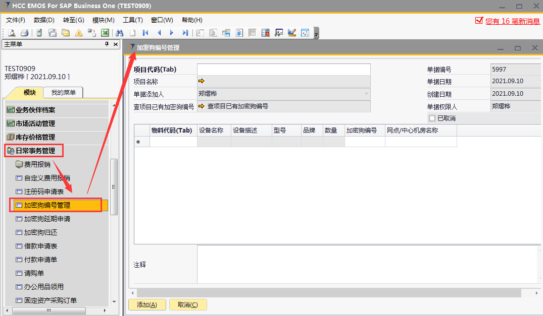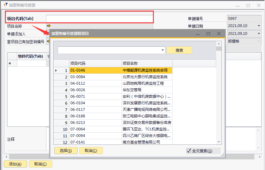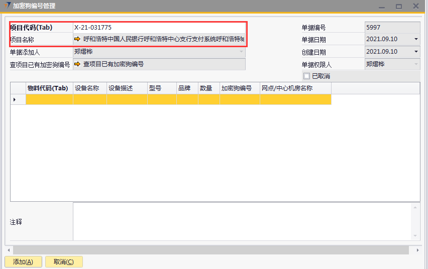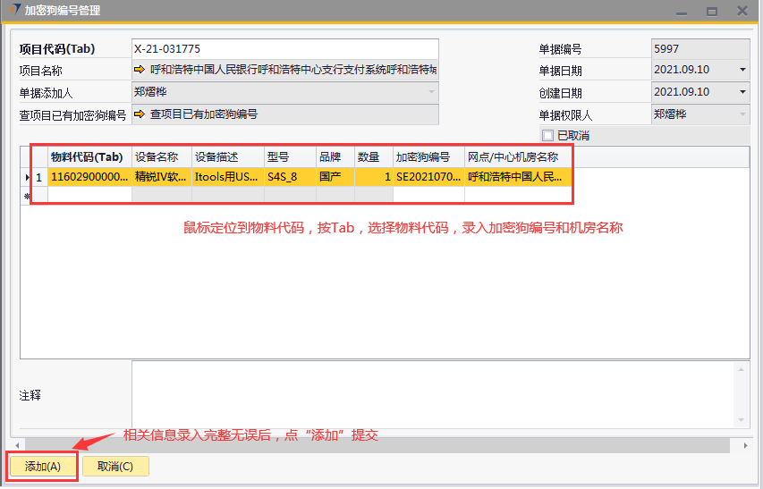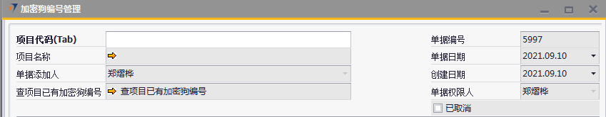 # 1 目的与作用 为了指导和规范发货人员加密狗编号管理,提升效率,规范管理 # 2 界面介绍 路径:日常事务管理 → 加密狗编号管理  # 3 操作说明 ## 3.1 表头  说明: * + **项目代码:**必填,按Tab选择,选择要录入加密狗编号的项目 + **项目名称:**必填,选择项目代码时,系统会自动带出,不能录入也不能修改 + **已取消:**新建时不允许录入,如果单据取消,则会显示打勾 ## 3.2 表体  说明: * + **物料代码:**必填,按Tab选择,选择要录入加密狗编号的物料 + **设备名称、设备描述、型号、品牌、数量:**选择物料代码时,系统会自动带过来,不能录入也不能修改 + **加密狗编号:**必填,加密狗编号 + **网点/中心机房名称:**必填,机房名称 ## 3.3 操作步骤 ### 3.3.1 录入表头信息 1. 鼠标定位到项目编号,再按Tab键,会调取出来当前账号权限范围内的所有可做客户资料修改的客户  2. 关键词搜索或直接鼠标滚动查找本次要做加密狗编号管理的项目,双击选择或选中后点左下方**选择**,选择项目  3. 系统会自动带过来项目相关内容  ### 3.3.2 录入表体信息 鼠标定位到物料代码,按Tab选择物料代码,录入加密狗编号、机房名称,相关信息录入完整无误后,点“添加”提交  # 4 注意事项 只有需求(同一物料编号订单数量+增项-减项)中有加密狗的项目才能录入加密狗编号管理