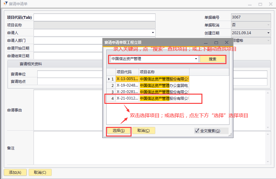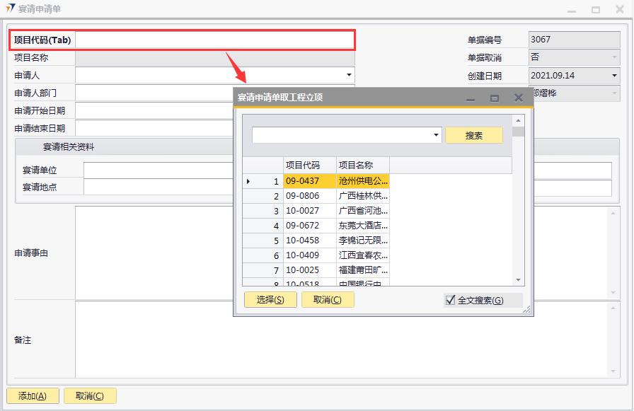 # 1 目的与作用 为了指导和规范工程人员、售后人员宴请申请单录入,提升效率,规范管理 # 2 界面介绍 路径:日常事务管理 → 宴请申请单  # 3 操作说明 ## 3.1 表单  说明: * + **项目代码:**必填,按Tab选择,选择宴请项目代码 + **项目名称:**必填,选择项目代码后,系统会自动带出,不允录入也不允许修改 + **申请人:**必填,申请人姓名 + **申请人部门:**必填,申请人部门 + **申请开始日期:**选填,申请开始日期 + **申请结束日期:**选填,申请结束日期 + **宴请单位:**必填,宴请单位名称 + **宴请地点:**必填,宴请地点 + **宴请人数:**必填,宴请人数 + **预计费用:**必填,宴请所需经费 + **申请事由:**必填,宴请原因 + **备注:**选填,需要说明的其他事项 ## 3.2 操作步骤 1. 鼠标定位到项目代码,再按Tab键,会调取出来当前账号权限范围内的所有可做宴请申请的项目  2. 关键词搜索或直接鼠标滚动查找本次要宴请申请的项目,双击选择或选中后点左下方**选择**,选择项目  3. 选择项目代码后,项目名称会一起带出,录入申请人、申请人部门、申请开始日期、申请结束日期、宴请单位、宴请地点、宴请人数、预计费用、申请事由、备注,相关信息录入完整无误后,点“添加”提交  # 4 注意事项 无