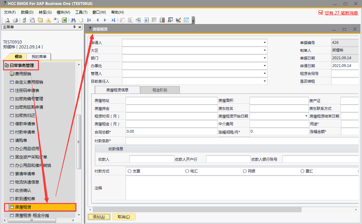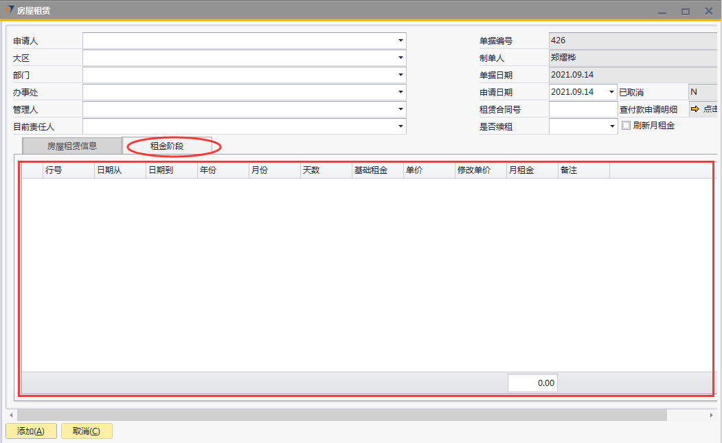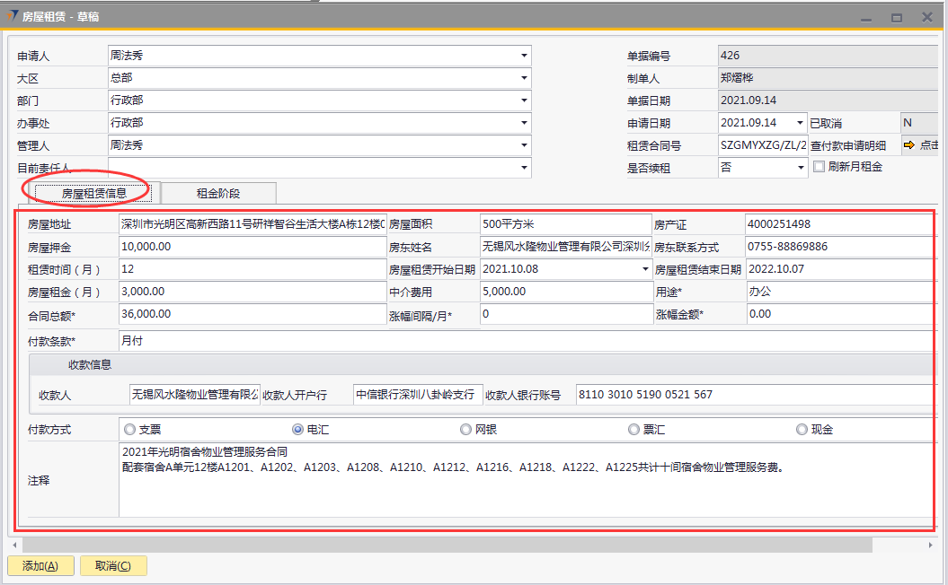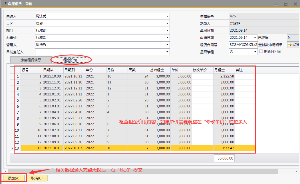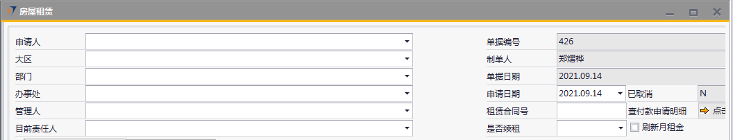 # 1 目的与作用 为了指导和规范相关人员房屋租赁单录入,提升效率,规范管理 # 2 界面介绍 路径:日常事务管理 → 房屋租赁  # 3 操作说明 ## 3.1 表头  说明: * + **申请人:**必填,选择申请人 + **大区:**必填,选择申请人所属大区 + **部门:**必填,选择申请人所在部门 + **办事处:**必填,选择申请人所属办事处 + **管理人:**必填,租赁房屋管理人 + **目前责任人:**必填,租赁房屋目前责任人 + **申请日期:**必填,申请日期 + **租赁合同号:**必填,租赁合同号 + **是否续租:**必填,是否续租,如果是选**是**,如果不是选**否** + **刷新月租金:**选填,用于刷新**租金阶段**页签的月租金,当**租金阶段**页签有修改单价时使用 ## 3.2 表体 ### 3.2.1 房屋租赁申请  说明: * + **房屋地址:**必填,房屋的详细地址 + **房屋面积:**必填,房屋面积 + **房产证:**必填,房产证号 + **房屋押金:**必填,房屋押金 + **房东姓名:**必填,房东姓名 + **房东联系方式:**必填,房东联系方式 + **租赁时间(月):**必填,房屋租赁时间,以月为单位 + **房屋租赁开始日期:**必填,房屋租赁开始日期 + **房屋租赁结束日期:**必填,房屋租赁结束日期 + **房屋租金(月):**必填,房屋租金,以月为单位 + **中介费用:**必填,租赁房屋所付中介费用 + **用途:**必填,租赁房屋用途,下拉框选择。总共11个用途类型,其中**宿舍、车位、集装箱、项目宿舍、人才公寓、其他类型**必须做租金分摊单,否则无法报销 + **合同总额:**必填,必须大于0,合同的总金额,不含中介费、押金等 + **涨幅间隔/月:**必填,系统默认为0,此合同多少个月涨一次租金,当合同有规律的涨幅时填入,无涨幅或无规律时,填0 + **涨幅金额:**必填,此合同每一次涨幅的金额是多少,无涨幅或无规律时,填0 涨幅金额是刷新**租金阶段**页签的字段,所以务必最后填写 * + **付款条款:**必填,合同付款条款 收款信息 * + **收款人:**必填,收款人,准确无误录入 + **收款人开户行:**必填,收款人开户行,准确无误录入 + **收款人银行账号:**必填,收款人银行账号,,准确无误录入 + **付款方式:**必填,付款方式,必须选择一种 + **注释:**选填,需要说明的相关事项 ### 3.2.2 租金阶段  说明: * + **物料代码:**必填,按Tab选择,选择要录入加密狗编号的物料 + **行号:**必填,第一个页签填入对应数据后自动生成,每个自然月一行 + **日期从:**必填,第一个页签填入对应数据后自动生成,每个自然月的开始日期,第一行除外,第一行为合同开始日期 + **日期到:**必填,第一个页签填入对应数据后自动生成,每个自然月的结束日期,最后一行除非,最后一个为合同结束日期 + **年份:**必填,第一个页签填入对应数据后自动生成,此行的年份 + **月份:**必填,第一个页签填入对应数据后自动生成,此行的月份 + **天数:** 必填,第一个页签填入对应数据后自动生成,此行占用的天数 + **基础租赁:**必填,第一个页签填入对应数据后自动生成,等于第一个页签的租金 + **单据:**必填,第一个页签填入对应数据后自动生成,等于基础租金加上涨幅 + **修改单价:**选填,默认为空,如果需要修改单价,则可以在此字段填入,填入后勾选表头的刷新月租金,会自动重算数据,请谨慎填入 + **月租金:**必填,第一个页签填入对应数据后或勾选刷新月租金后自动生成,整月的行等于单价,不足一个月的行等于=单价或修改单价/本月天数*天数,最后一行=合同总额-前面所有行月租金合计 + **备注:**选填,需要说明的相关事项 **注意:**如果租赁合同有涨幅、并且涨幅毫无规律,可以手工弄好excel直接导入 ## 3.3 操作步骤 ### 3.3.1 录入表头信息 录入表头申请人、大区、部门、办事处、管理人、申请日期、租赁合同号、是否续租  ### 3.3.2 录入表体信息 #### 3.3.2.1 录入房屋租赁信息 录入房屋租赁信息所有字段内容,其他字段录入完成后,**最后**录**涨幅金额**字段,这样**租金阶段**页签内容才会自动拆分和填充  #### 3.3.2.2 检查租金阶段 检查租金阶段内容,如果单价需要修改,在“修改单价”栏位录入调整,如需要说明在“备注”栏位说明。相关数据录入完整无误后,点“添加”提交  # 4 注意事项 1. 涨幅金额是刷新【租金阶段】页签的字段,所以务必最后填写,然后再去检查【租金阶段】页签相关数据 2. 若无涨幅,涨幅间隔/月、涨幅金额均填0 3. 【租金阶段】页签月租金的合计必须等于合同总额,如果不相等,请检查【房屋租赁信息】页签数据是否填入有误 4. 若合同涨幅无规律时,【租金阶段】页签可以用EXCEL导入 5. 若单价需要修改时,可以手动填入修改单价,然后点击单据头的“刷新月租金”,如果不小心点错刷新了,可以到【房屋租赁信息】页签重新输入涨幅金额或者填入0
