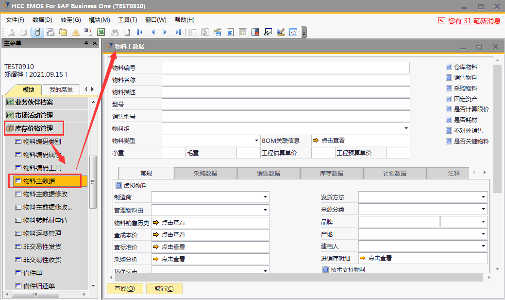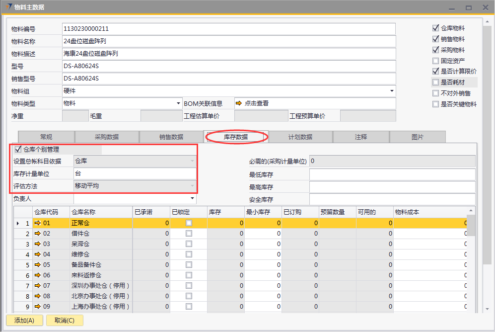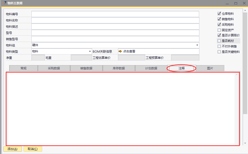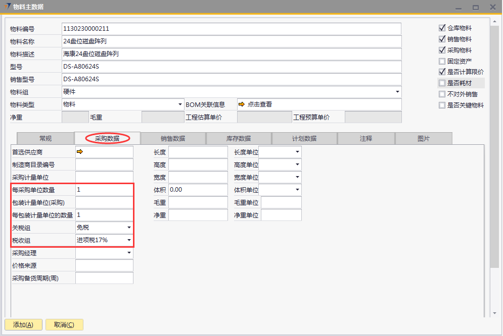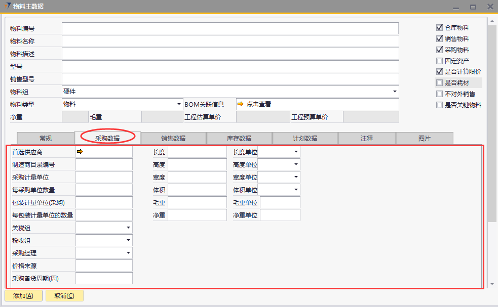 # 1 目的与作用 为了指导和规范相关人员物料主数据录入,提升效率,规范管理 # 2 界面介绍 路径:库存价格管理 → 物料主数据  # 3 操作说明 ## 3.1 表头  说明: * + **物料编号:**必填,按规格录入物料编号 + **物料名称:**必填,详细无误的物料名称 + **物料描述:**必填,详细无误的物料描述 + **型号:**选填,详细无误的物料型号 + **销售型号:**选填,对外销售的物料型号 + **物料组:**必填,物料分组 + **物料类型:**必填,物料类型 + **净重、毛重、工程估算单价、工程预算单价:**选填,从其它单据回写数据过来,新建时不允许录入 + **仓库物料:**默认打勾,如果物料不是仓库物料,取消打勾 + **销售物料:**默认打勾,如果物料不是销售物料,取消打勾 + **采购物料:**默认打勾,如果物料不是采购物料,取消打勾 + **固定资产:**默认不打勾,如果物料是固定资产,打勾 + **是否计算限价**:默认打勾,一般不修改 + **是否耗材:**默认不打勾,新建时不允许录入,如果需要转耗材走物料转耗材申请单 + **不对外销售:**默认不打勾,如果物料不对外销售,取消打勾 + **是否关键物料:**默认不打勾,如果物料是关键物料,打勾 ## 3.2 表体 ### 3.2.1 常规  说明: * + **虚拟物料:**默认不打勾,如果是虚拟物料,打勾 + **制造商:**选填,物料制造商 + **管理物料由:**必填,默认为无,有无、序列号、批次三种管理方法 + **环保标志:**必填,默认非环保 + **物料类别:**选填,有常用物料、非常用物料、项目专用三种选择 + **物料属性:**选填,有OEM、外购、自研三种选择 + **发货方法:**必填,有倒冲和手工两种选择 + **来源分类:**选填,有共济软件、共济硬件、外购软件、外购硬件四种选择 + **品牌:**选填,物料品牌 + **产地:**选填,物料产地 + **技术支持物料:**默认打勾,如果不是技术支持物料,取消打勾 + **是否参与BOM:**默认不打勾,如果参考BOM计算,打勾 + **是否维保物料:**默认打勾,如果不是维保物料,取消打勾 + **有效期:**默认不打勾,新建时需要打勾,这样物料才能正常使用 + **停用:**默认不打勾,新建时默认状态即可。如果勾选停用,则物料不能正常使用 ### 3.2.2 采购数据  说明: * + **首选供应商:**选填,按Tab可选择首选供应商 + **采购计量单位:**采购时计量单位 + **每采购单位数量:**每个采购单位的物料数量 + **包装计量单位(采购):**采购包装单位,它是计量单位的倍数 + **每包装计量单位的数量:**定义每包装单位的数量 + **关税组:**如果进口采购物料,请输入关税组。这样,就可以计算关税费用 + **税收组:**税收组以及采购物料时的应税税率 + **采购经理:**物料采购经理 + **价格来源:**采购物料价格来源 + **采购备货周期:**采购备货的周期 + **长度、宽度、高度、体积、毛重、净重:**指的是采购单位,而不是基本单位,物料采购时的长度、宽度、高度、体积、毛重、净重 ### 3.2.3 销售数据  说明: * + **销售计量单位:**销售时计量单位 + **每销售单位数量:**每个销售单位的物料数量 + **包装计量单位(销售):**销售包装单位,它是计量单位的倍数 + **每包装计量单位的数量:**定义每包装单位的数量 + **税收组:**税收组以及销售物料时的应税税率 + **采购经理:**物料采购经理 + **长度、宽度、高度、体积、毛重、净重:**指的是销售单位,而不是基本单位,物料销售时的长度、宽度、高度、体积、毛重、净重 ### 3.2.4 库存数据  说明: * + **仓库个别管理:**选择该字段可以定义最小和最大库存数量的计算方法 + **设置总账科目依据:**默认为仓库,不允许修改 + **库存计量单位:**必填,管理库存的单位类型 + **评估方法:**默认为移动平均,不允许修改。移动平均,该方法的依据是计算每个销售和采购交易中物料的平均成本 + **负责人:**仓库负责人 + **必需的(采购计量单位):**保持最小库存水平的必需数量 + **最低库存:**最小库存水平 + **最高库存:**最高库存水平 + **安全库存:**安全库存水平 + 明细行显示物料在对应仓库的详细情况 ### 3.2.5 计划数据  说明: * + **计划方法:**有无和MRP两种选择 无 — 不通过 MRP 计划物料采购,并且不为物料创建任何生产订单或采购订单建议 MRP — 使用 MRP 系统计划物料采购 * + **采购方法:**有购买和生产两种选择 + **订单周期:**订单间的时间间隔 + **多重订单:**输入数字值以定义MRP的批次大小,如果该值为12,则用订购的物料乘以12。因此,如果您需要20个物料,并且值为12,则 MRP 建议订购24个物料 + **经济批量:**最小批次大小 + **提前期/天:**从订购物料到接收或生产物料之间的天数 ### 3.2.6 注释  说明: * + 物料相关的备注说明 ### 3.2.7 图片  说明: * + 可以为物料插入、导出、浏览与物料相关的图片 ## 3.3 操作步骤 ### 3.3.1 录入表头信息  ### 3.3.2 录入表体信息 #### 3.3.2.1 录入常规信息  #### 3.3.2.2 录入采购数据  #### 3.3.2.3 录入销售数据  #### 3.3.2.4 录入库存数据  #### 3.3.2.5 录入计划数据 录入计划数据,相关数据录入完整无误后,点“添加”提交  # 4 注意事项 无