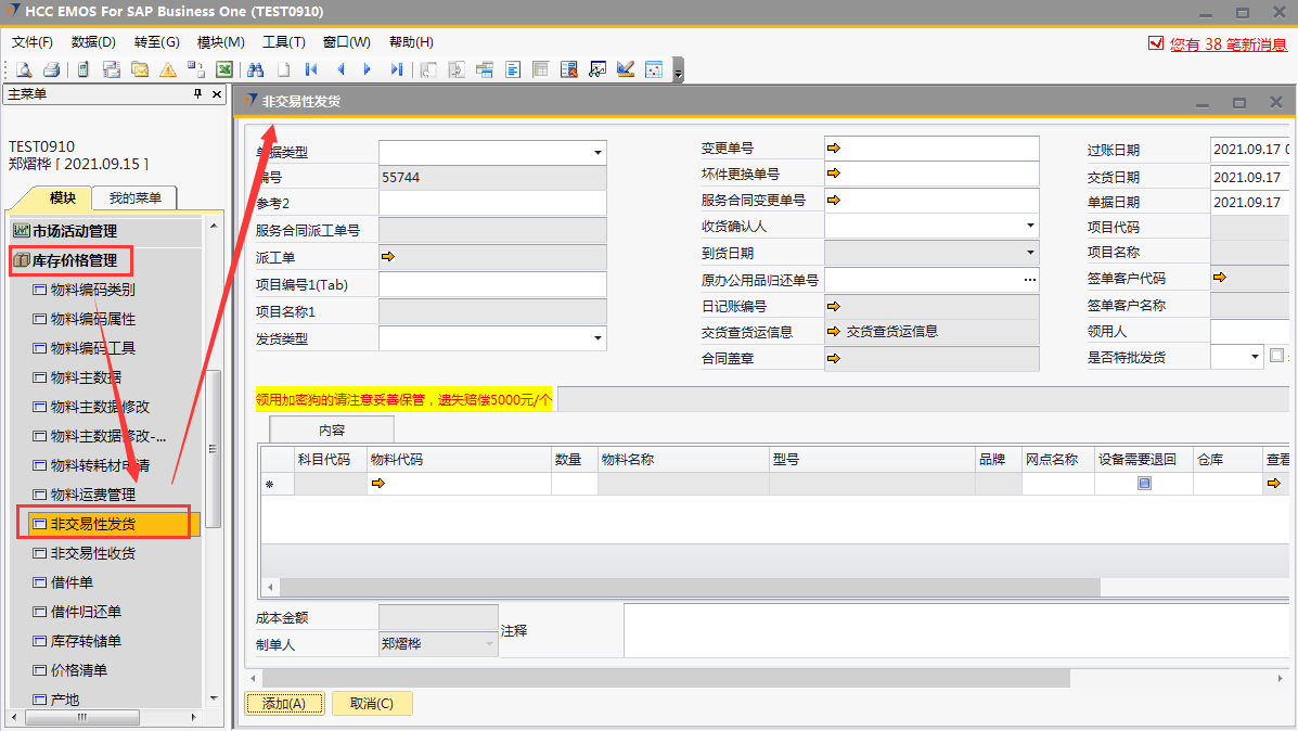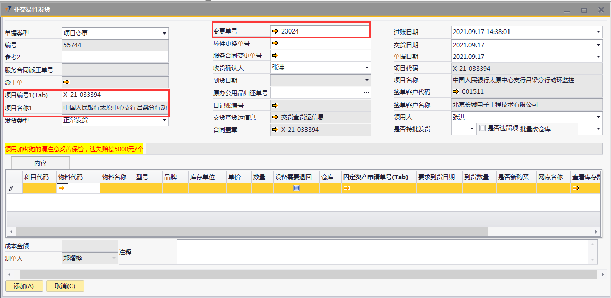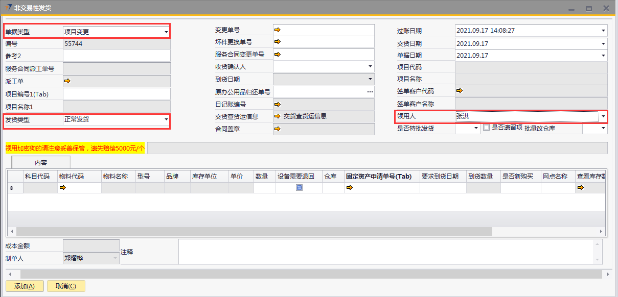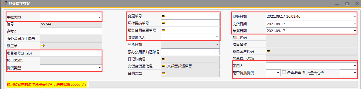 # 1 目的与作用 为了指导和规范相关人员非交易性发货单录入,提升效率,规范管理 # 2 界面介绍 路径:库存价格管理 → 非交易性发货  # 3 操作说明 ## 3.1 表头  说明: * + **单据类型:**必选,目前有十三种类型,发货时,**一定要选对单据类型**,类型如下 项目变更:项目增项变更发货,**一定要**关联“变更单号”或“服务合同变更单号” 坏件更换:坏件更换发货,**一定要**关联“坏件更换单号” 维保领料:售后服务部维保领料 在建工程领用:一般用于展厅设备领用 研发领用设备:研发设备领用 外发加工设备出库:仓库外发加工设备领用 维修领用设备:维修设备领用 库存调账:用于盘亏调账 耗材领用:耗材领用 固定资产领用:固定资产领用,明细行里**一定要**关联“固定资产申请单” 办公用品领用:办公用品领用 存货转固定资产:存货转固定资产,此类型暂时未启用 不能回收的设备领用:不能回收的设备领用,此类型暂时未启用 * + **项目编号、项目名称:** **单据类型**是项目变更、坏件更坏,选择**变更单号/服务合同变更单号、坏件更换单号**,系统会自动带出项目编号和项目名称,不需要录入也不需要修改; **单据类型**是维保领料、在建工程领用,必须录入项目编号、项目名称,按Tab选择项目编号,项目名称会自动带出 **单据类型**是研发领用设备、外发加工设备出库、维修领用设备、库存调账、耗材领用,跟项目有关的,按Tab选择项目编号,项目名称会自动带出 **单据类型**是固定资产领用、办公用品领用,不关联项目编号、项目名称 * + **变更单号:**单据类型是项目变更且是X项目变更时,必填,按Tab选择 + **坏件更换单号:**单据类型是坏件更换时,必填,按Tab选择 + **服务合同变更单号:**单据类型是项目变更且是W项目变更时,必填,按Tab选择 + **收货确认人:**必填,发货单收货确认人 + **过账日期:**必填,系统默认当天,不修改 + **交货日期:**必填,系统默认当天,可修改 + **单据日期:**必填,系统默认当天,不修改 + **领用人:**必填,设备领用人 + **是否特批发货:**如果是项目变更发货,必填 + **是否遗留项:**如果是遗留项发货,必打勾 + **批量改仓库:**如果需要批量修改表体明细行中仓库,明细行录入后,选批量改仓库,所选仓库会自动刷新到明细行 ## 3.2 表体  说明: * + **物料代码:**必填,按Tab选择。单据类型如果是**项目变更、坏件更换**,应先选择变更单号/服务合同变更单号、坏件更换单号,表体明细行会关联对应单号明细内容 + **物料名称、型号、品牌、库存单位、单价:**选择物料代码后,系统会自动带过来,不能录入也不允许修改 + **数量:**必填,物料发货数量 + **设备需要退回:**默认打勾,一般不修改,如果特殊物料不需要退回去掉打勾 + **仓库:**必填,发货仓库 + **固定资产申请单号:**单据类型是固定资产领用,必填,按Tab选择 + **要求到货日期:**必填,设备要求到货日期 + **是否新购买:**选填,默认为空,如果是新购买录选**是** + **网点名称:**选填,联网项目时使用,目前可不录入 ## 3.3 操作步骤 以办公用品领用、X项目变更增项发货为例 ### 3.3.1 办公用品领用 1. 单据类型选择**办公用品领用**,录入发货类型、领用人  2. 鼠标定位到物料代码,按Tab 弹出的对话框中,录入关键词,点“搜索”搜索要领用的办公用品 双击选择设备;或选中行后,点左下方“选择”,选择设备  3. 录入数量、仓库、要求到货日期,录入注释,相关数据录入完整无误后,点“添加”提交  ### 3.2 项目变更增项发货 1. 单据类型选择**项目变更**,录入发货类型、领用人  2. 鼠标定位到变更单号,按Tab 弹出的对话框中,录入关键词,点“搜索”搜索要变更发货的项目 双击选择项目;或选中行后,点左下方“选择”,选择项目  3. 变更单号选中后,项目编号、项目名称相关信息会带出来  4. 变更单号选中后,项目编号、项目名称相关信息会带出来 鼠标定位到明细行物料代码,按Tab,会出来变更单可发货设备  5. 选择要发货设备,录入数量、仓库、要求到货日期,录入注释 相关数据录入完整无误后,点“添加”提交  # 4 注意事项 非交易性发货单,一定要选择正确的单据类型,单据类型的选择影响到发货后的后续单据操作和相关报表的数据准确性