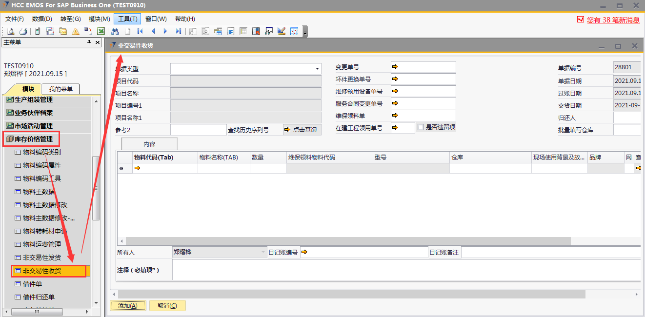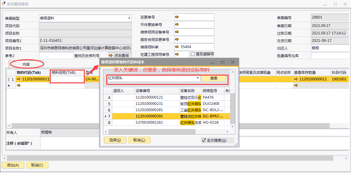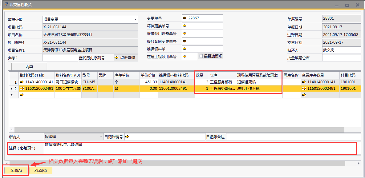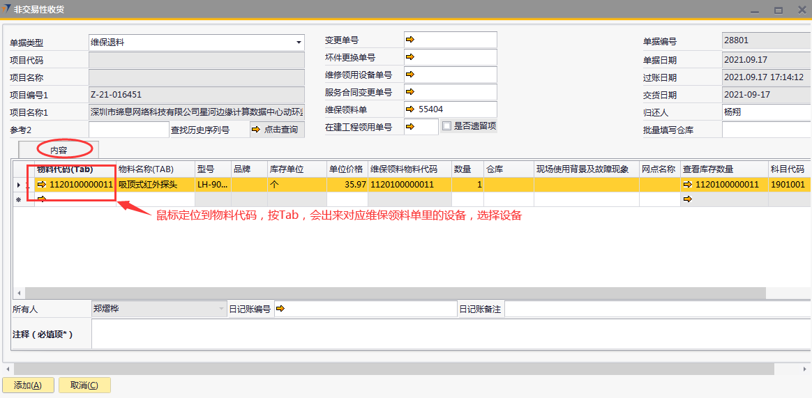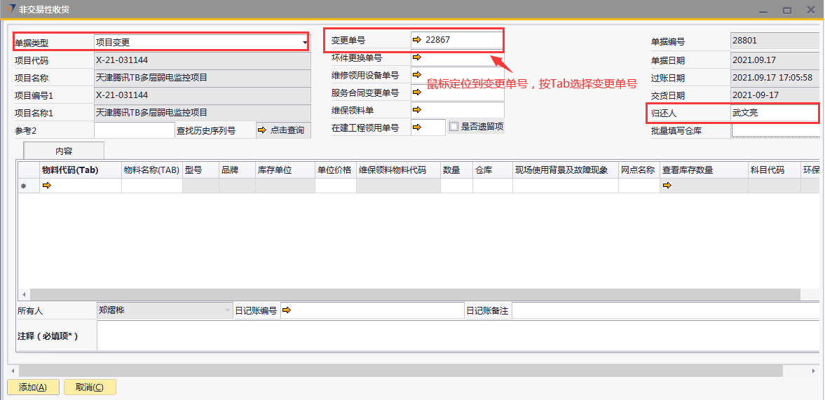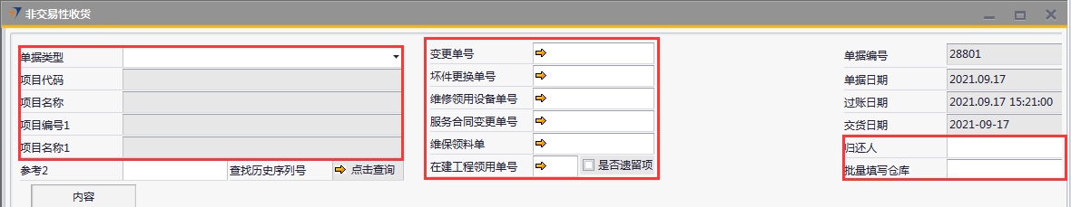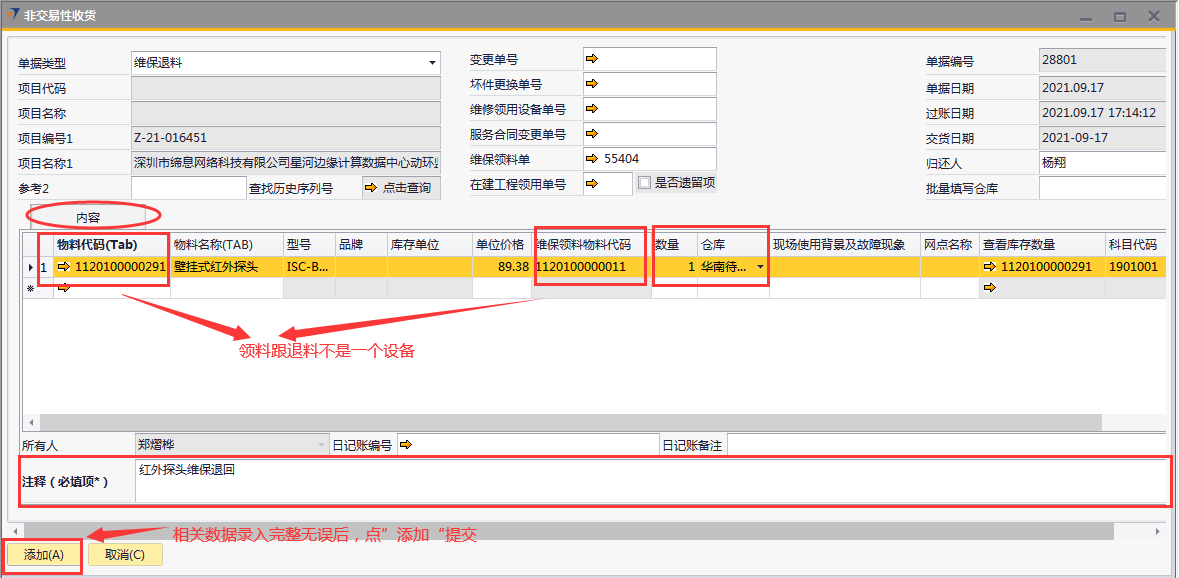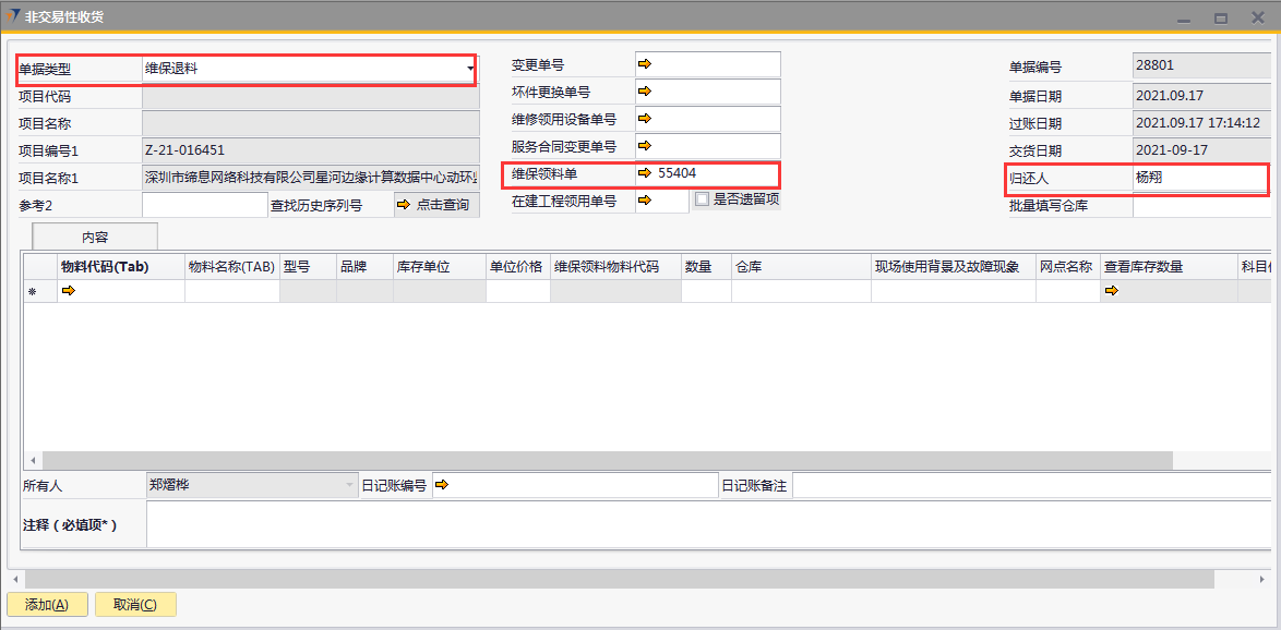 # 1 目的与作用 为了指导和规范相关人员非交易性收货单录入,提升效率,规范管理 # 2 界面介绍 路径:库存价格管理 → 非交易性收货  # 3 操作说明 ## 3.1 表头  说明: * + **单据类型:**必选,目前有十三种类型,发货时,**一定要选对单据类型**,类型如下 项目变更:项目增项变更收货,**一定要**关联“变更单号”或“服务合同变更单号” 坏件更换:坏件更换发货,**一定要**关联“坏件更换单号” 维保退料:售后服务部维保退料,**一定要**关联“维保领料单号” 在建工程退回:在建工程设备退回,**一定要**关联“在建工程领用单号” 维修退回设备:维修设备退回,**一定要**关联“维修领用设备单号” 研发领用退还:研发领用设备退还 办公用品归还:**一定要**先选择办公用品归还并录入领用人,明细行才会选到领用人对 应领用办公用品 库存调账:用于盘赢调账 耗材退回:耗材退回 固定资产入库:固定资产入库 换货:此类型暂时未启用 其他:此类型暂时未启用 * + **项目编号、项目名称:** **单据类型**是项目变更、坏件更坏、维保退料、在建工程退回、维修退回设备,选择**变更单号/服务合同变更单号、坏件更换单号、维保领料单、在建工程领用单号、维修领用设备单号**,系统会自动带出项目编号和项目名称,不需要录入也不需要修改 **单据类型**是研发领用归还、库存调账、耗材退回,跟项目有关的,按Tab选择项目编号,项目名称会自动带出 **单据类型**是固定资产入库、办公用品归还,不关联项目编号、项目名称 * + **变更单号:**单据类型是项目变更且是X项目变更时,必填,按Tab选择 + **坏件更换单号:**单据类型是坏件更换时,必填,按Tab选择 + **维修领用设备单号:**单据类型是维修退回设备时,必填,按Tab选择 + **服务合同变更单号:**单据类型是项目变更且是W项目变更时,必填,按Tab选择 + **维保领料单:**单据类型是维保退料时,必填,按Tab选择 + **在建工程领用单号**:单据类型是在建工程退回时,必填,按Tab选择 + **归还人:**必填,设备归还人 + **过账日期:**必填,系统默认当天,不可修改 + **交货日期:**必填,系统默认当天,不可修改 + **单据日期:**必填,系统默认当天,不可修改 + **领用人:**必填,设备领用人 + **是否遗留项:**如果是遗留项发货,必打勾 + **批量改仓库:**如果需要批量修改表体明细行中仓库,明细行录入后,选批量改仓库,所选仓库会自动刷新到明细行 ## 3.2 表体  说明: * + **物料代码:**必填,按Tab选择。单据类型如果是**项目变更、坏件更换、维保退料、在建工程退回、维修退回设备**,应先选择变更单号/服务合同变更单号、坏件更换单号、维保领料单、在建工程领用单号、维修领用设备单号,表体明细行会关联对应单号明细内容 + **物料名称、型号、品牌、库存单位、单价价格:**选择物料代码后,系统会自动带过来 + **维保领料物料代码:**如果是维保退料,选择物料代码后,系统会自动带过来 + **数量:**必填,物料收货数量 + **仓库:**必填,收货仓库 + **现场使用背景及故障说明:**单据类型是项目变更、坏件更换时,必填 + **网点名称:**选填,联网项目时使用,目前可不录入 ## 3.3 操作步骤 以办公用品归还、项目变更增项收货、维保退料为例 ### 3.3.1 办公用品退回 1. 单据类型选择**办公用品归还**,录入归还人  2. 鼠标定位到物料代码,按Tab,会出来归还人所有可以归还的物料 选择要退回的物料  3. 录入数量、仓库,录入注释,相关数据录入完整无误后,点“添加”提交  ### 3.3.2 项目变更减项收货 1. 单据类型选择**项目变更**,录入归还人 鼠标定位到变更单号,按Tab选择变更单号,选择后,会出来项目相关信息  2. 鼠标定位到物料代码,按Tab,会出来可变更减项收回的设备  3. 选择要退回设备、录入数量、仓库、现场使用背景及故障现象、注释,相关数据录入完整无误后,点“添加”提交  ### 3.3.3 维保退料 维保退料可能会有A退B的特殊业务(比如维保领一个512G硬盘A,换回2个256G硬盘B,所以维保退回时不是1个A,而是2个B),本次以A退B为例 1. 单据类型选择维保退料,录入归还人 鼠标定位到变更单号,按Tab选择维保领料单,选择后,会出来项目相关信息  2. 鼠标定位到物料代码,按Tab,会出来对应维保领料单里的设备,选择设备  3. 因为是A换B,所以维保领料物料代码不需要修改,但物料代码需要修改。 清除物料名称中内容,鼠标定位到物料名称,按Tab  4. 录入关键词,点“搜索”,查找并选择维保退回实际物料  5. 可以看到,物料代码跟维保领料代码不是同一个代码 录入数量、仓库,相关数据录入完整无误后,点“添加”提交  # 4 注意事项 1. **项目变更、坏件更换退回**只能选择工程服务部待检仓或微模块待检仓:如果项目是非微模块项目,退回工和服务部待检仓;如果项目是微模块项目,退回微模块待检仓 2. 非交易性收货单,一定要选择正确的单据类型,单据类型的选择影响到领用单的对应选择和相关报表的数据准确性
