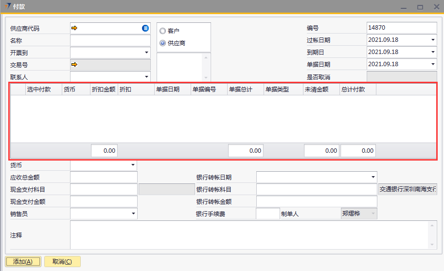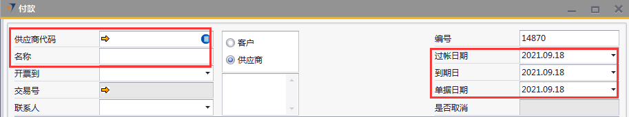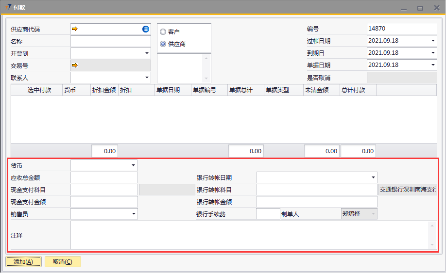 # 1 目的与作用 为了指导和规范财务人员收款单录入,提升效率,规范管理 # 2 界面介绍 路径:收款付款管理 → 付款  # 3 操作说明 ## 3.1 表头  说明: * + **供应商代码:**必填,按Tab选择 + **名称:**必填,选择供应商代码后,供应商名称会自动带出来 + **过账日期、到期日、单据日期:**必填,系统默认当天日期,如需要修改可修改,但修改日期一定要是会计期间解锁内日期 ## 3.2 表体  说明: * + 选择供应商代码后,表体明细行会带过来该供应商的应付数据,自动填充 + **货币:**默认为RMB + **折扣金额:**有折扣金额,录入 + **折扣:**系统自动计算 + **单据日期:**对应单据日期 + **单据编号:**对应单据编号 + **单据总计:**对应单据总计 + **单据类型:**有预付款、应付发票等 + **未清金额:**还未付款金额 + **总计收款:**付款金额 ## 3.3 其他  说明: * + **货币:**必填,人民币 + **应收总金额:**必填,付款金额,等于明细行总计付款总额 + **现金支付科目:**暂不录入 + **现金支付金额:**暂不录入 + **银行转账日期:**必填,录入当天日期,也可以不是当天 + **银行转账科目:**必填,转账科目,目前为交通银行 + **银行转账金额:**必填,付款金额,等于应收总金额 + **银行手续费:**选填,支付给银行的手续费 + **销售员:**必填,付款采购员 + **注释:**必填,需要说明的相关事项 ## 3.4 操作步骤 1. 选择供应商代码,供应商相关要付款明细行数据会全部自动带出来  2. 选中要付款的单据,录入总计付款 录入银行转账日期、银行转账科目、银行转账金额、注释,检查销售员,如需修改可修改 相关数据录入完整无误后,点“添加”提交  # 4 注意事项 无