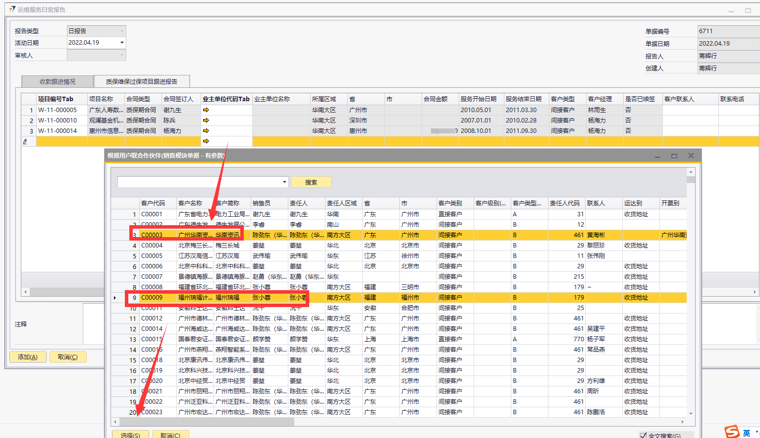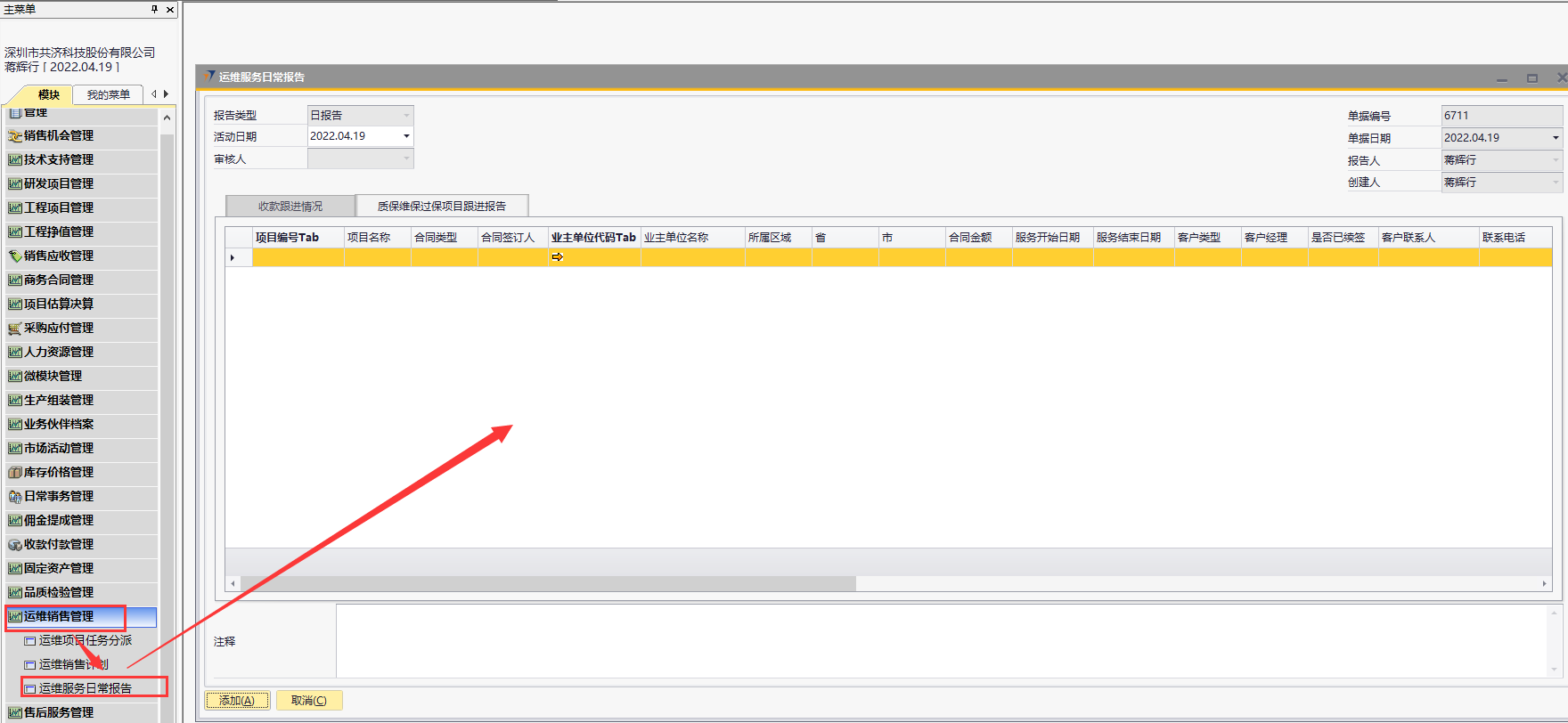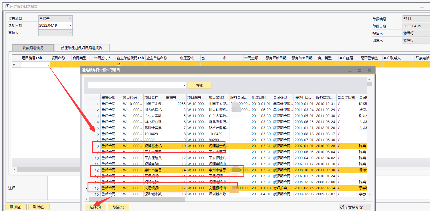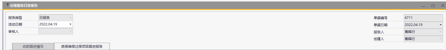 # 1 目的与作用 指导和规范运维人员质保维保过保报告、报销操作,准确快捷地录入内容,提升工作效率 # 2 整体逻辑 1. 报告单仅允许TAB未取消的报备单、销售订单、售后合同,客户仅允许TAB未冻结的;有权限控制,下级TAB自己的,上级TAB下级加自己的; 2. 报告单仅允许报告3天之内的,且同一个人、同一个日期、同一个项目、同一个客户仅允许报告一次; 3. 同一个报告单的同一行,仅允许报销一次;此报告单仅适用于自定义费用报销单;仅能TAB自己的报告单报销; # 3 运维服务日常报告 说明:售后人员用于报告项目、客户日常跟踪信息; ## 3.1 路径 路径:运维销售管理 → 运维服务日常报告 → 质保维保过保项目跟进报告 页签 注:此页签添加成功即为正式单据,无法修改,请认真填写!  ## 3.2 表头  说明: * + **创建人、单据编号、单据日期、创建日期:**系统默认,不需要录入,也不允许修改 + **审核人:**不用录,这个字段是用于之前历史页签的; + **活动日期:**必须录,即报告日期; ## 3.3 表体  说明: * + **灰色字段:TAB选择数据后,系统自动填充**; + **项目编号:**必填,TAB范围为权限范围内正常的报备单+销售订单+售后合同; + **业主单位代码:**当项目代码为空时必录,TAB范围为所有客户; + **客户联系人:**必填,联系人姓名; + **联系电话:**必填,长度必须是11位; + **职位:**必填,联系人的职位; + **此次的拜访目标:**必填,此次拜访的目标; + **进度及完成情况说明:**必填,此次拜访完成的进度及情况说明; + **其他字段:**选填,如果是费用字段,金额必须大于等于0; # 4 操作方法 ## 4.1 质保维保过保项目跟进报告操作 1. 填入活动日期后,按截图顺序按TAB选择数据,选择后,会自动填充数据;可根据项目或者客户报告,但是项目和客户不允许同时为空;    注:活动日期仅允许选择当前日期3天之内的! 2. 填入报告相关内容(客户联系人、联系电话、职位、此次的拜访目标、进度及完成情况说明为必填,其他选填),其中费用请特别注意,一定要认真填写,一次性填写正确,否则后面无法修改;  3. 可选填整体注释和行备注; 4. 检查填入的数据无误后,点击添加; 注意: (1)金额不能为负数; (2)客户联系人、联系电话、职位系统会默认带出该客户的第一个联系人信息,可修改,但是同一个客户的同一个手机号码,不允许有不同的职位和联系人姓名; (3)如果填入的联系人信息在客户档案不存在,则插入到客户档案的联系人中; ## 4.2 自定义费用报销操作 1)自定义费用报销单→销售部报销页签中,TAB时根据当前报销人加载数据,所有字段共用以前的;  注: 1、报告单号TAB,如果当前日期是10号之前,则只能TAB上个月的报告单;如果当前日期是10号之后,则只能TAB本月的报告单,所以报告单填写了费用后,请及时报销! 2、同一个报告单的同一行,仅允许报销一次; 3、仅允许报销自己的费用; 4、费用金额不可修改,自动取报告单数据; # 5 报表操作 ## 5.1 报表说明 1. 【自定义报表】→【售后服务部报表】→【客户项目跟进报告统计透视表】 2. 【OA报表】→【数据】→【M7售后维保质保过保报表】→【A2、A3、A5、A6、A8页签】 # 6 注意事项 ## 6.1 注意事项说明 1. 报告单务必一次性填正确,否则影响报告数据统计和报销; 2. 使用报告单报销时,报销金额必须小于等于报告单的合计金额; 3. 使用报告单报销是,费用名称不允许修改; 4. 如看到的界面或者字段不一样,请重新登录,或者自己往后面拖拉一下,把自己想要的字段调整到前面; 5. 报告单中的费用务必保证只有销售费用,否则造成问题,后果自负!