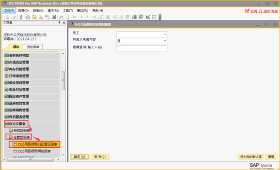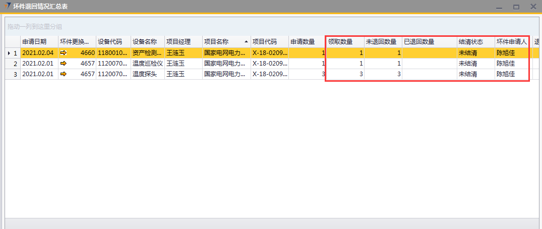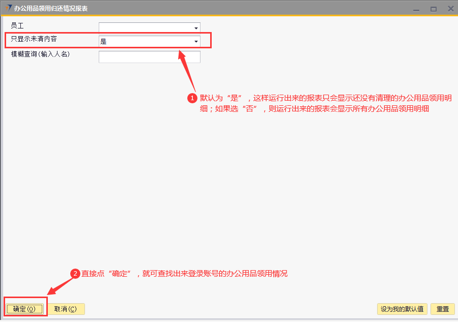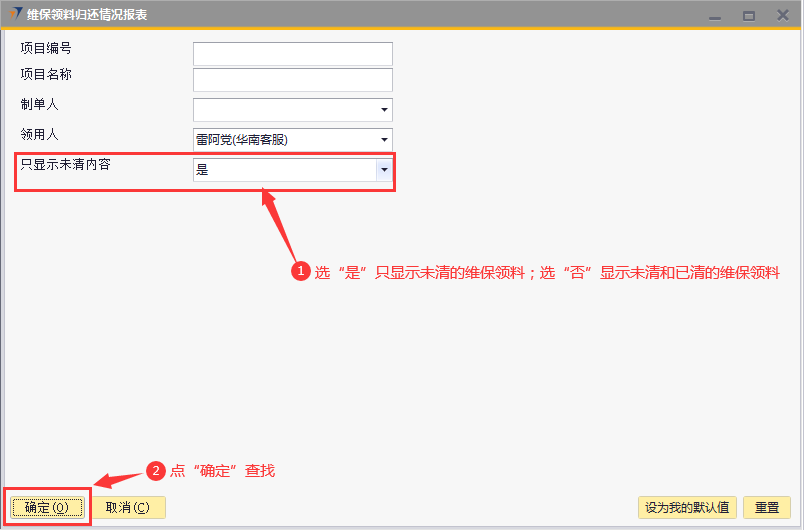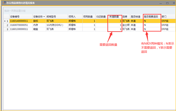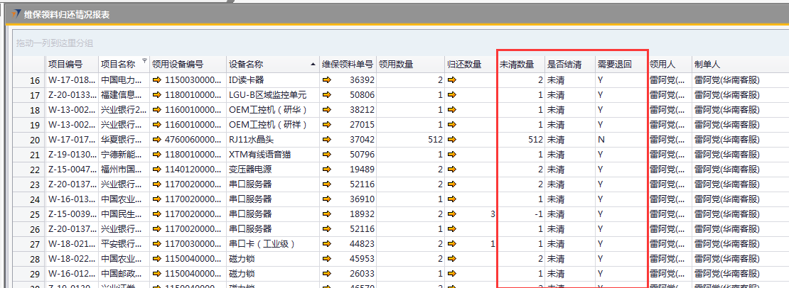 # 1 目的与作用 为了指导和规范离职人员快速查找和处理ERP系统相关未清理数据 # 2 全员 ## 2.1 办公用品领用归还情况报表 路径:自定义报表 → 仓管部报表 → 办公用品领用归还情况表  办公用品领用归还情况报表,**只显示未清内容**,默认为**是**,这样运行出来的报表只会显示当前登录用户还没有完成清理的办公用品领用数据;选**否**,运行出来的报表会显示当前登录用户所有办公用品领用数据  效果如下  * 未清数量:需要退回的数量 * 是否需要退回:有**N**和**Y**两种情况, N表示不需要退回,Y表示需要退回, 未清理办公用品有**两种**处理方式: 办公用品退回:系统录办公用品退回单退回 办公用品转移:找本地助理或人力资源黄飞华打印纸质办公用品移交表, 填写归还用品信息和数量,移交人、接收人和领导签字后,由ERP管理员系统操作处理 ## 2.2 固定资产查询(公用) 路径:自定义报表 → 固定资产 → 固定资产查询(公用)  点“确定”,可查找出来当前登录用户名下所有固定资产领用情况明细  效果如下  固定资产处理方式:找本地助理或人力资源黄飞华打印固定资产移交表,填写移交资产信息,移交人、接收人和领导签字后,由财务部固定资产管理员系统操作处理 # 3 销售、工程、售后人员 ## 3.1 工程项目应退设备列表(销售、工程、售后) 路径:自定义报表 → 工程部报表 → 工程项目应退设备列表  效果如下  * 销售人员未清看**商务经理**是自己的数据;工程、售后人员未清看**项目经理**是自己的数据 * 结算状态:有未清和已清两种状态。**未清**表示需要退回或处理,**已清**表示不需要处理 * 差异:需要退回或处理的设备数量 未清理工程项目应退设备处理方式: 工程、售后人员:做项目变更退回 销售人员:找对应项目经理,项目经理确认未清数据由其跟进处理 ## 3.2 坏件退回情况汇总表(工程、售后) 路径:自定义报表 → 工程部报表 → 坏件退回情况汇总表  **只显示未清内容**,默认为是,选**是**报表内容只显示未清数据;选**否**报表内容会显示已清和未清全部数据   * 结清状态:**未结清**表示需要退回,**已结清**表示不需要处理 * 未退回数量:需要退回的数量 未结清坏件处理方式:做坏件退回处理 ## 3.3 维保领料归还情况报表(售后) 路径:自定义报表 → 售后服务部报表 → 维保领料归还情况报表  **只显示未清内容**,默认为是,选**是**报表内容只显示未清的维保领料;选**否**报表内容会显示已清和未清全部数据   * 是否结清:**未清**表示有设备没有退还,需要退还;**已清**表示设备已经退还,不需要再处理 * 未清数量:需要退回的设备数量 * 需要退回: **Y**表示需要退回,**N**表示不需要退回 未清维保领料处理方式:做维保退回处理