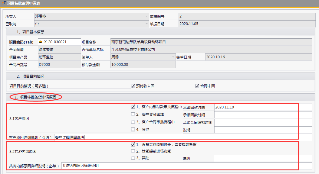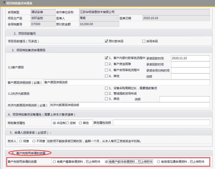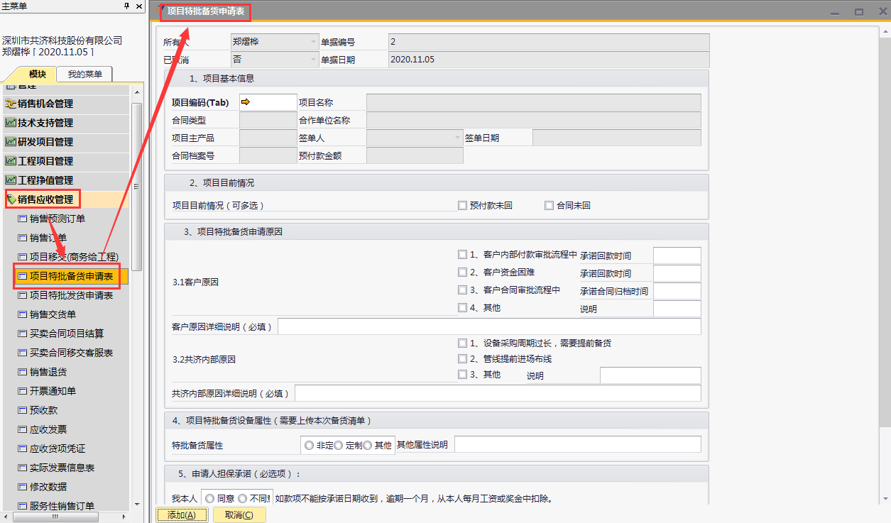 # 1 目的与作用 为了指导和规范销售人员项目特批备货,规范管理 # 2 界面介绍 路径:销售应收管理 → 项目特批备货申请表  # 3 操作说明 ## 3.1 项目特批备货申请录入 ## 3.1.1 项目基本信息  说明: * + **项目编码:**必填,Tab选择 + **项目名称**、**合同类型、合作单位名称、项目主产品、签单人、签单日期、合同档案号、预付款金额**跟**项目编码**自动带出 ## 3.1.2 项目目前情况  说明: 必填,可多选,依照项目当前实际情况填写 ## 3.1.3 项目特批备货申请原因  说明: * + 客户原因或共济内部原因,至少选择一个 + **客户原因:**可勾选多个,原因选1、2、3时,请务必录入对应日期;原因选“4、其他”时,请说明其他相关原因 + **客户原因详细说明:**如果客户原因有勾选,必须录入客户原因详细说明 + **共济内部原因:**可勾选多个,原因选“3、其他”时,请说明其他相关原因 + **共济内部原因详细说明:**如果共济内部原因有勾选,必须录入共济内部原因详细说明 ## 3.1.4 项目特批备货设备属性  说明: 必填,有三个选项,如果选择“其他”,需要在“其他属性说明”里说明情况 ## 3.1.5 申请人担保承诺  说明: 必填,选“同意”或“不同意” ## 3.1.6 客户向我司申请的依据  说明: 必填,三个选项,并按选项内容上传附件 ## 3.2 查询报表 路径:自定义报表 → 销售部相关报表 → 统计类报表 → 项目特批备货申请表