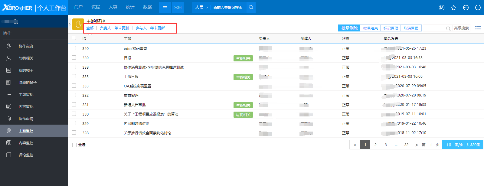 # 一、概述 拥有【协作监控】权限的人员可以在【主题监控】中对所有版块中的主题进行监控,可以结束某个主题,可以将某个主题置顶等等。 # 二、结束主题 1、在监控中结束主题是一个非常重要的工作,如图1所示,为监控人提供了两个非常有用的菜单【负责人一年未更新】和【参与人一年未更新】,对于长时间未更新的主题,就不需要在协作交流中展示,这个时候通过监控的菜单可以将这些主题结束掉。  图1 2、除了宏观上对主题进行监控外,监控人还可以将某些主题进行置顶或撤销置顶,如果置顶的话,那么被置顶的主题在协作交流的主题列表中会显示在最上面,标题后显示top字样,如图2所示。  图2