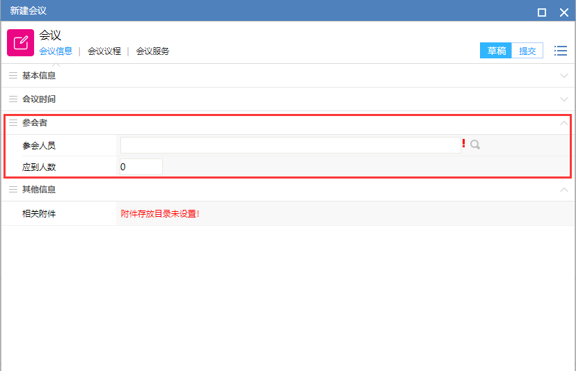 # 一、概述 会议日历是采用日历的方式显示需要参加的会议情况,这样用户可以更加清楚的了解最近时间段之内需要参加的会议,在会议日历中,除了查看会议之外还可以在日历上直接创建会议,如果有下级的话,通过人员组织列表还可以查看下属的月会议情况,如图1所示。  图1 # 二、菜单 点开会议日历之后,在顶部有一排菜单,功能如下 - :新建会议按钮,点击后可以创建会议; - :会议室使用情况按钮,点击后可以进入会议室使用报表页面,可以查看同月的会议室使用情况; - :本月按钮,因为查看日历的时候也许已经翻到其它月份了,点击此按钮之后,下方的日历会回到当前所在月份; - :月份选择,点击后可以根据年份和月份直接进行跳转,点击月份左右箭头可以翻到上个月或者下个月; - :显示方式切换,可以在当前的日历方式和列表方式之间进行切换; - :刷新,点击后刷新当前月份,如果有新到的会议刷新后就会显示。 # 三、月历说明 在图1所示的月历上,黄色的日期代表当天,如果有会议的话会在日期中进行显示,其中不同的颜色代表了不同的状态的会议,在月历的右侧有对应的颜色说明,如果会议较多,还可以通过会议状态的选择对月历中的会议进行过滤。 在会议状态下方有下一个要参加会议的详细信息。 # 四、组织结构 在会议日历中除了可以查看自己的会议,将右侧切换为【人员组织】之后,可以通过搜索的方式来查看其他人的参会情况,如果有下级的话,会将所有下级列出,方便查看,如图2所示  图2 # 五、新建会议 1、在图1所示的日历页面点击按钮或点击日历上的日期显示如图3所示的会议创建页面,会议创建页面分为了基本信息、会议时间、参会着、其他信息和4个部分。  图3 2、会议的基本信息包含了会议类型、会议负责人员、会议地点等信息,详细内容见下表 |字段|说明| |--|--| |会议类型|选择创建会议的类型,这个关系到创建的会议是否需要触发流程,召集人的范围等| |会议名称|当前创建会议的名称| |召集人|会议的召集人,在创建会议后可以管理会议的参会人员、会议决议的内容等信息,可以结束会议| |联系人|默认为会议的创建人,辅助召集人来创建会议的,会议创建成功后就不能操作了| |会议地点|选择开会地点,可以选择已有的会议地点,那么在会议室使用情况中可以看到创建的会议,如果选择的是自定义会议地点的话,就不会出现在会议室使用情况中了| |会议内容|简述会议的主题| 3、会议时间设置见图4所示,创建了从27号13点到30号17点的会议,那么这个时间段内会议室都会被占用,如果希望创建的是27号至30号每天下午13点至17点才使用的话,必需创建4次会议才可以满足要求。  图4 4、参会人员设置见图5所示,  图5 5、点击图3页面中的【会议议程】菜单后显示如图6所示,在这里可以添加会议的议程,其中有个【公开】按钮,选中后其他参会人员查看会议的时候也可以看到议程,没有选中的话就不能查看会议的议程,,没有公开的议程只有会议召集人和会议联系人才能查看到。  图6 # 六、参与会议 1、普通的会议参会人员在会议日历中点击会议名称后可以查看会议, > 在【会议信息】中参会人员可以了解会议的召集人、会议地点、会议时间等会议有关的基础信息,如图7所示  图7 > 在【会议议程】页面,普通参会人员可以看到公开的会议议程,如图8所示,会议召集人和联系人,可以维护会议议程的内容;  图8 > 会议服务:会议服务这里可以查看选择的相关会议服务及服务人,这里会议创建完成后只能查看,不能编辑和修改。  图9