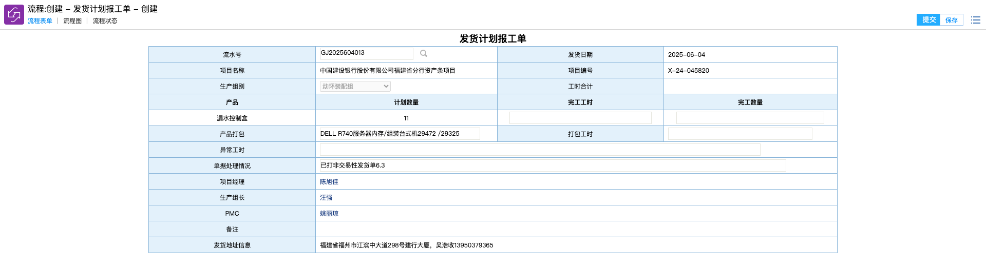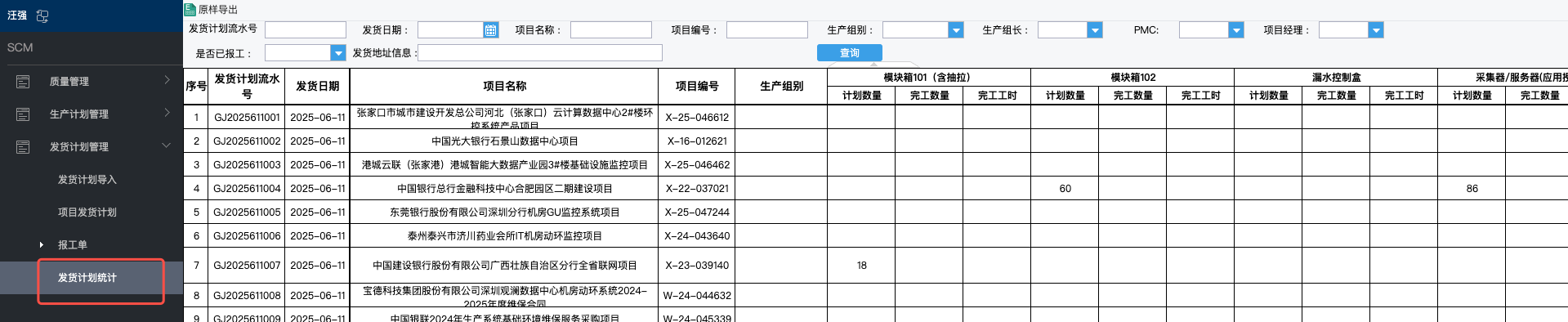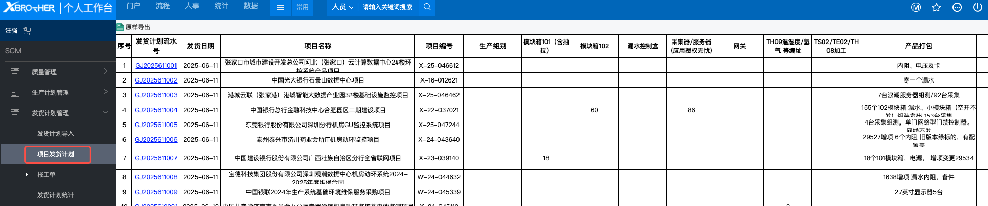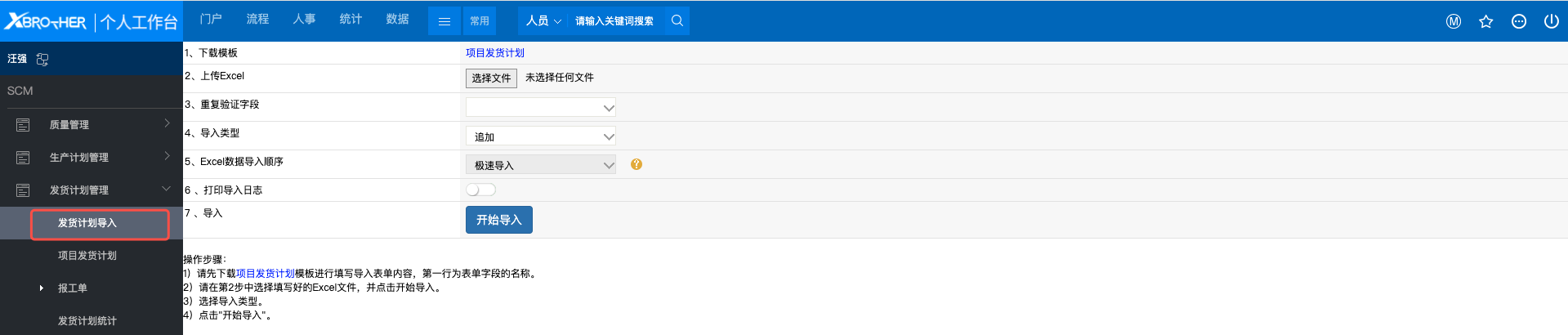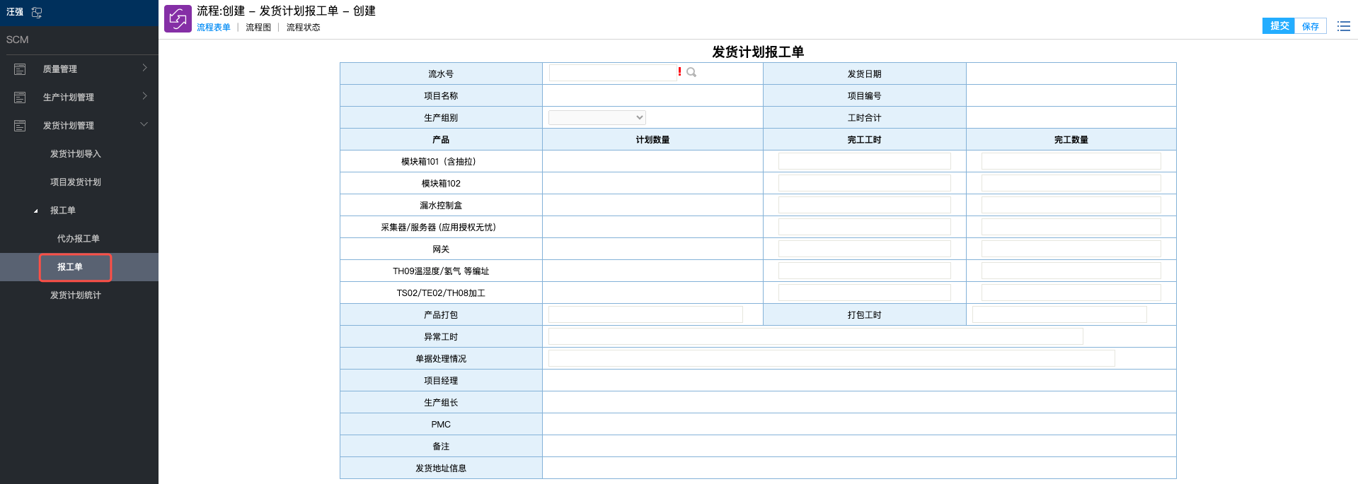 # 1、PMC操作 ## 1.1 发货计划导入 路径: SCM -- 发货计划管理 -- 发货计划导入  下载模板后,编辑内容,编辑完成后,上传文件导入即可。 **备注:模板中“ID”列可空着,不可删除。** ## 1.2 计划查看 路径:SCM -- 发货计划管理 -- 项目发货计划  # 2、生产组长操作 ## 2.1 代办报工单 路径:SCM -- 发货计划管理 -- 报工单 -- 代办报工单  需要报工的计划都会展现在此页面。 ### 2.2.1 报工方式1 点击流水号,可进入该项报工页面。   需报工栏位: 1、完工工时 2、完工数量 3、打包工时 4、异常工时 填写信息后提交即可。 ### 2.2.2 报工方式2 路径:SCM -- 发货计划管理 -- 报工单 -- 报工单  点击“流水号”右侧放大镜按钮“”,选择需要报工的项目   同上述方式1报工操作,填写信息后提交即可。 **备注:若存在异常工时,则需要品质审核。** # 3、报表统计 路径:SCM -- 发货计划管理 -- 发货计划统计