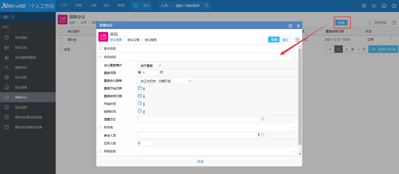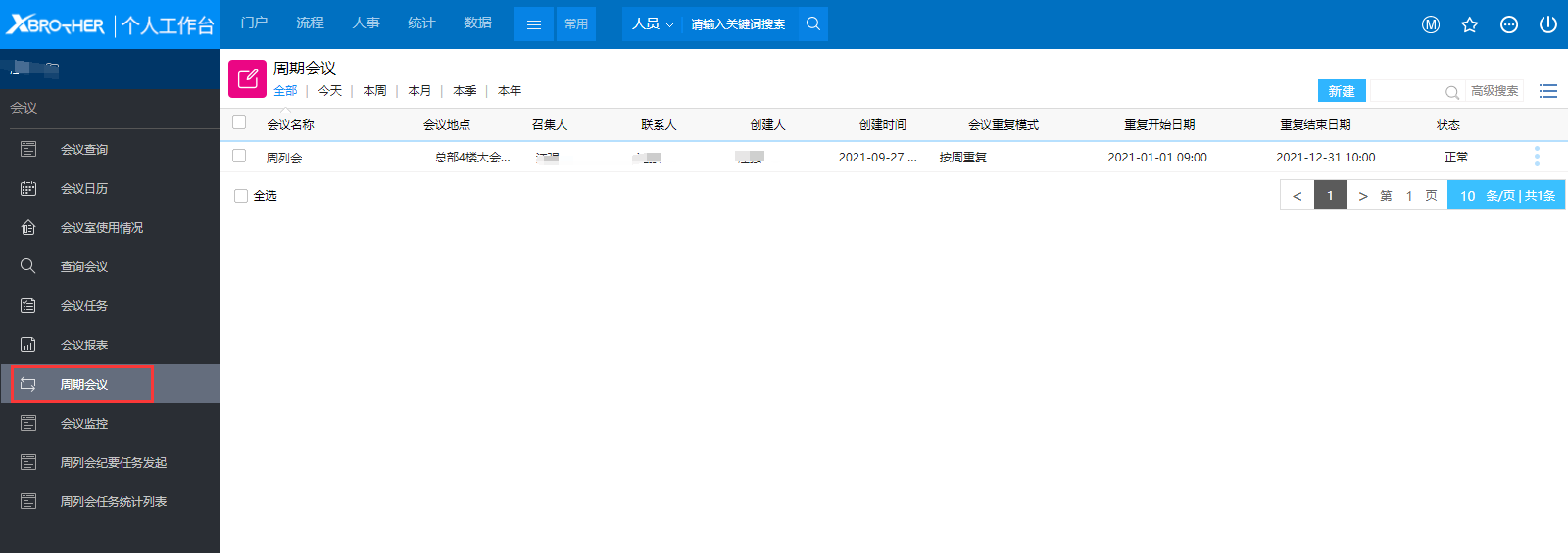 # 一、概述 在企业中会有一些会议是按固定时间周期召开,比如部门周例会,企业年中总结会议,年终总结会议,季度会议等等,遇到频繁需要召开的会议时为了减少手动重复操作的工作,所以提供了周期会议这个功能,只要创建一次,系统就会按照设定的时间自动创建会议。 # 二、周期会议说明 1、点击【周期会议】之后显示如图1所示,看到的是所有的周期会议列表,可以看到目前有哪些周期会议。  图1 2、点击【新建】按钮之后显示如图2所示,与创建会议基本一致,但是在会议时间的设定上需要设定重复创建会议的方式  图2 - 会议重复方式:可以选择按天、按周、按月三种时间周期进行重复创建会议; - 重复间隔:根据时间周期的不同展示的样子也不一样,按天的话就是设置间隔几天召开一次,如果是按周或按月的话就是选择一周或一月的具体某一天召开会议; - 重复会议策略:因为周期会议会遇到非工作日的情况,比如法定假日的调整等,那么遇到了非工作日就要选择创建会议的策略了,有“日期不变”,“推迟到下一工作日”,“取消会议”三种方案可供选择; - 重复开始日期:设定好一个日期,那么从这个日期开始按照设定的时间周期创建会议; - 重复结束日期:设定好一个日期,在这个日期之后不再创建这个周期会议了; - 开始时间、结束时间:是指会议的开始结束时间,这里不能选择日期,所以周期会议是不能创建跨天会议的; - 提醒方式:设置创建的周期会议提醒方式(目前系统没有使用邮件或者短信,会在企业微信端产生提醒)