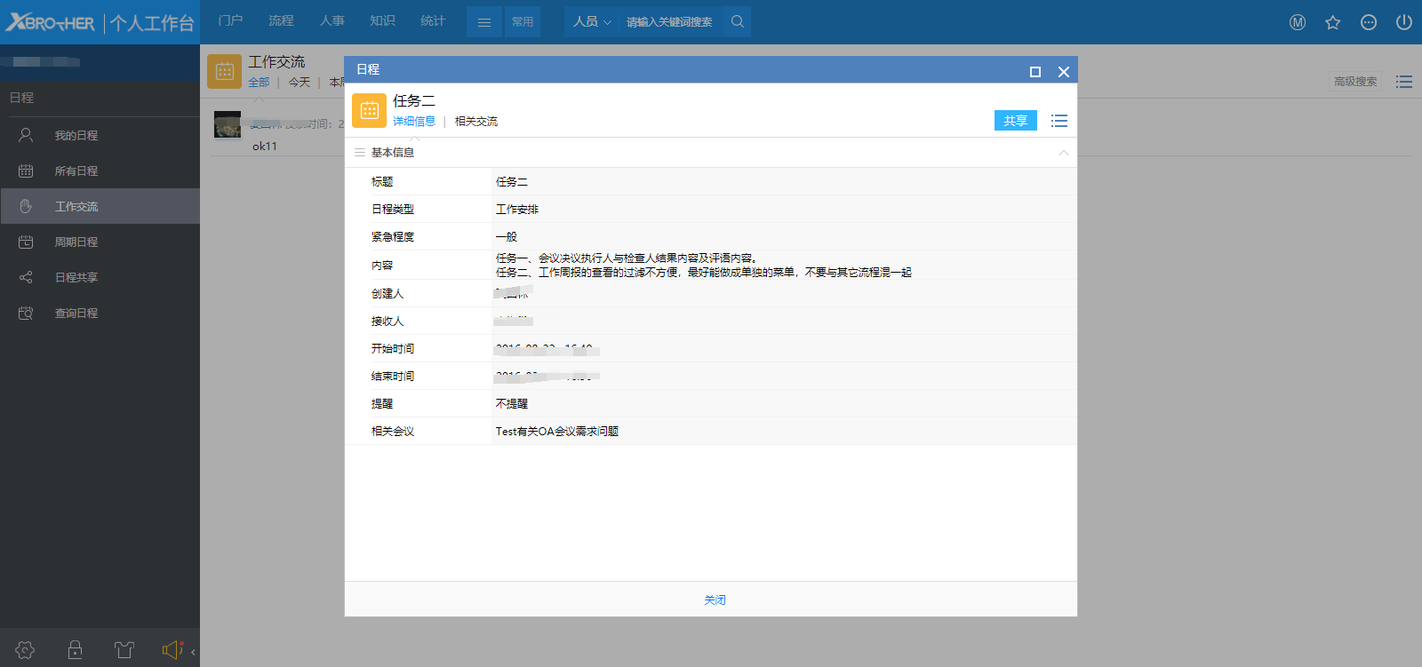 # 一、概述 此页面单独显示关于当前用户有权限查看的日程工作交流。方便快速查看日程各负责人之间的相关交流。 # 二、工作交流 “工作交流”页面默认显示当天的所有工作交流。也可以点击tab页查看【全部】、【本周】、【本月】、【本季】及【本年】当前用户参与的工作交流。  图1 - “工作交流”记录中有相应的日程链接,点击此链接即可打开日程详细内容页面。如图1; - 鼠标放在交流记录上,会出现【回复】按钮,点击【回复】按钮后会直接打开日程页面,且直接显示【相关交流】页。