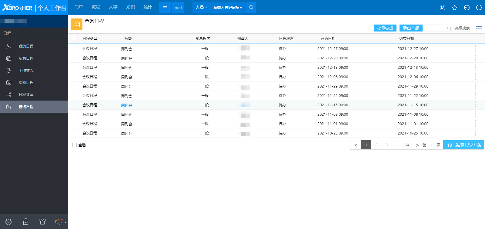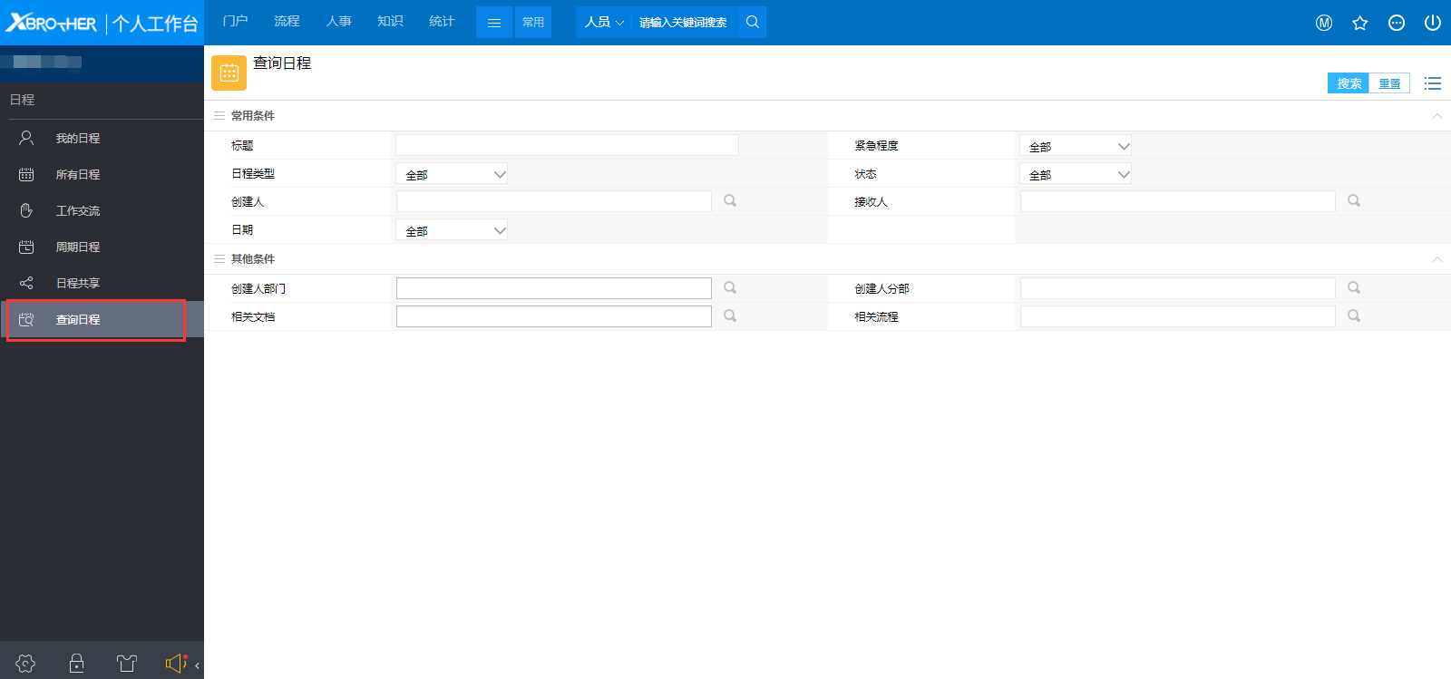 # 一、概述 在执行一个新的任务时,需要寻找过去的类似任务做参考,这个时候通过我的日程和所有日程是很难达到目的的,除非能够清楚记得类似任务发生的具体日期,而通过搜索功能可以很好得弥补这个问题。 # 二、搜索 1、点击查询日程菜单后显示如图1,是日程的搜索条件页面,只要在搜索条件中输入关键字后点击搜索,就可以查找需要的内容了。  图1 2、在查询结果页面,以列表的形式展示所有日程,选中后可以点击批量完成日程,如图2所示。  图2 3、日程要创建人点击完成才能完成,接收人点击完成只是向创建人发送结束共奏计划的系统默认工作流提醒。