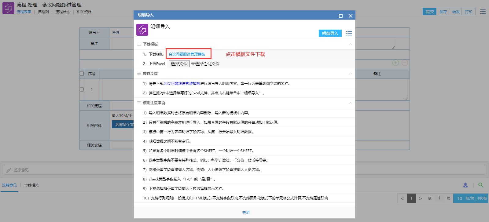 # 一、概述 提供一个周例会会议纪要待跟进事宜管理,方便管理层查看了解。 # 二、发起待跟进事宜 ## 1、路径 会议----会议纪要任务发起  图1 ## 2、操作步骤 **手工录入明细信息.** >此种方式适合待跟进事项较少的情况。  图2 **Excel导入明细** >此种方式适合待跟进事项较多的情况 鼠标点击右键,选择明细导入,如图3所示  图3 弹出“流程数据还未保存,现在保存吗?” 点击保存。图4所示  图4 点击鼠标右键,选择明细导入。  图5 下载系统excel模板,填写数据。  图6 点击“选择文件”,上传按照上一步下载的excel模板的数据文件, 然后点击“明细导入”。图7所示  图7 当数据格式出错时,会提醒出错(如计划完成日期,责任人名字不支持ALL等),遇到这种情况点击确定。  图8 手工补录格式出错未录入的数据。  图9 数据填写后,点击提交即可。 >备注:提交后,每个责任人会收到一条代办流程(PC端,手机微信端都有),如图10  图10 # 三、责任人提交任务完成情况  图11 # 四、事宜未完成提醒 当责任人在计划完成时间前半天为完成时,系统会自动给出系统提醒工作流(PC端,企业微信)。如图12  图12 # 五、附件 明细导入模板 [【附件】会议问题跟进管理模板.xls](/media/attachment/2023/07/会议问题跟进管理模板.xls)
