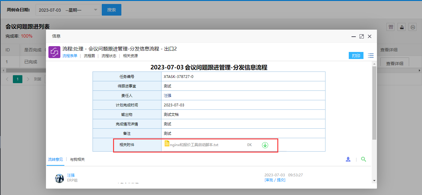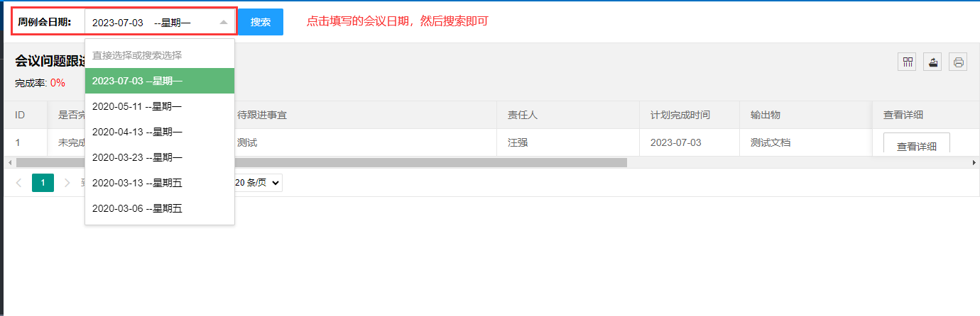 # 一、路径 会议-->会议纪要任务统计列表,如图1  图1 # 二、报表功能介绍 **1、查询** >- 初始化默认显示最新一周周例会纪要。 >- 下拉框可供选择项为已存在的会议纪要的周例会日期。  图2 **2、查看责任人提交的附件文件** > 如果责任人有提交附件,可按图3所示方式查看;点击“查看详情”会弹出信息页面, 可在“相关附件” 处查看或者下载。  图3