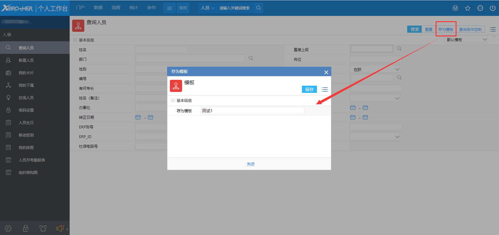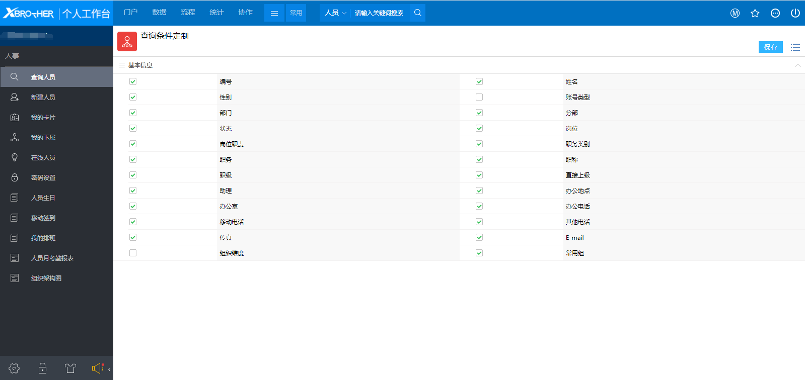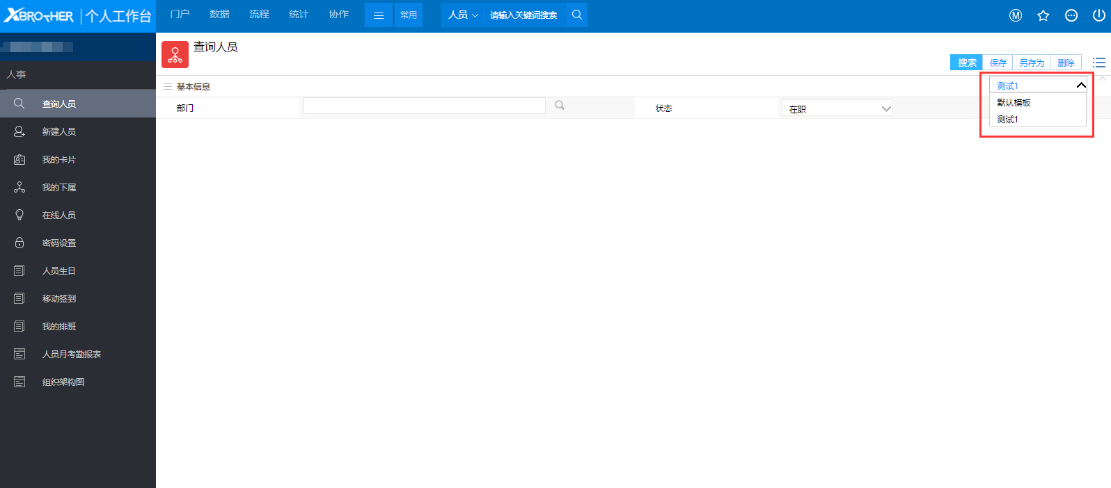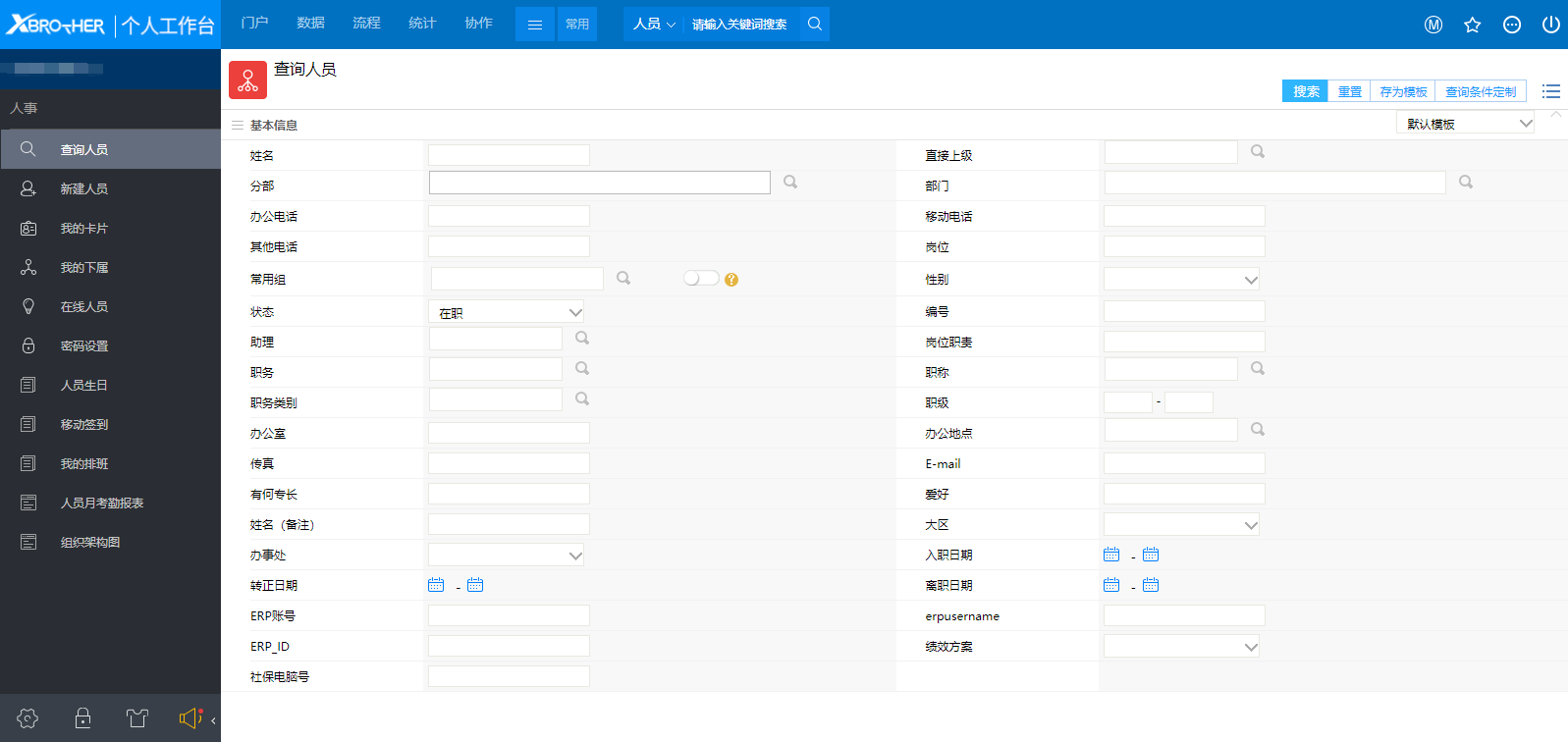 # 一、概述 查询人员我们最常用的就是通过人员的姓名进行查找,那样我们只要在快捷搜索框中输入姓名就可以了。但是有些时候我们并不知道对方的姓名,甚至并不知道要找的这个人具体是谁,这个时候我们就需要通过这里的查询人员的其它人员信息进行查询,比如需要查找对象所在的部门、岗位、直接上级等。 # 二、查找人员 1、点击查询人员菜单后,显示如图1所示,我们看到了很多的查询条件,在搜索任意一个搜索条件中输入关键信息后点击【搜索】按钮,就会查找到符合条件的用户了,如图2所示;  图1  图2 2、如果用户输入了多个查询条件,那么只有符合所有查询条件的用户才会显示出来; # 三、查询条件定制 ### 1、概述 我们现在看到的搜索条件很多,但是有些条件是完全不需要的,这个时候我们可以通过【查询条件定制】来给他瘦身,将自己认为不需要用到的搜索条件给隐藏掉,使整个搜索页面更简洁一些。 ### 2、定制查询条件 点击【查询条件定制】按钮之后,显示如图3所示,这里列出了所有可以用的查询条件,我们将不需要用到的查询条件选项去掉后保存就完成了定制过程。如果以后又要用到的话只需要在查询条件定制中将隐藏的条件选中就好了。  图3 # 四、查询模板 ### 1、概述 当我们经常用同一个条件进行查找人员的话,我们可以设置保存一个查询模板,这样下次再使用相同查询条件的时候,只要选择模板就可以了,减少了输入查询条件的步骤。 ### 2、操作步骤 在设置好查询条件之后,点击菜单中的【存为模板】按钮,显示如图5所示,输入模板的名称并保存  图5 保存后我们可以菜单下的模板列表中选择已保存的模板后,显示如图6所有,将模板中的搜索条件都列出了,其它的条件都被隐藏了,再点击搜索就可以根据设置的查询条件进行查询。  图6
